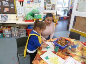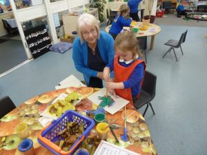 Whilst the leaves were falling, we invited our grown ups to join us at school. There were lots of arty autumn activities to do such as leaf printing, leaf rubbing and making leaf garlands by threading leaves using a needle made out of a stick!