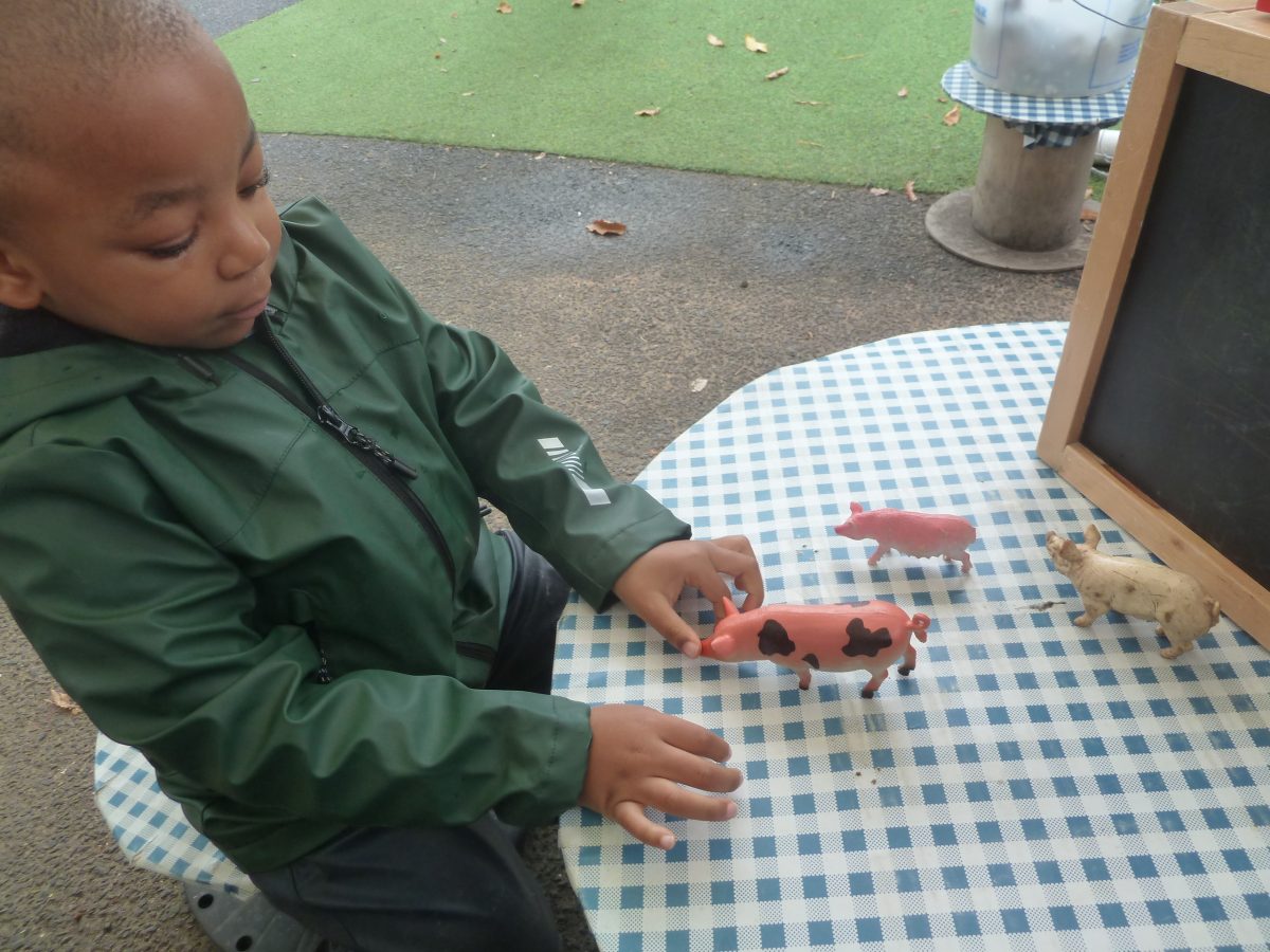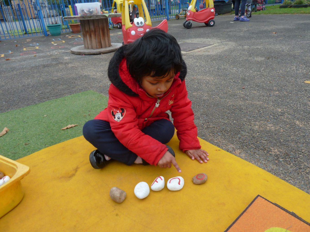 We have been experiencing counting as we play. We find opportunities to count inside and out, with specific maths resources, natural objects or with our normal toys. Repeating the number names in our play makes early maths easily accessible and part of the fun!