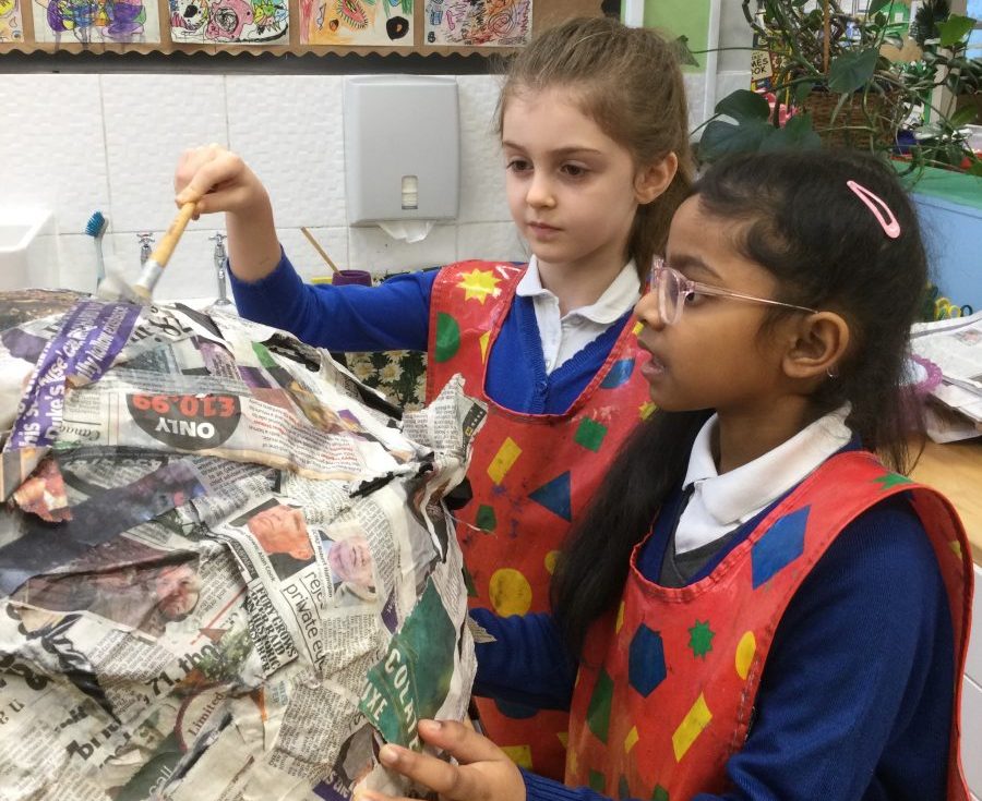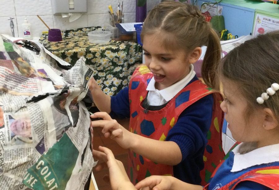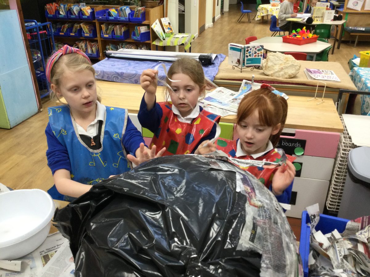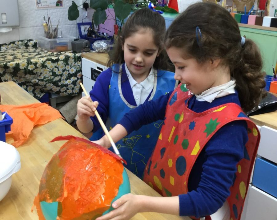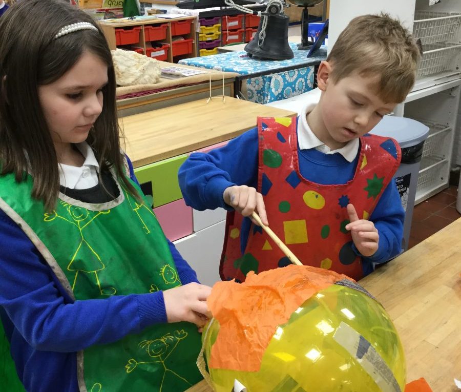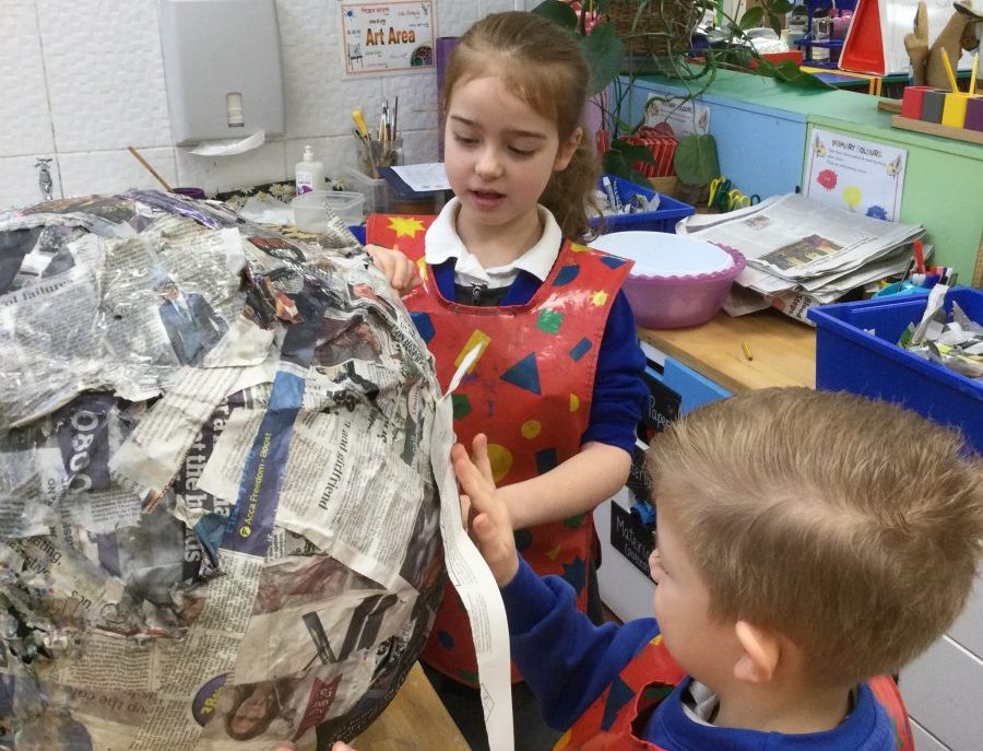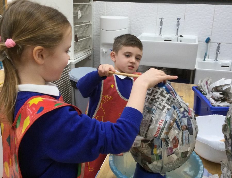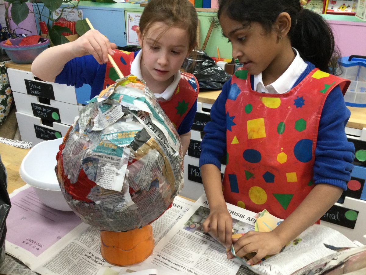 Having explored how the planets orbit the sun, the children in Year 2 co-operated as a year group, using the technique of papier mache to create their own Solar System.