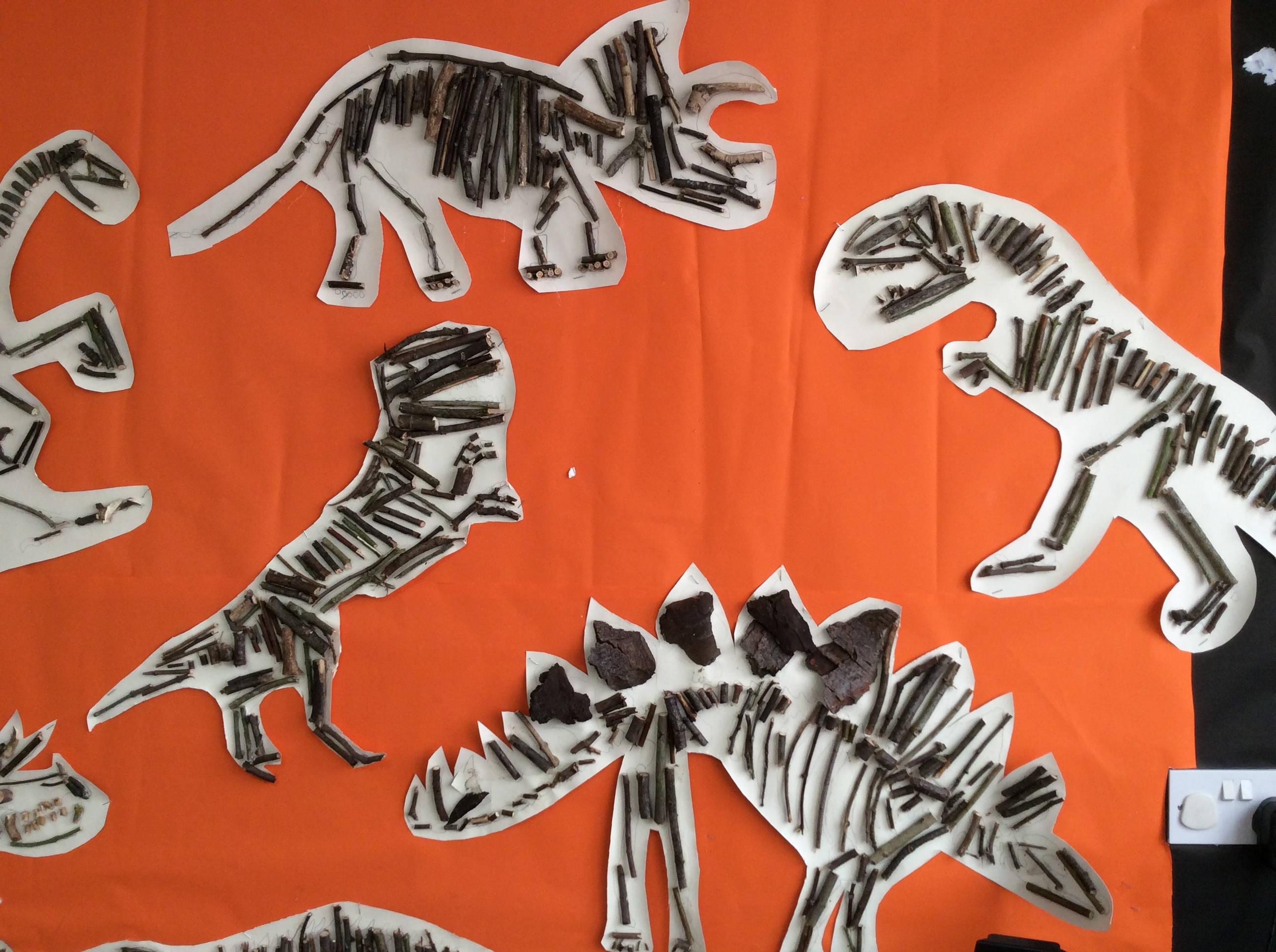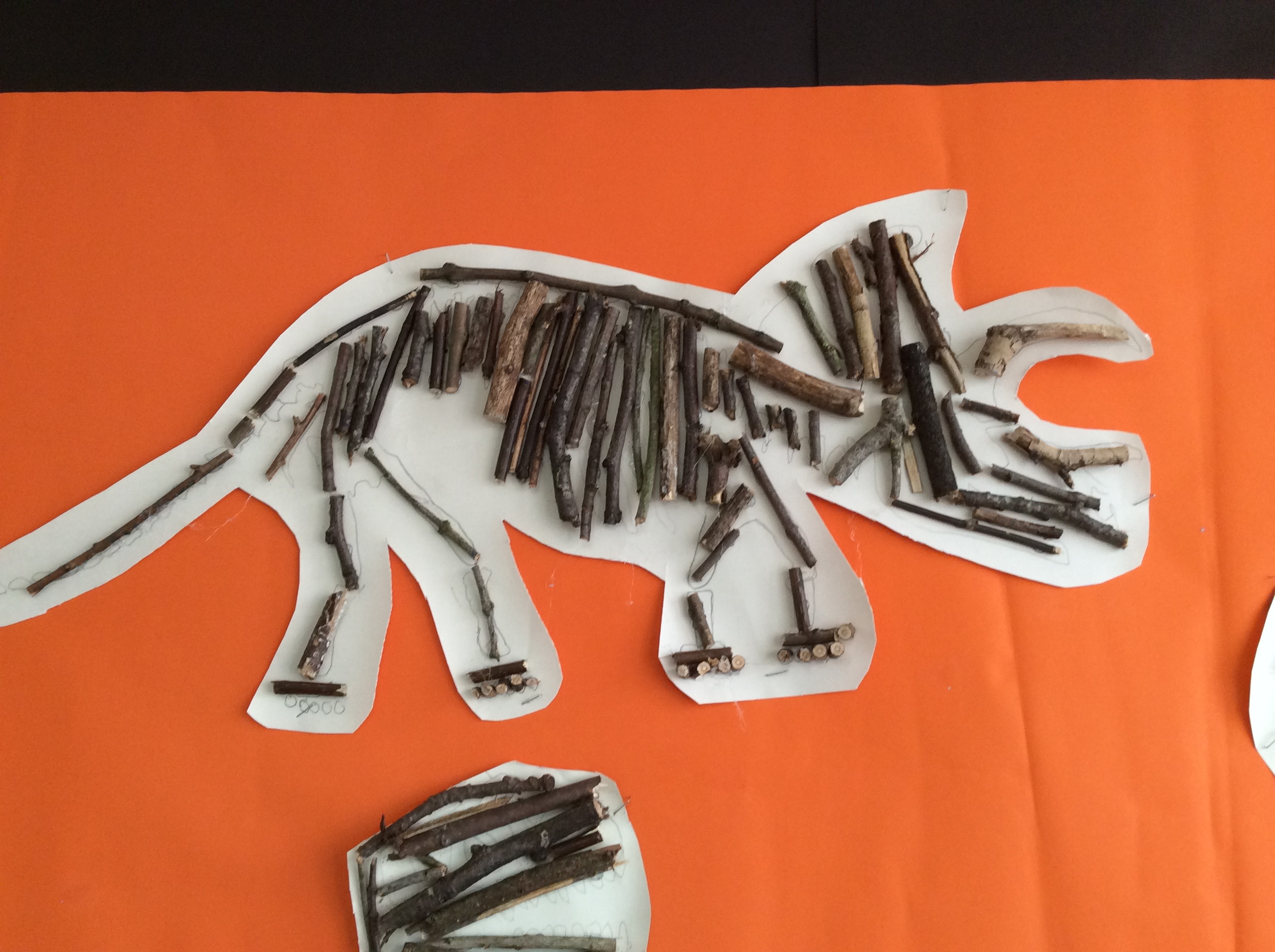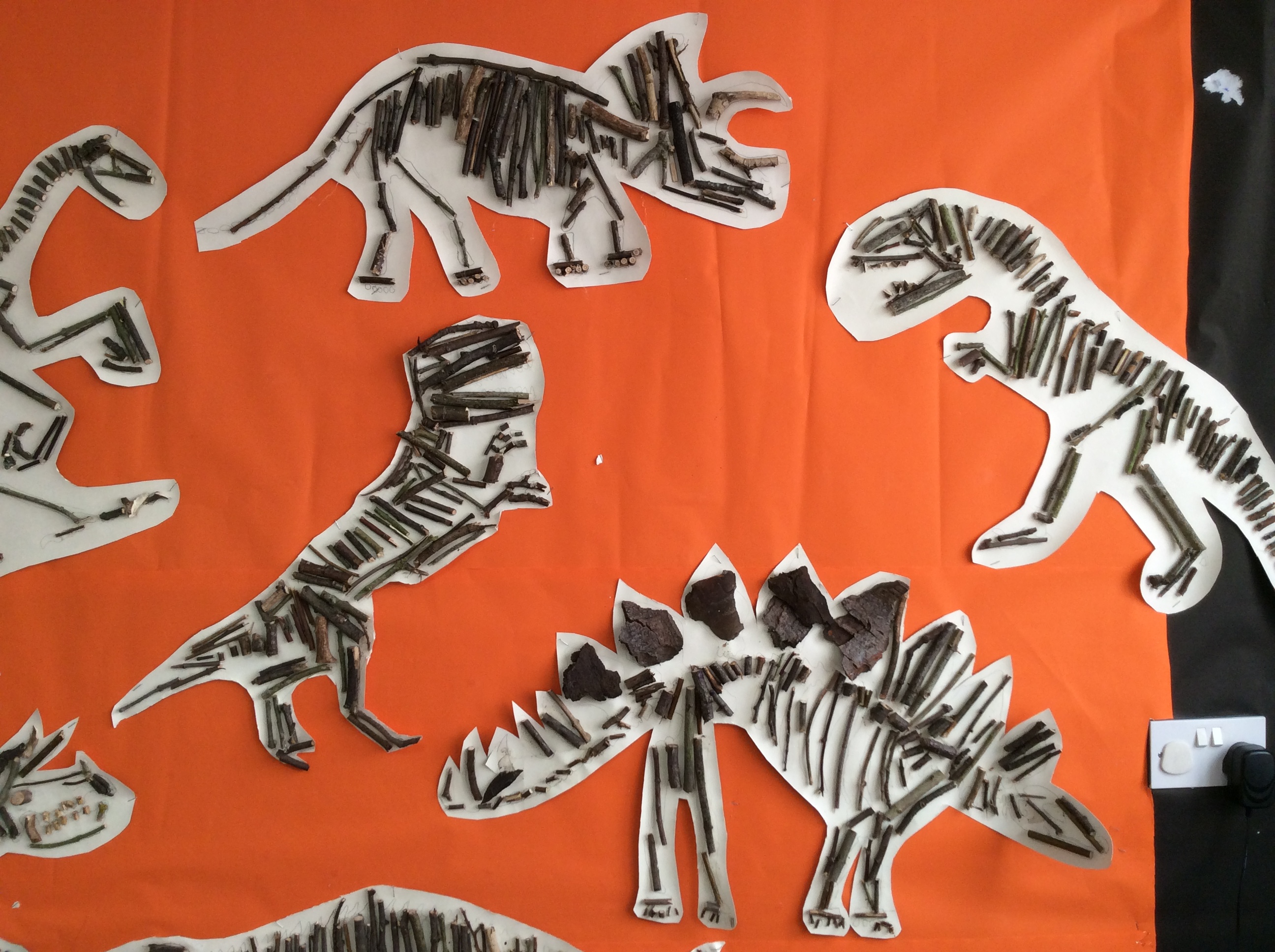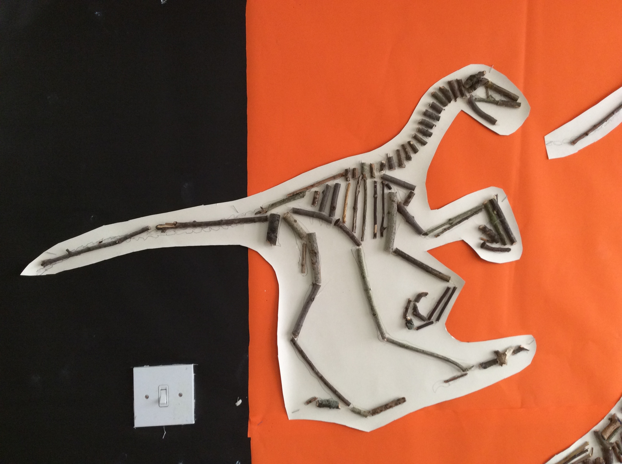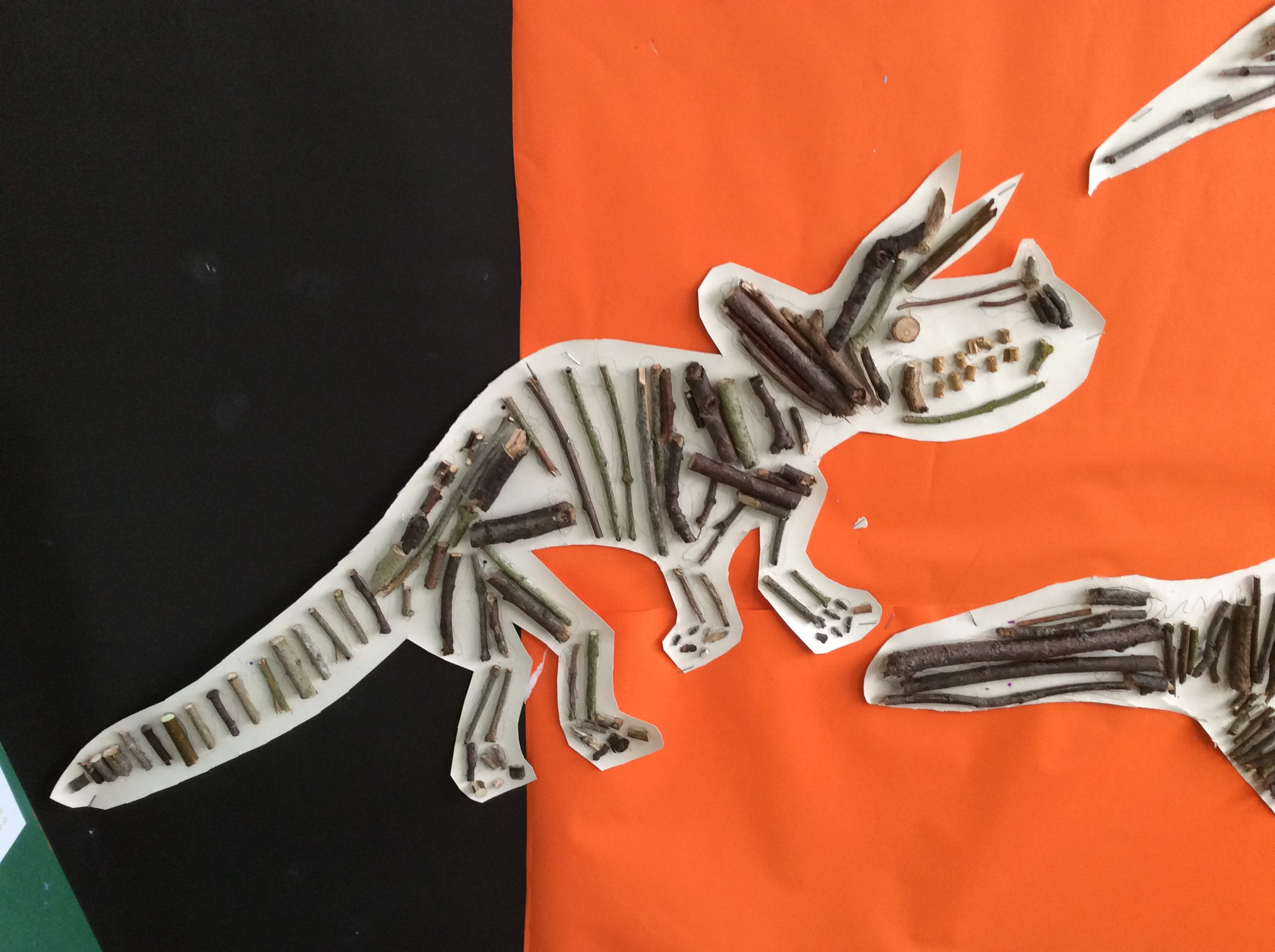 Year 2 have created dinosaur skeletons using sticks they collected from the outside area. First they used a projector to display an image of a dinosaur skeleton on the wall, then they carefully traced over it. Next they measured a bone in cm from the drawing they had created. They marked that measurement on a stick. Friends and Family joined them in school to learn the new skill of sawing. With support from adults, the children used the new skill of sawing to make their stick the correct length to match the bone. Finally it was placed on the dinosaur. The artwork speaks for itself. Measuring in this way helps the children to understand how to use and apply measuring. Rather than measuring a line on a piece of paper they are having conversations about how best to measure a twig that may not be completely straight. The artwork is great to look at and is a subliminal reminder in the learning environment of measuring and the purpose of it. Working in this way leads to deeper learning that stays with the child – and it’s fun!