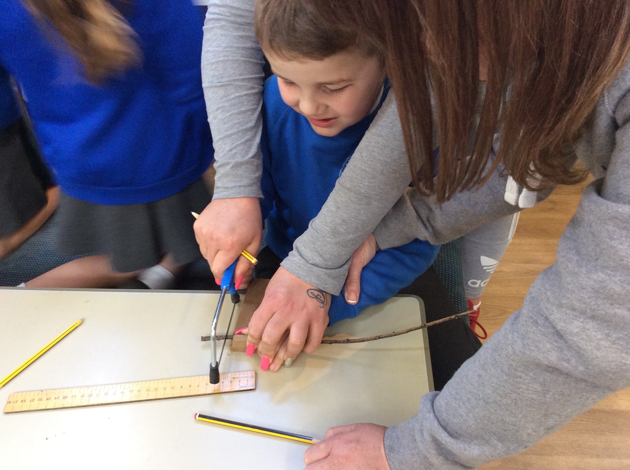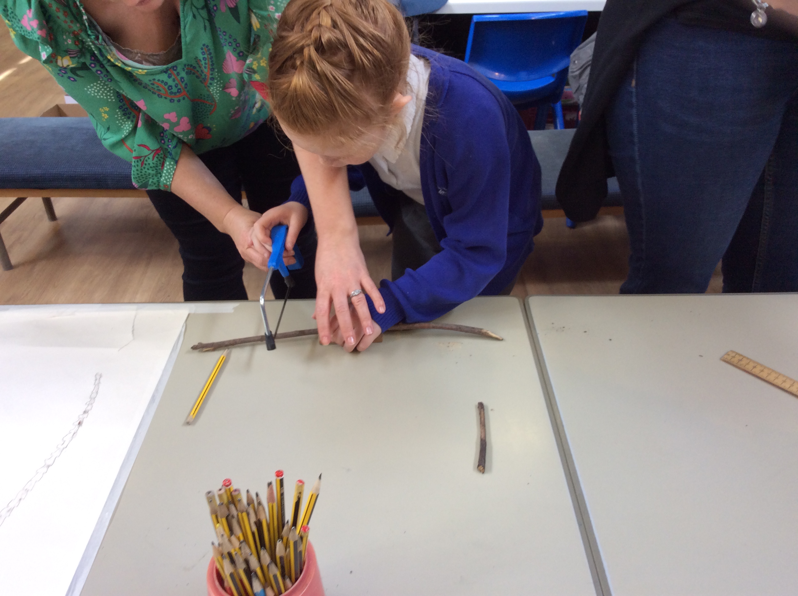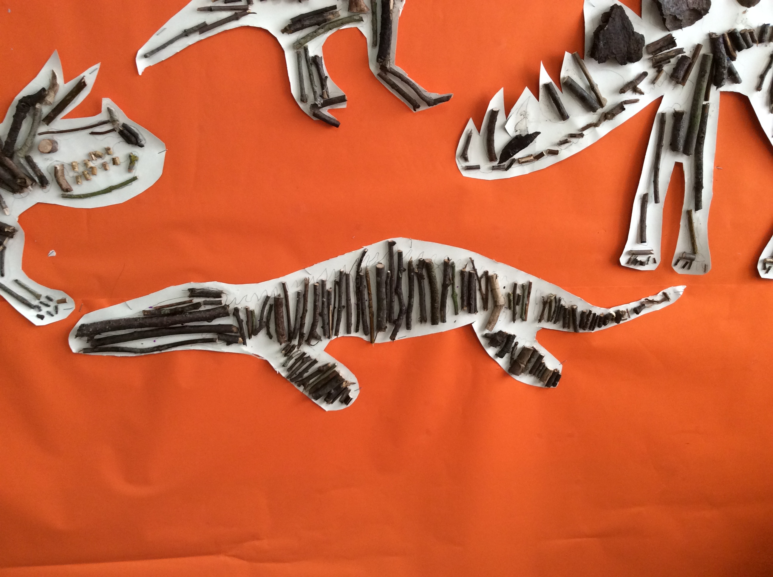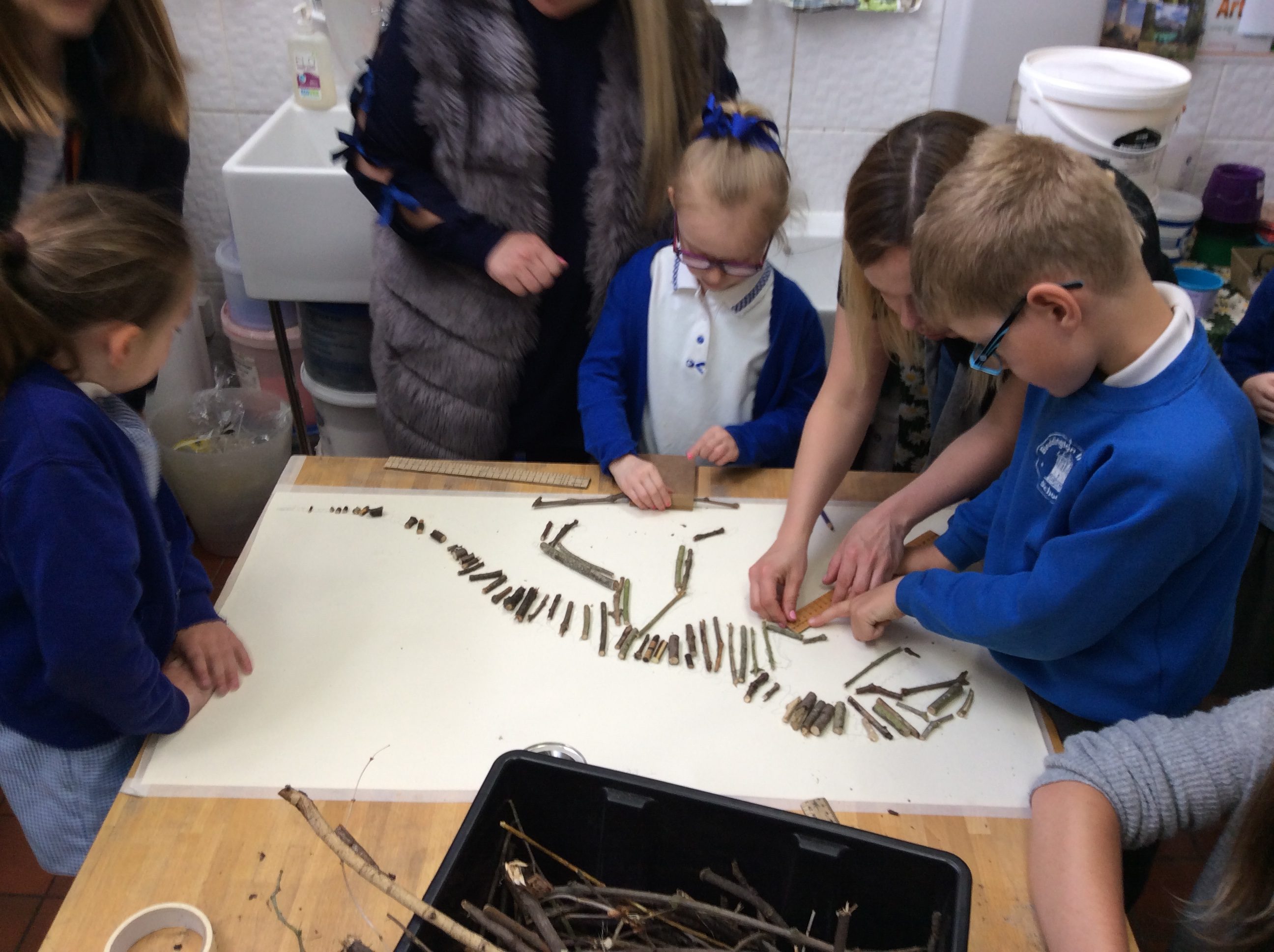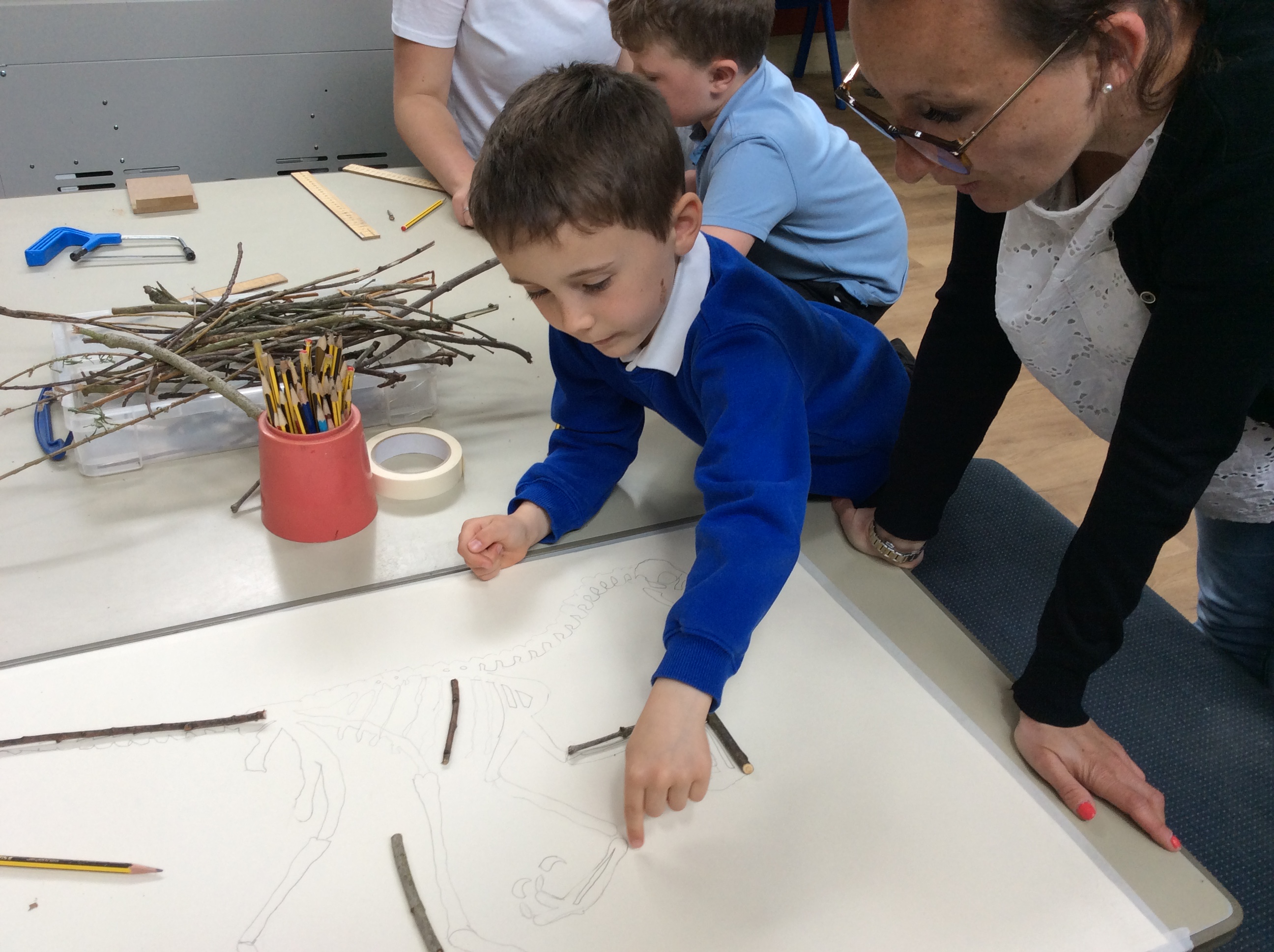 Year 2 have created dinosaur skeletons using sticks they collected from the outside area. First they used a projector to display an image of a dinosaur skeleton on the wall, then they carefully traced over it. Next they measured a bone in cm from the drawing they had created. They marked that measurement on a stick. Friends and Family joined them in school to learn the new skill of sawing. With support from adults, the children used the new skill of sawing to make their stick the correct length to match the bone. Finally it was placed on the dinosaur. The artwork speaks for itself. Measuring in this way helps the children to understand how to use and apply measuring. Rather than measuring a line on a piece of paper they are having conversations about how best to measure a twig that may not be completely straight. The artwork is great to look at and is a subliminal reminder in the learning environment of measuring and the purpose of it. Working in this way leads to deeper learning that stays with the child – and it’s fun!