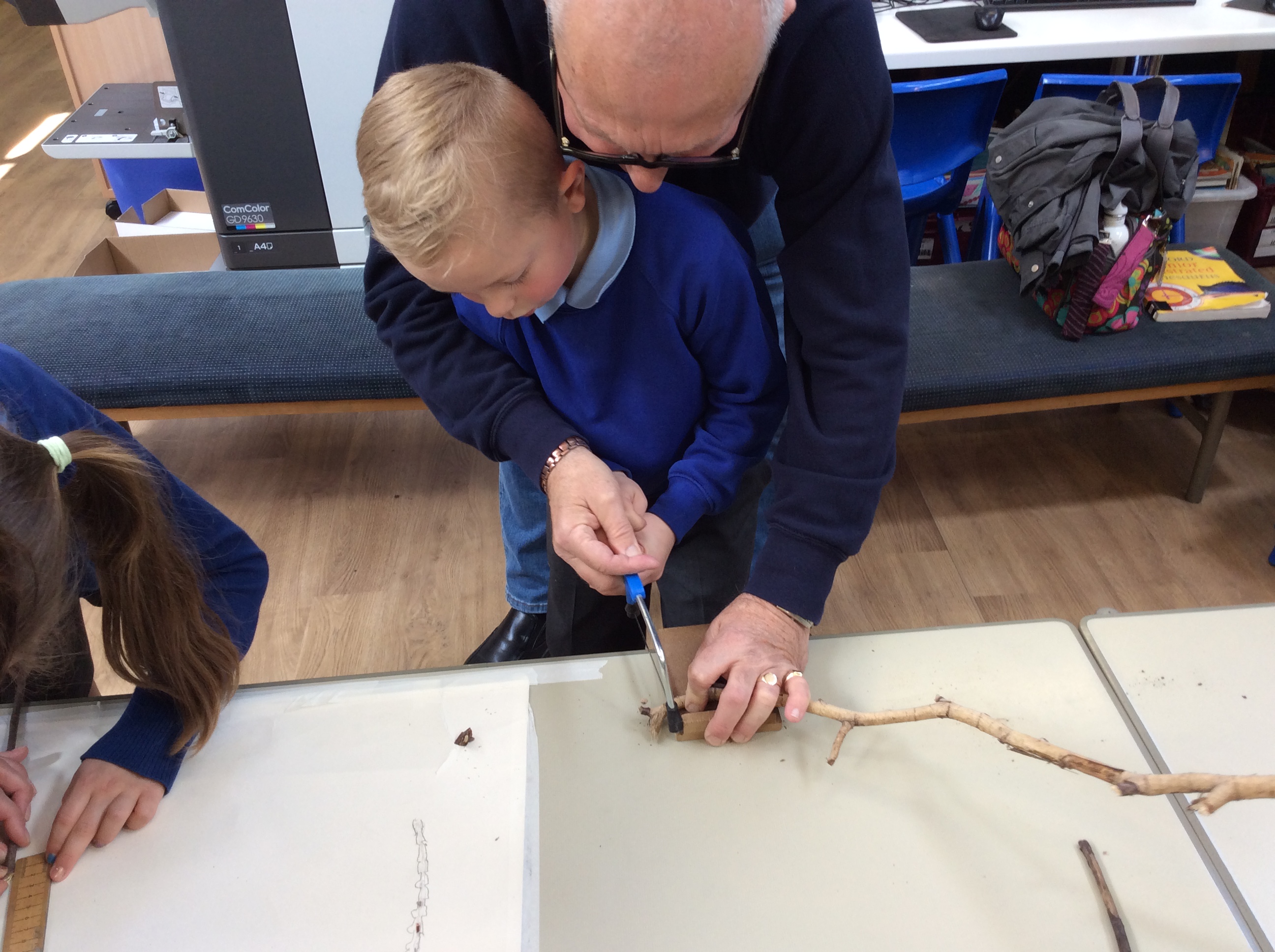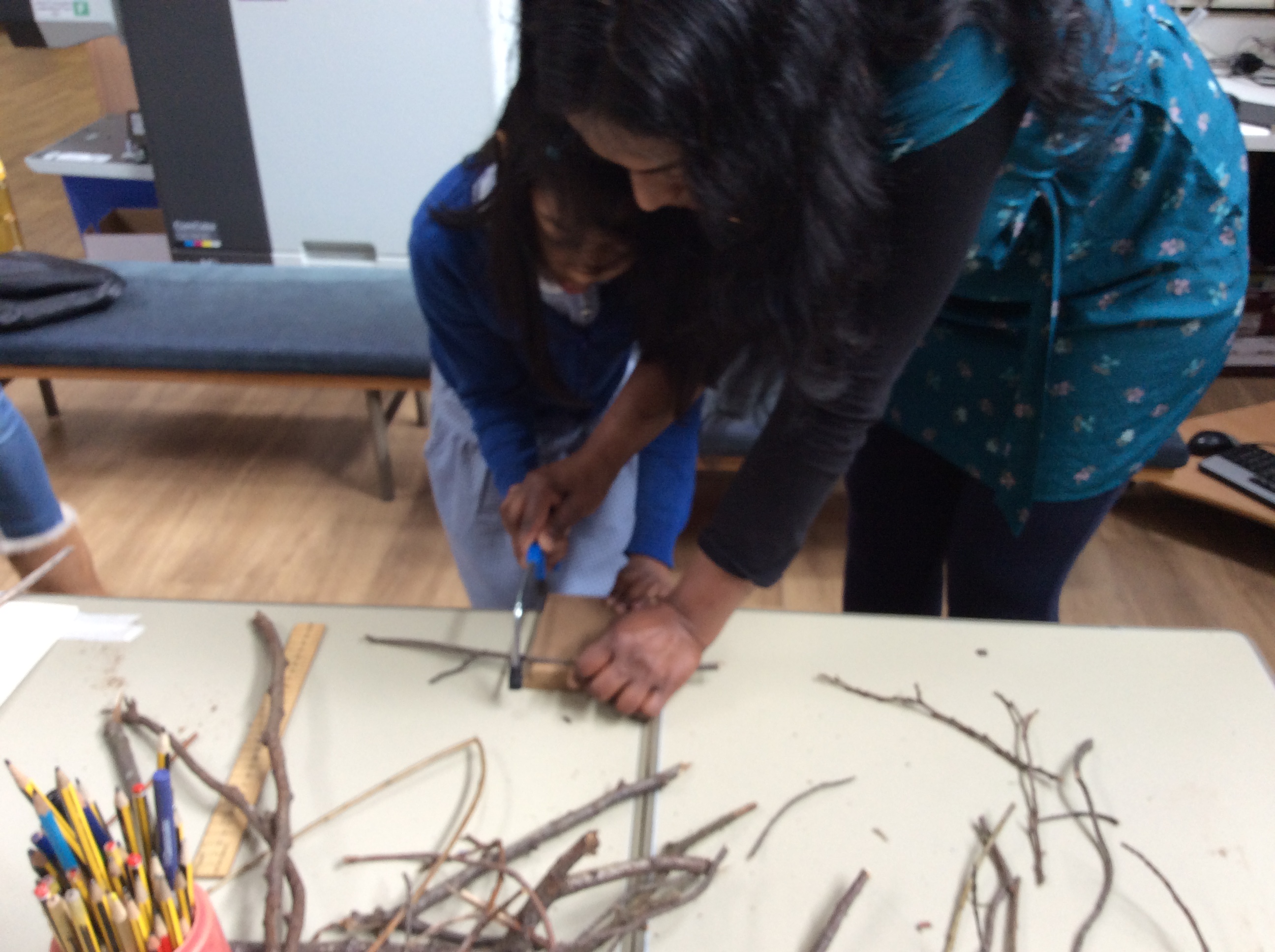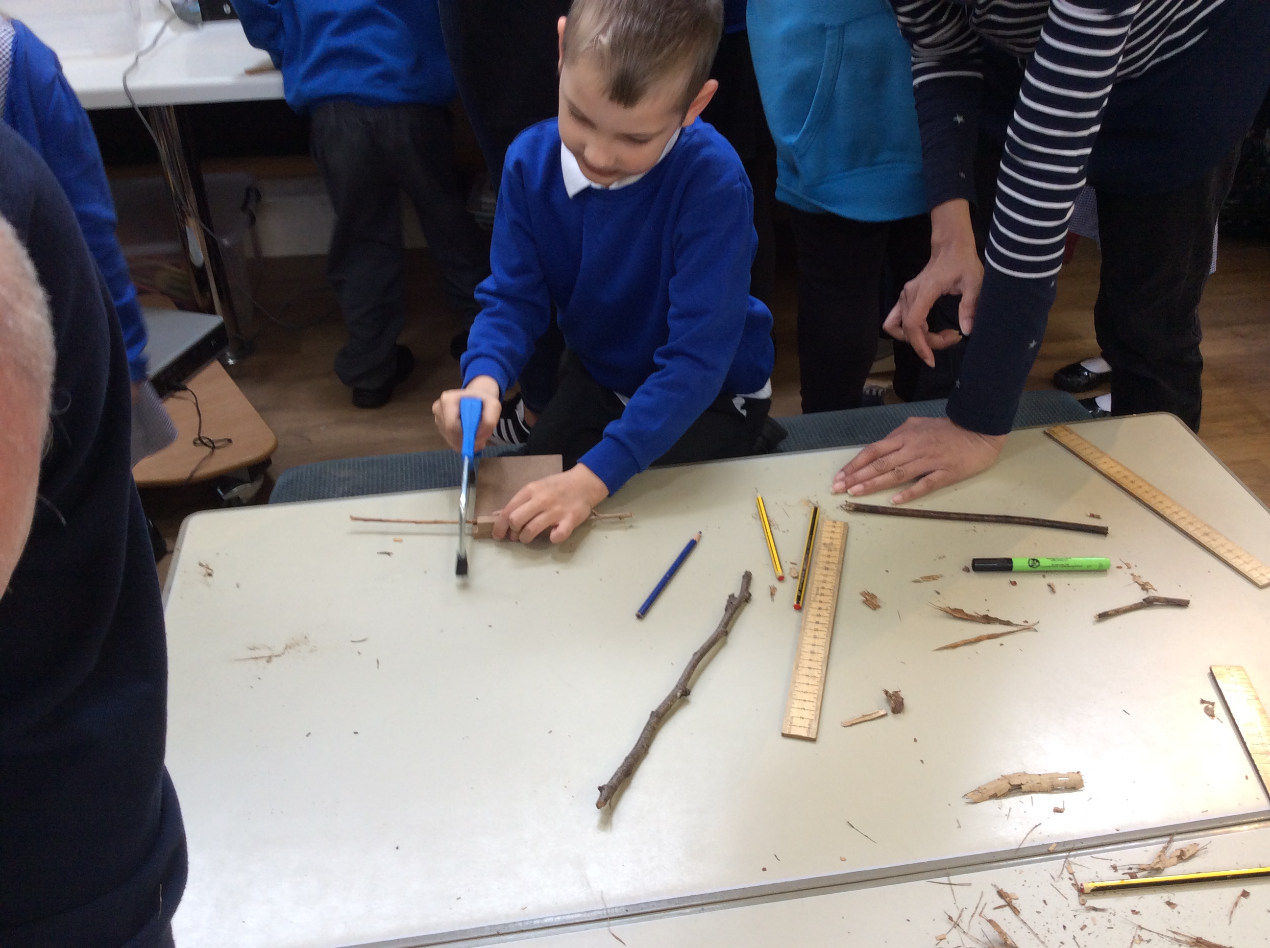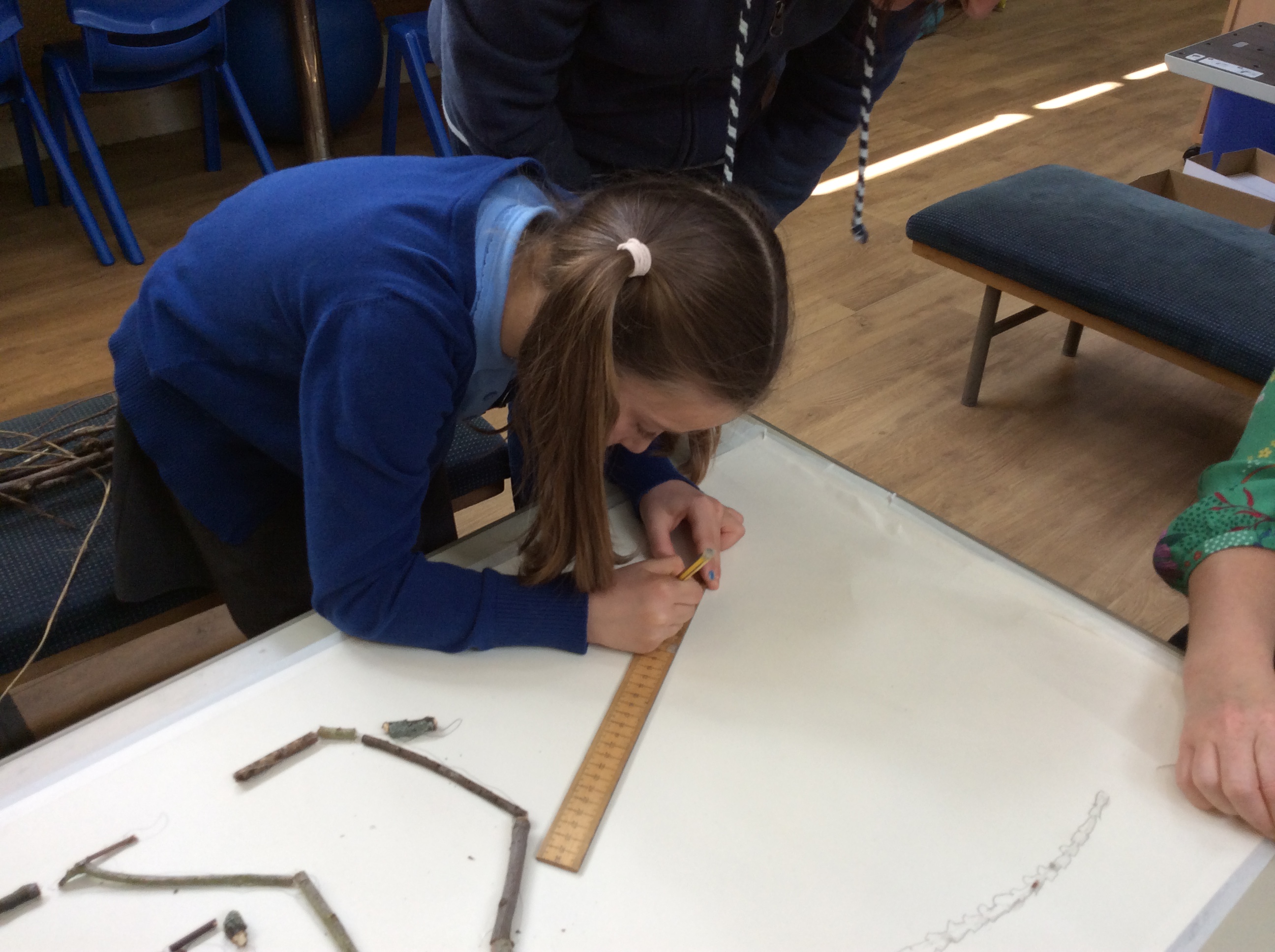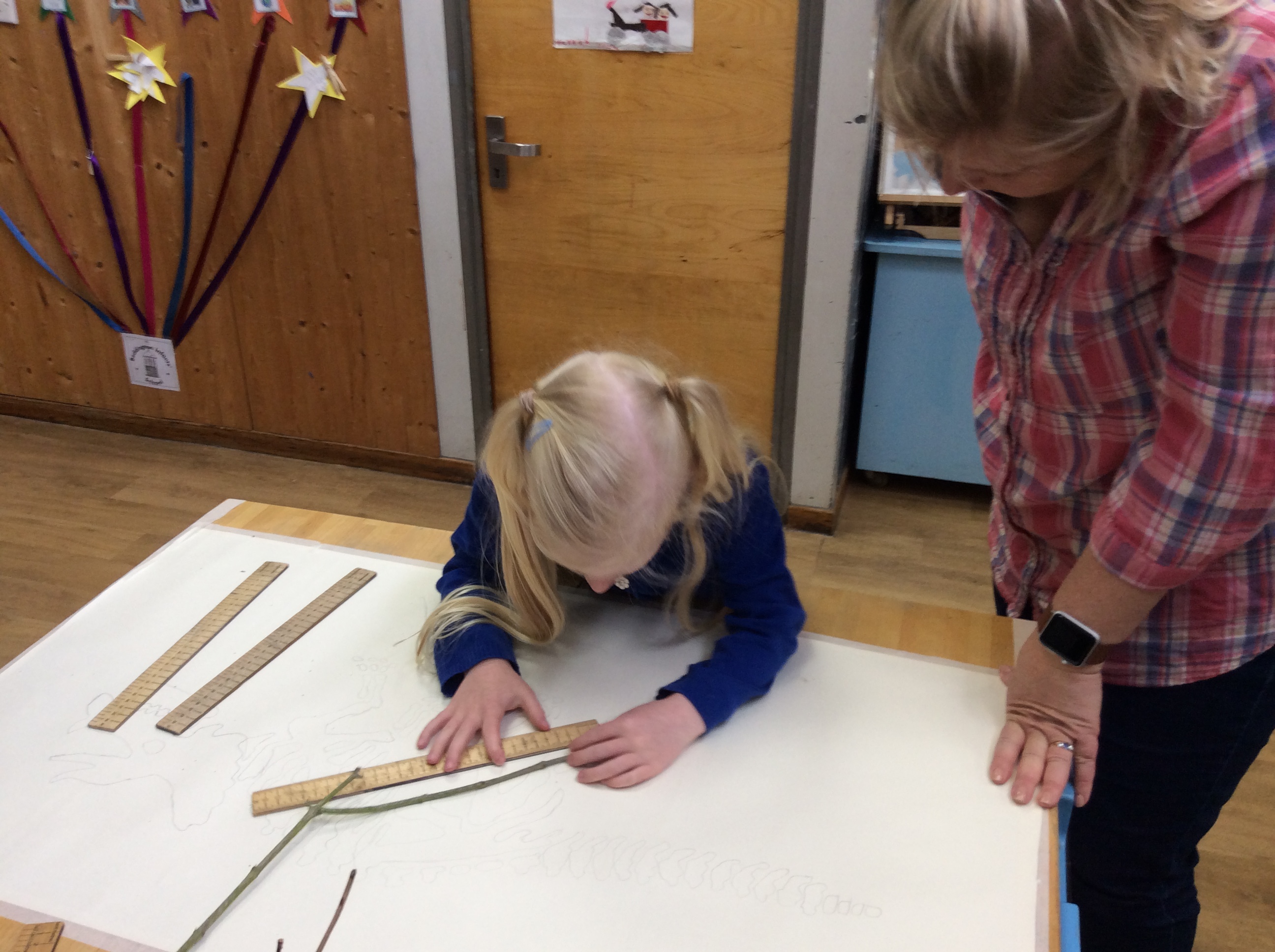 Year 2 have created dinosaur skeletons using sticks they collected from the outside area. First they used a projector to display an image of a dinosaur skeleton on the wall, then they carefully traced over it. Next they measured a bone in cm from the drawing they had created. They marked that measurement on a stick. Friends and Family joined them in school to learn the new skill of sawing. With support from adults, the children used the new skill of sawing to make their stick the correct length to match the bone. Finally it was placed on the dinosaur. The artwork speaks for itself. Measuring in this way helps the children to understand how to use and apply measuring. Rather than measuring a line on a piece of paper they are having conversations about how best to measure a twig that may not be completely straight. The artwork is great to look at and is a subliminal reminder in the learning environment of measuring and the purpose of it. Working in this way leads to deeper learning that stays with the child – and it’s fun!