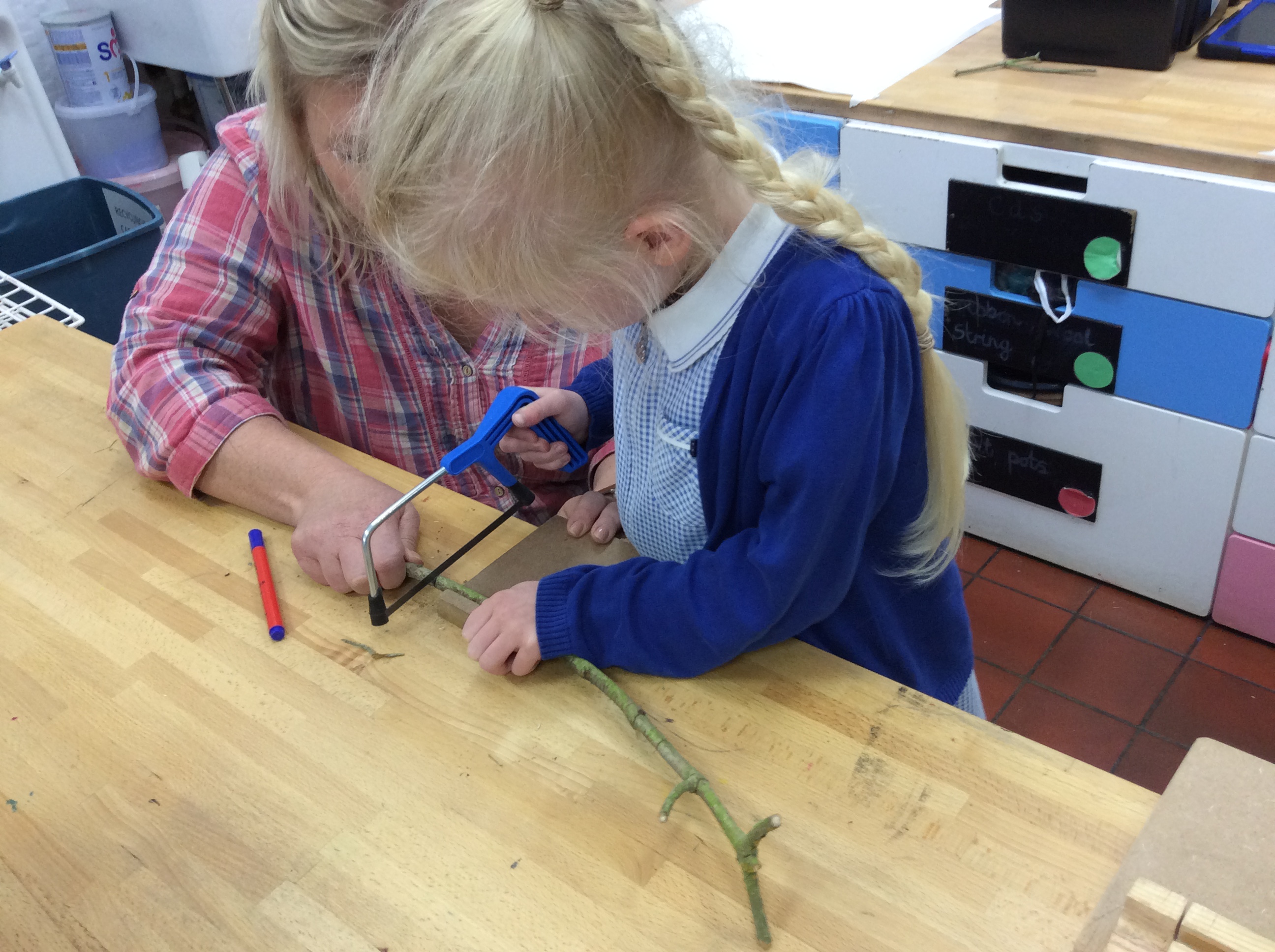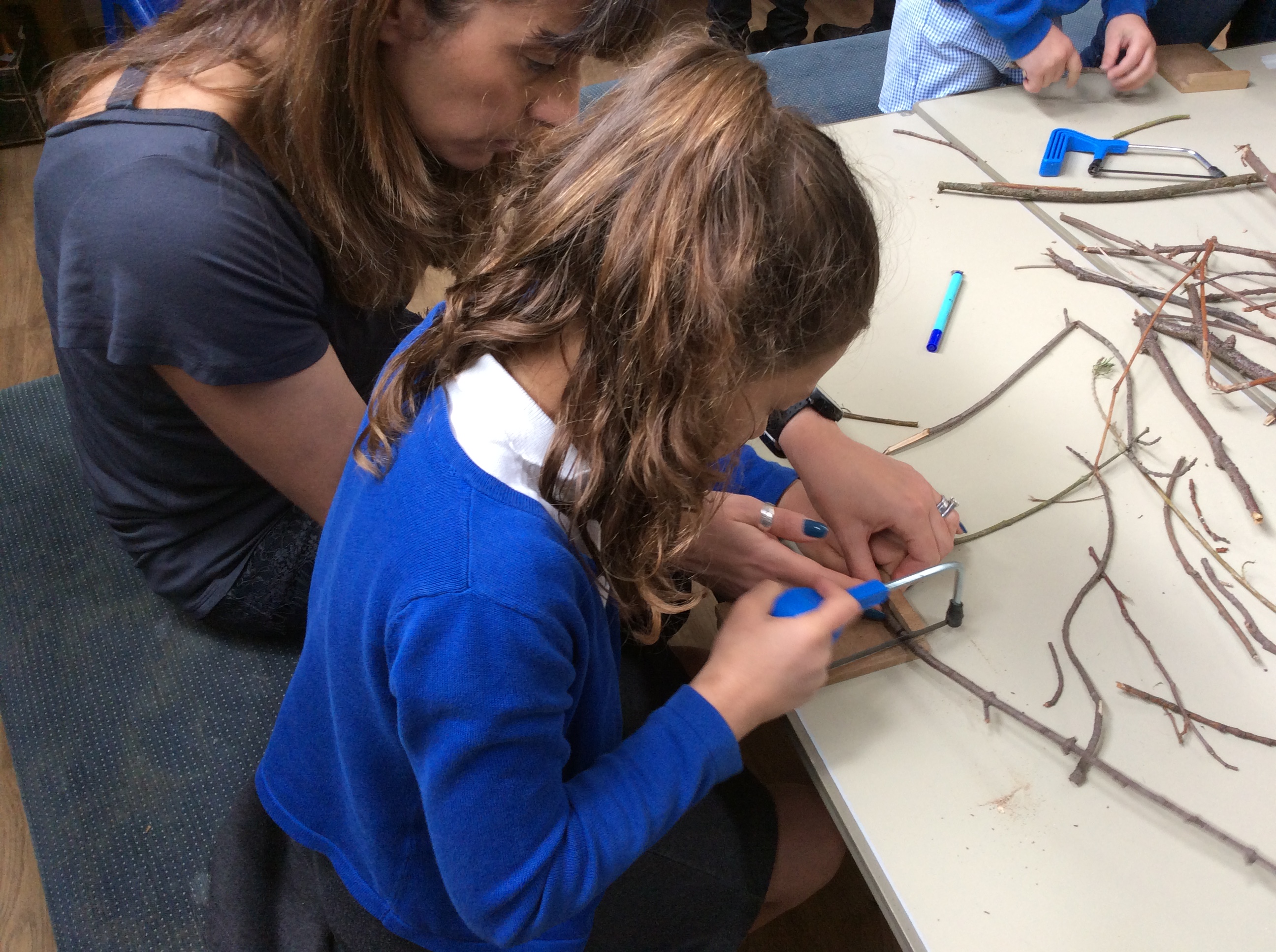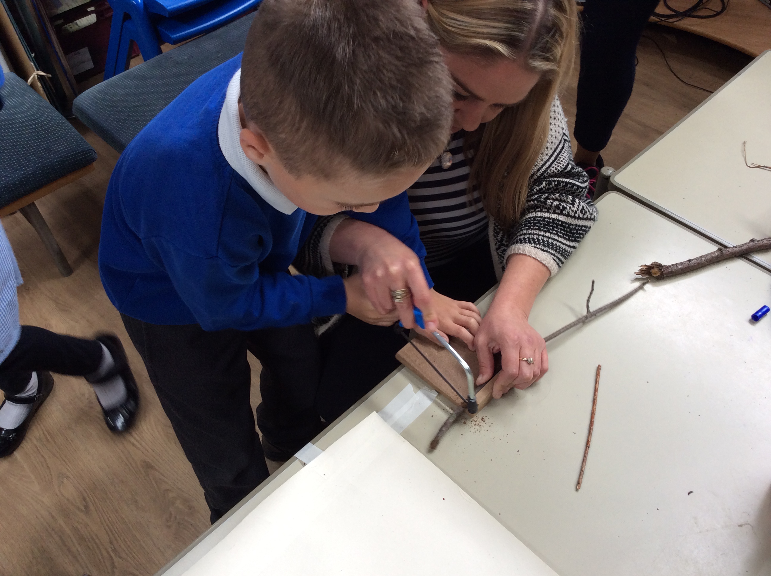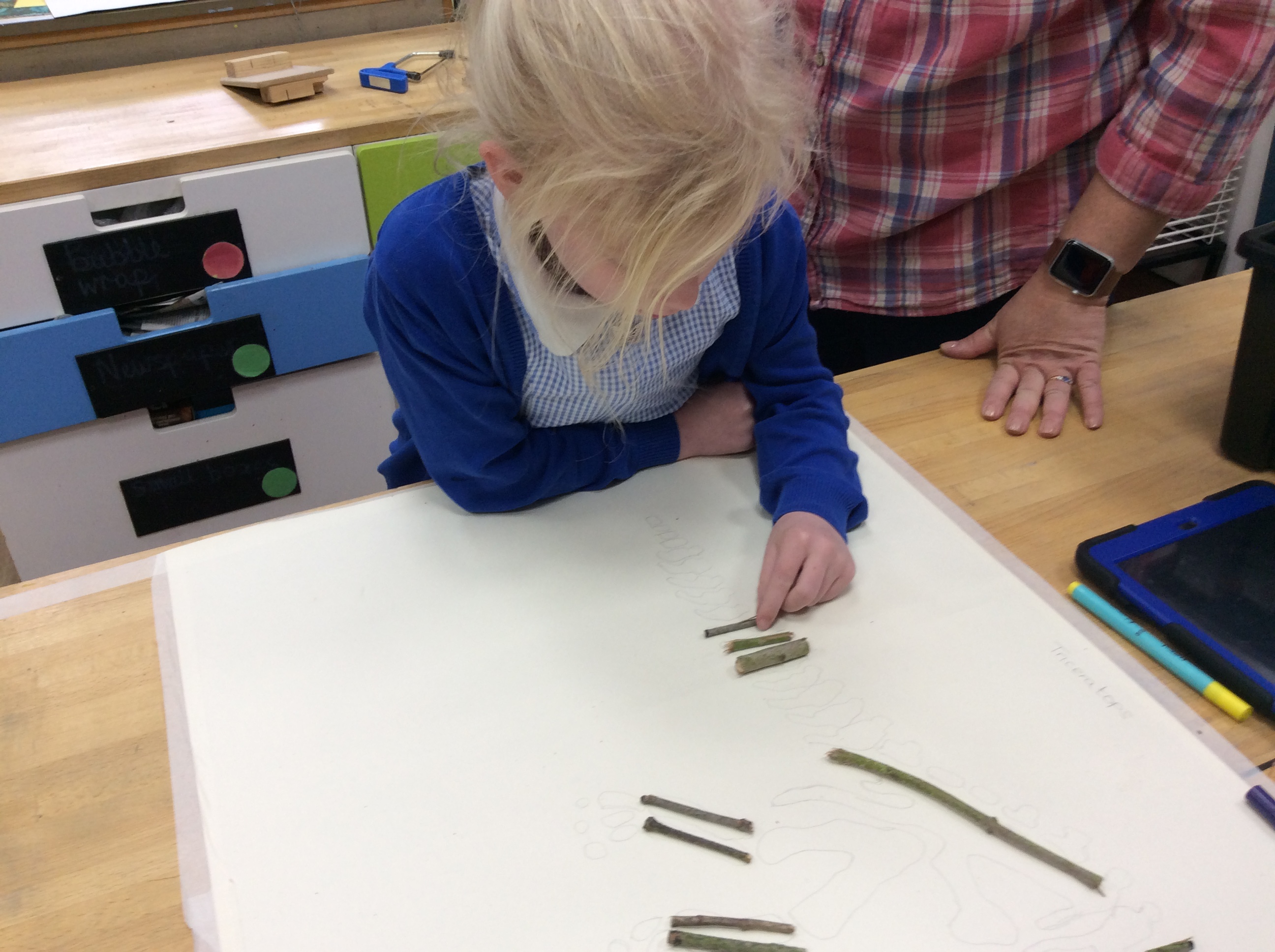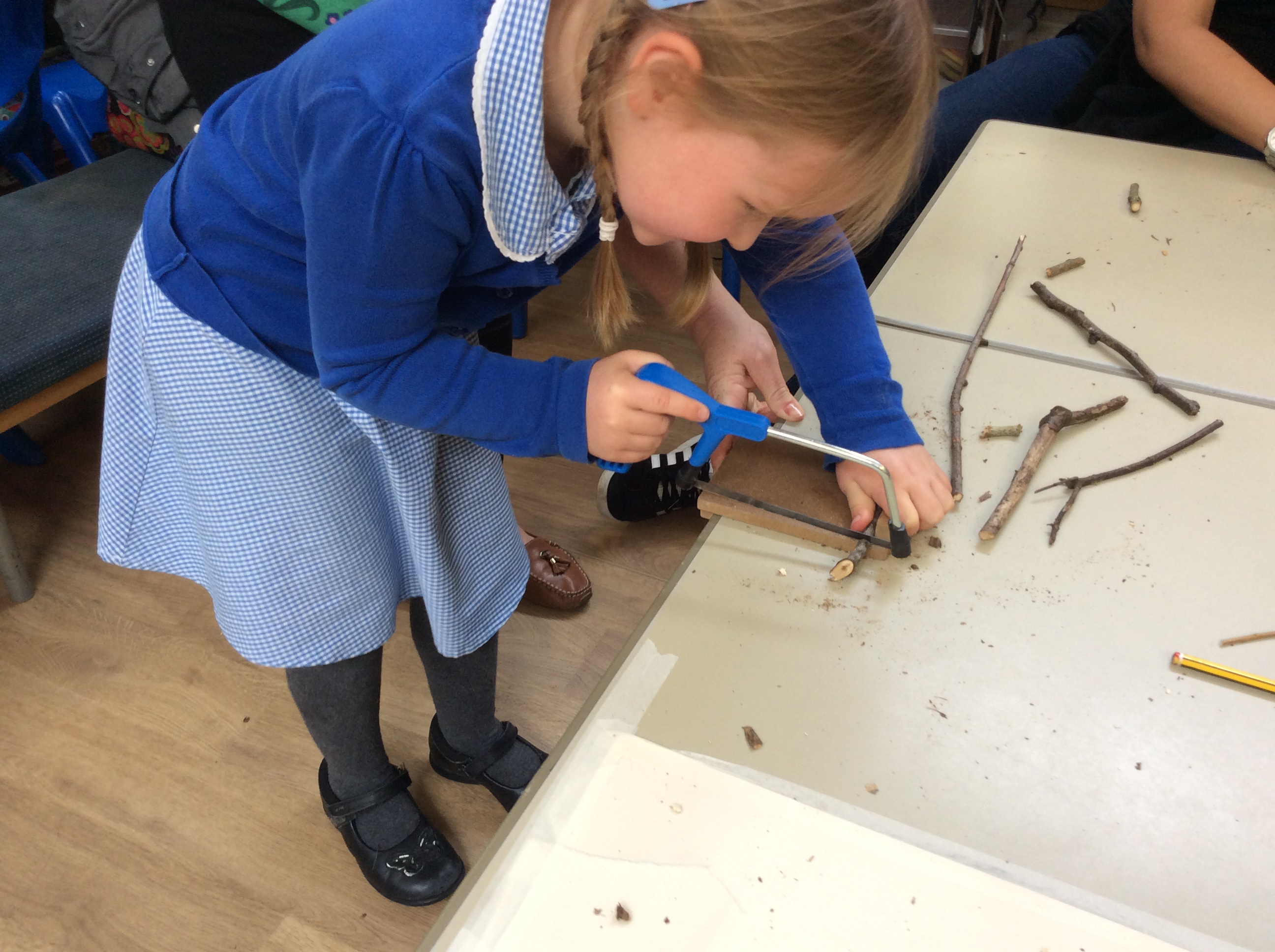 Year 2 have created dinosaur skeletons using sticks they collected from the outside area. First they used a projector to display an image of a dinosaur skeleton on the wall, then they carefully traced over it. Next they measured a bone in cm from the drawing they had created. They marked that measurement on a stick. Friends and Family joined them in school to learn the new skill of sawing. With support from adults, the children used the new skill of sawing to make their stick the correct length to match the bone. Finally it was placed on the dinosaur. The artwork speaks for itself. Measuring in this way helps the children to understand how to use and apply measuring. Rather than measuring a line on a piece of paper they are having conversations about how best to measure a twig that may not be completely straight. The artwork is great to look at and is a subliminal reminder in the learning environment of measuring and the purpose of it. Working in this way leads to deeper learning that stays with the child – and it’s fun!