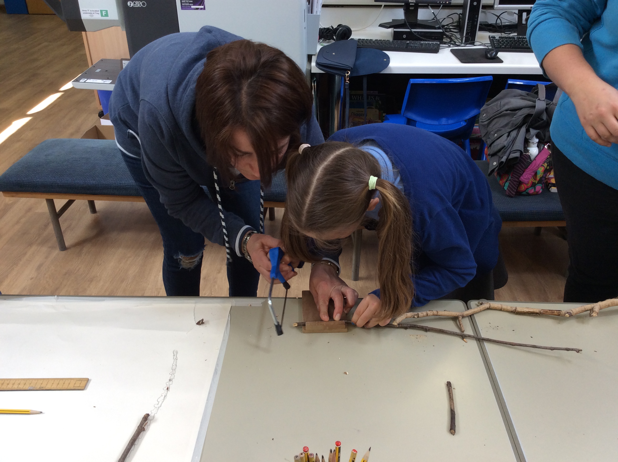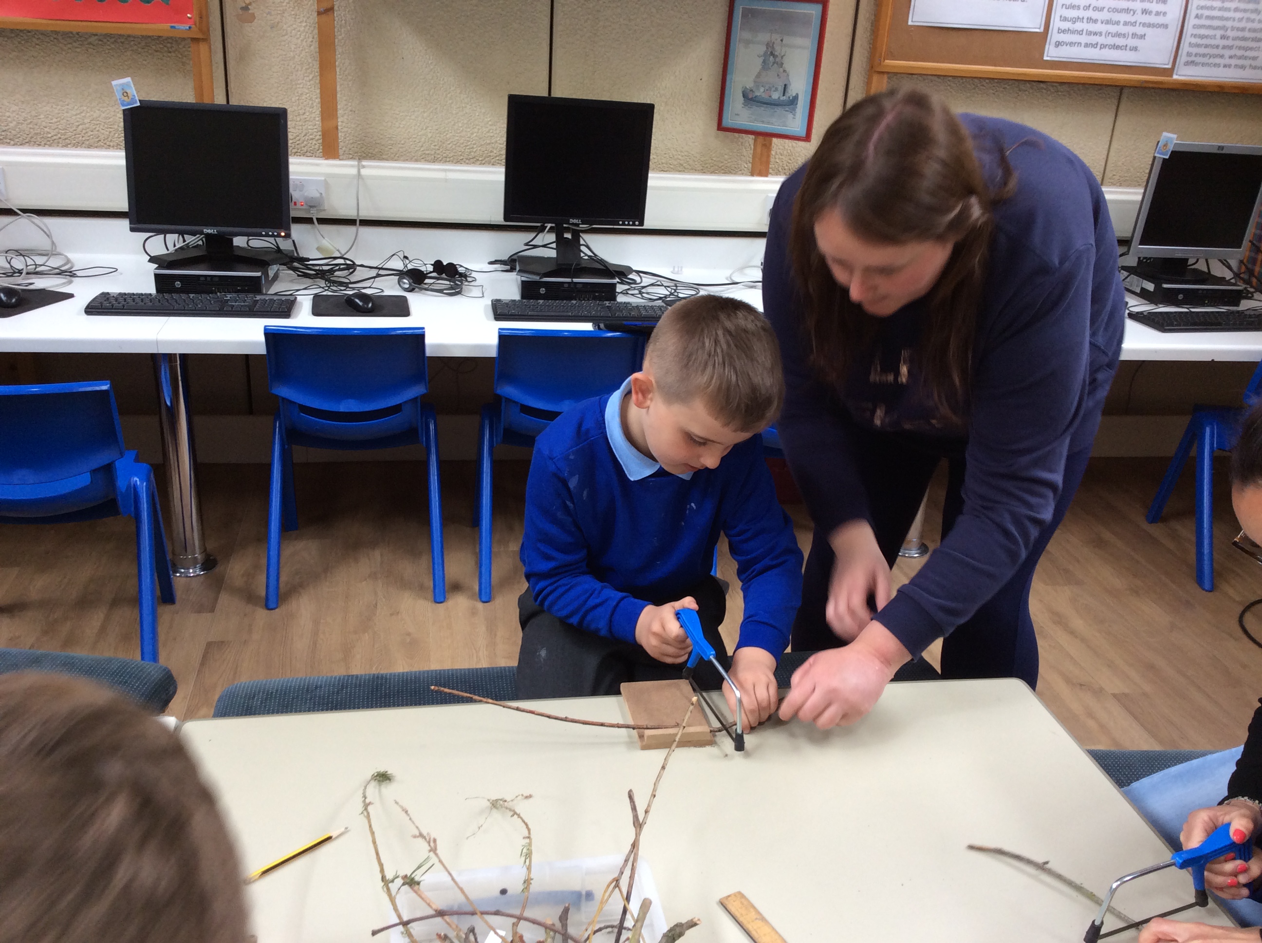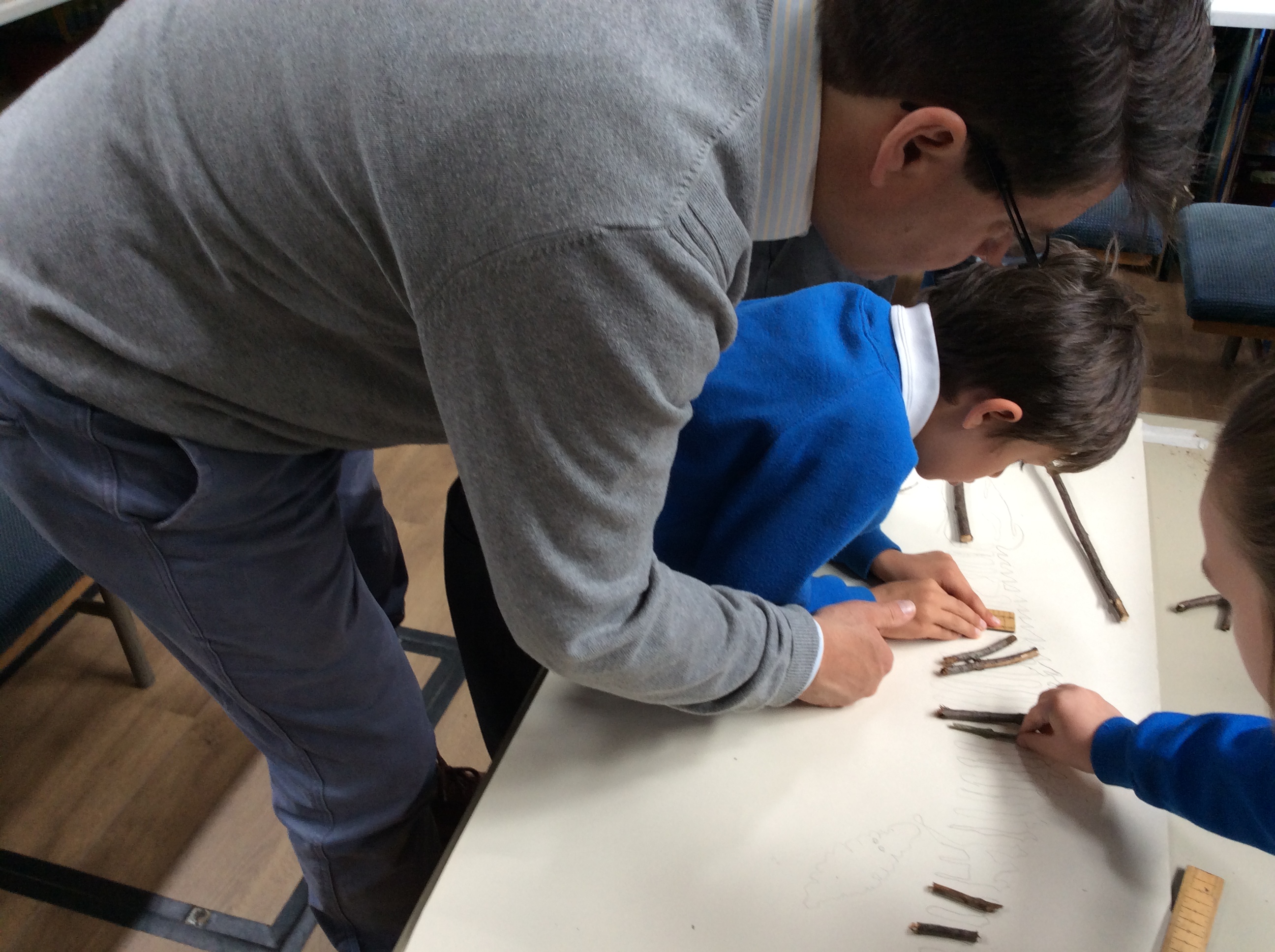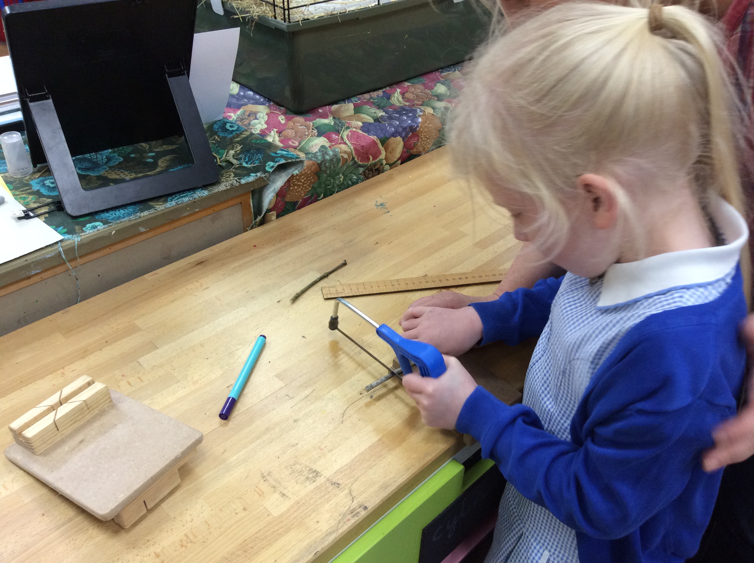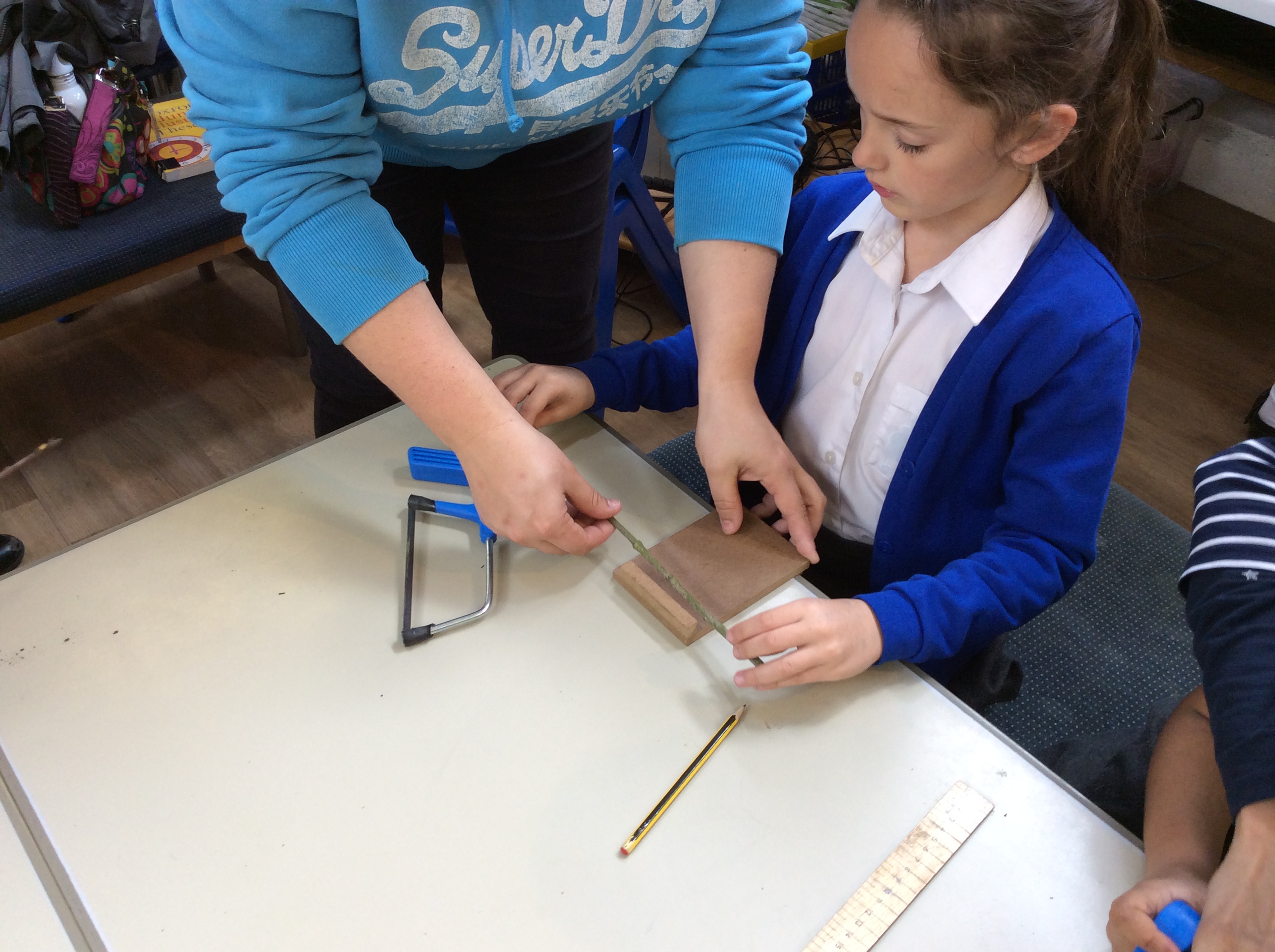 Year 2 have created dinosaur skeletons using sticks they collected from the outside area. First they used a projector to display an image of a dinosaur skeleton on the wall, then they carefully traced over it. Next they measured a bone in cm from the drawing they had created. They marked that measurement on a stick. Friends and Family joined them in school to learn the new skill of sawing. With support from adults, the children used the new skill of sawing to make their stick the correct length to match the bone. Finally it was placed on the dinosaur. The artwork speaks for itself. Measuring in this way helps the children to understand how to use and apply measuring. Rather than measuring a line on a piece of paper they are having conversations about how best to measure a twig that may not be completely straight. The artwork is great to look at and is a subliminal reminder in the learning environment of measuring and the purpose of it. Working in this way leads to deeper learning that stays with the child – and it’s fun!