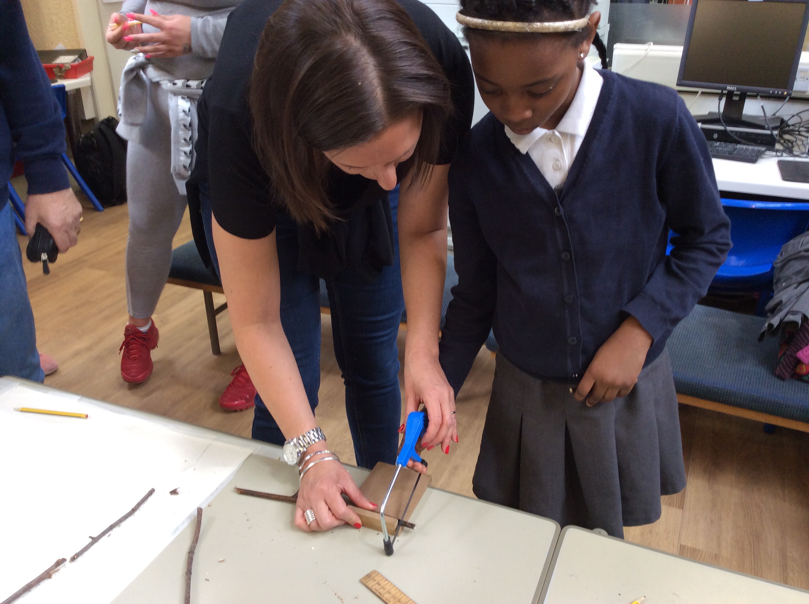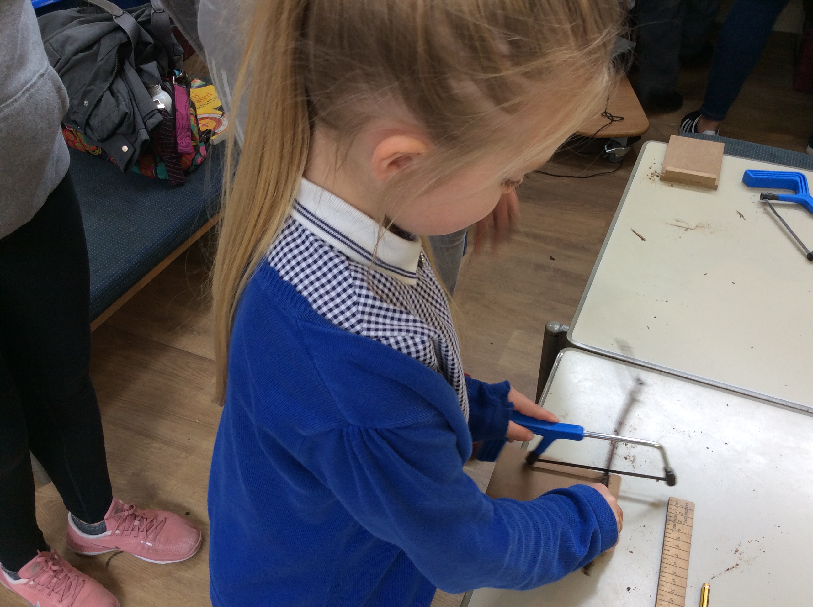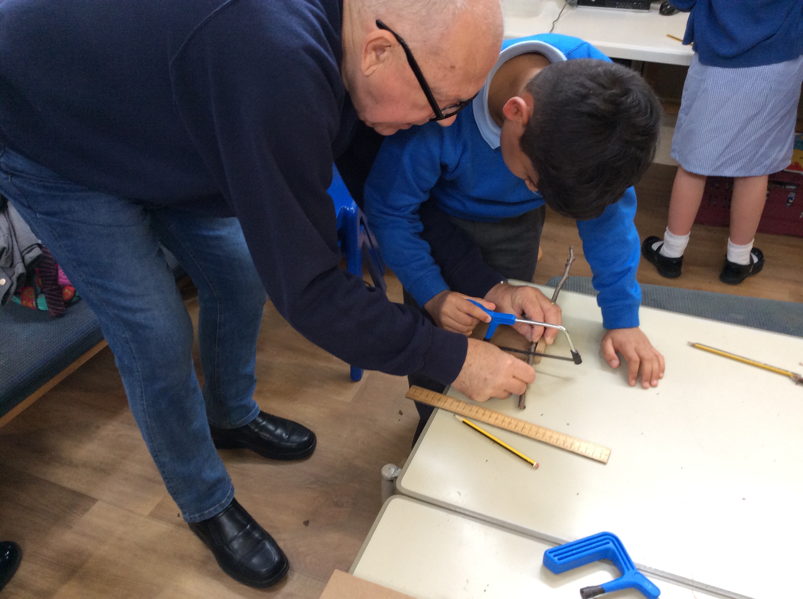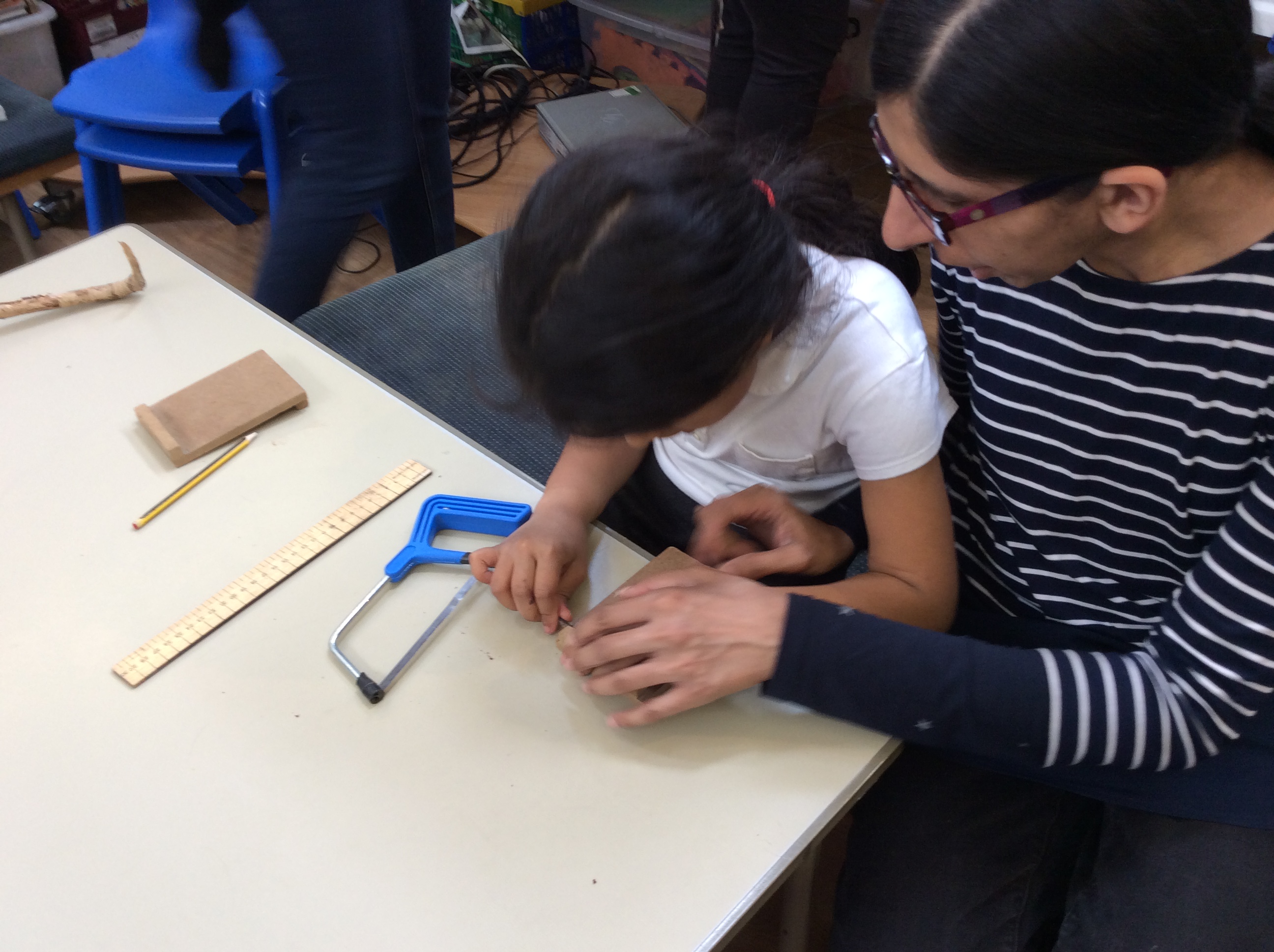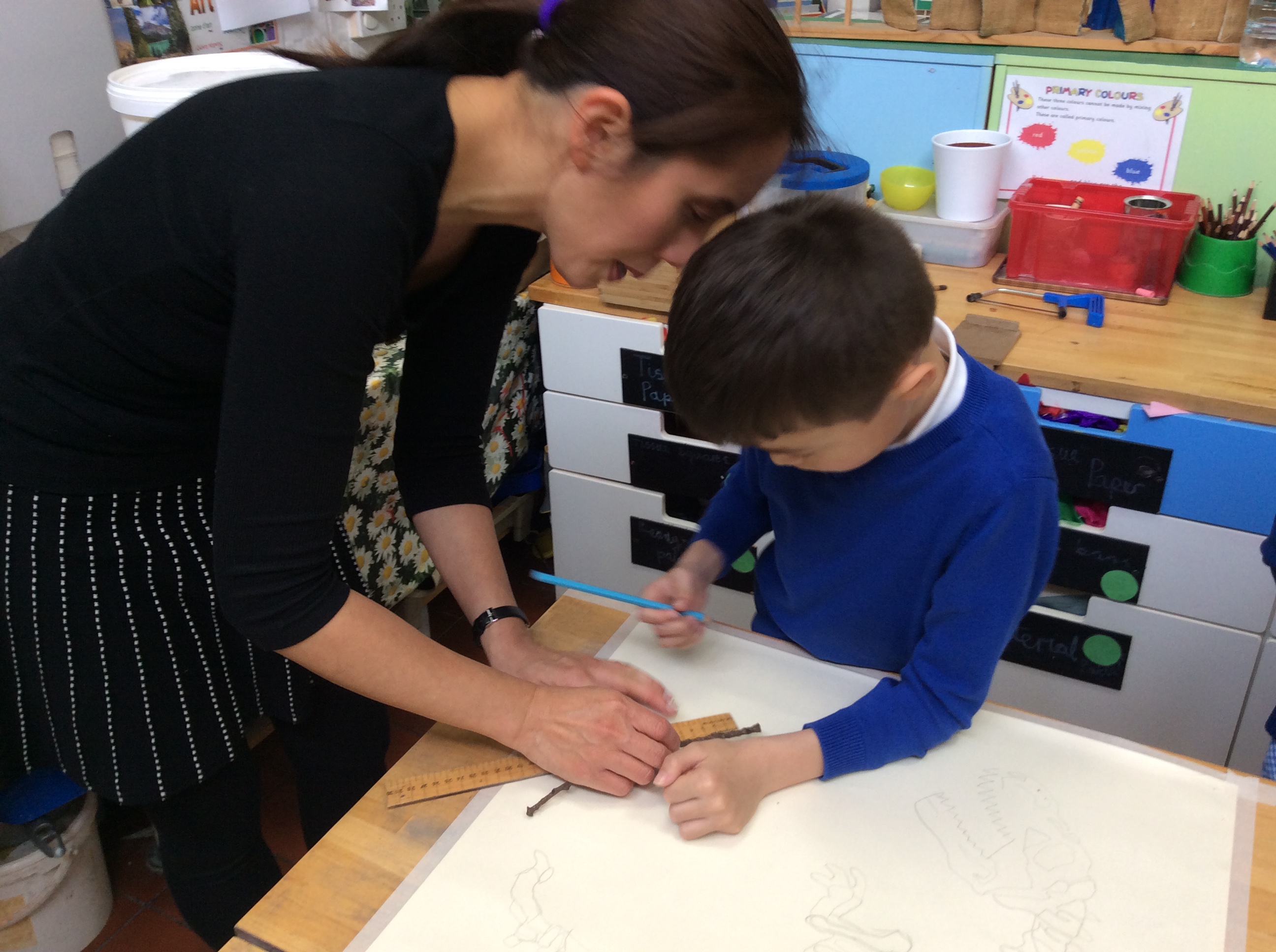 Year 2 have created dinosaur skeletons using sticks they collected from the outside area. First they used a projector to display an image of a dinosaur skeleton on the wall, then they carefully traced over it. Next they measured a bone in cm from the drawing they had created. They marked that measurement on a stick. Friends and Family joined them in school to learn the new skill of sawing. With support from adults, the children used the new skill of sawing to make their stick the correct length to match the bone. Finally it was placed on the dinosaur. The artwork speaks for itself. Measuring in this way helps the children to understand how to use and apply measuring. Rather than measuring a line on a piece of paper they are having conversations about how best to measure a twig that may not be completely straight. The artwork is great to look at and is a subliminal reminder in the learning environment of measuring and the purpose of it. Working in this way leads to deeper learning that stays with the child – and it’s fun!
