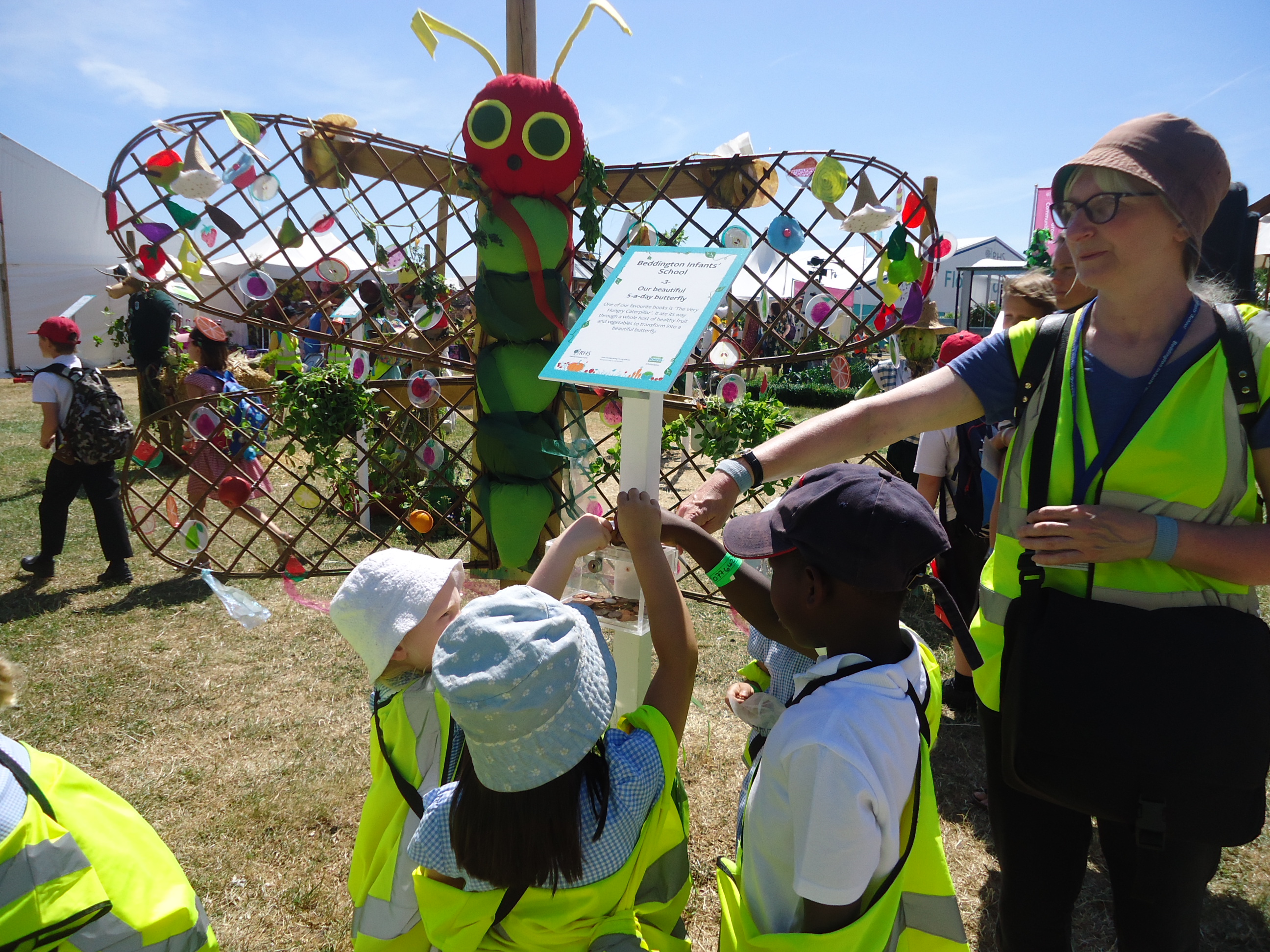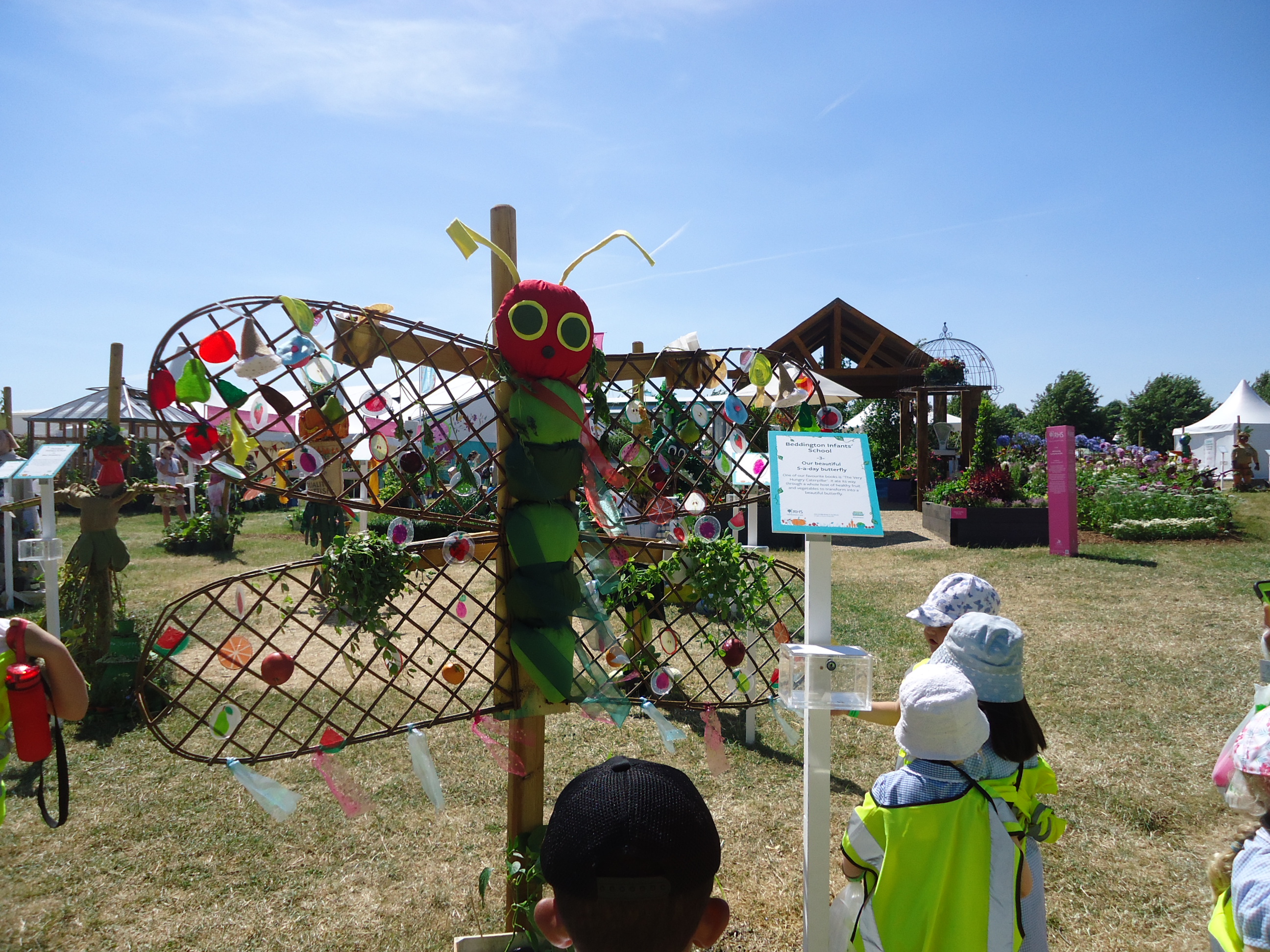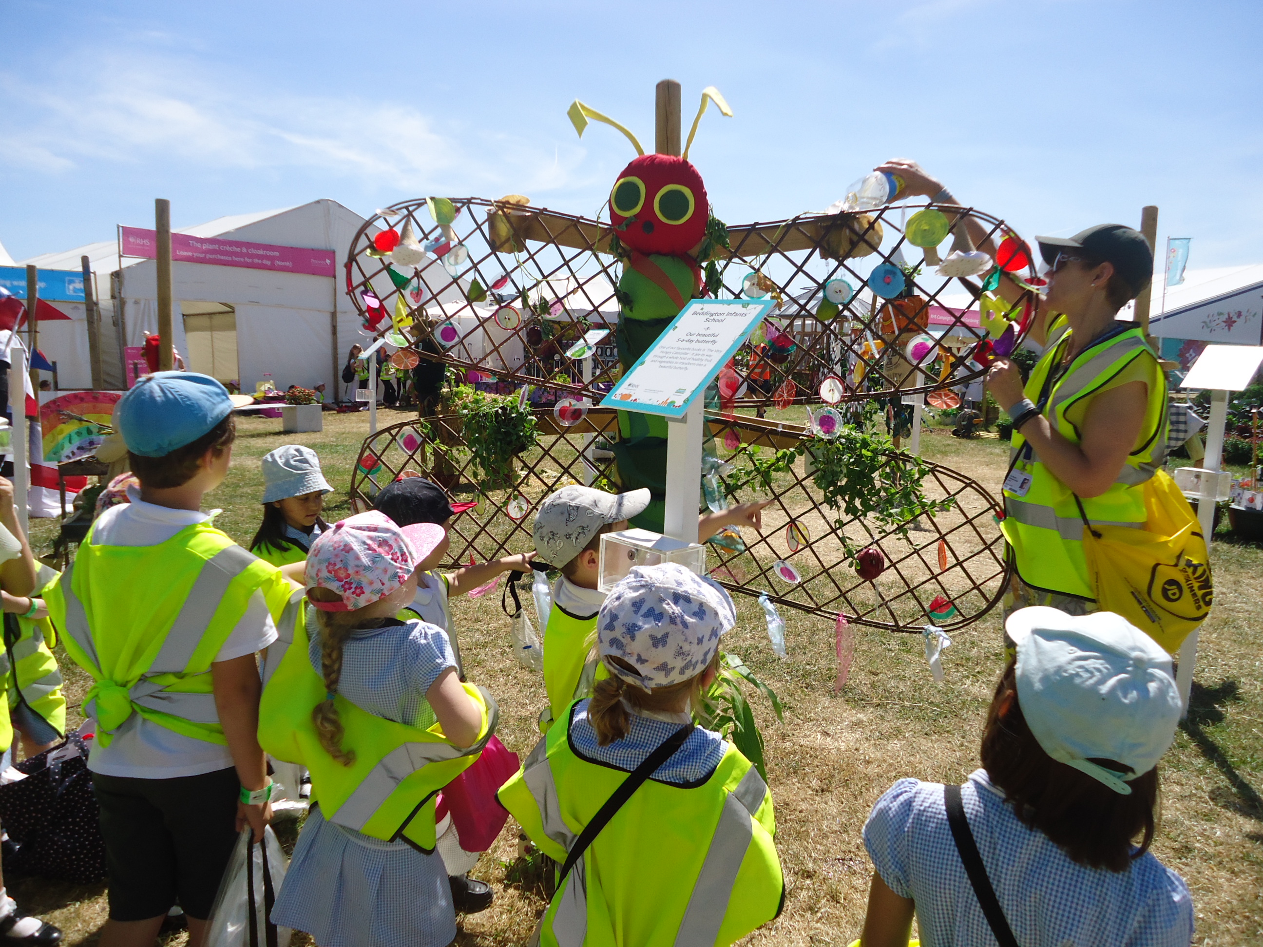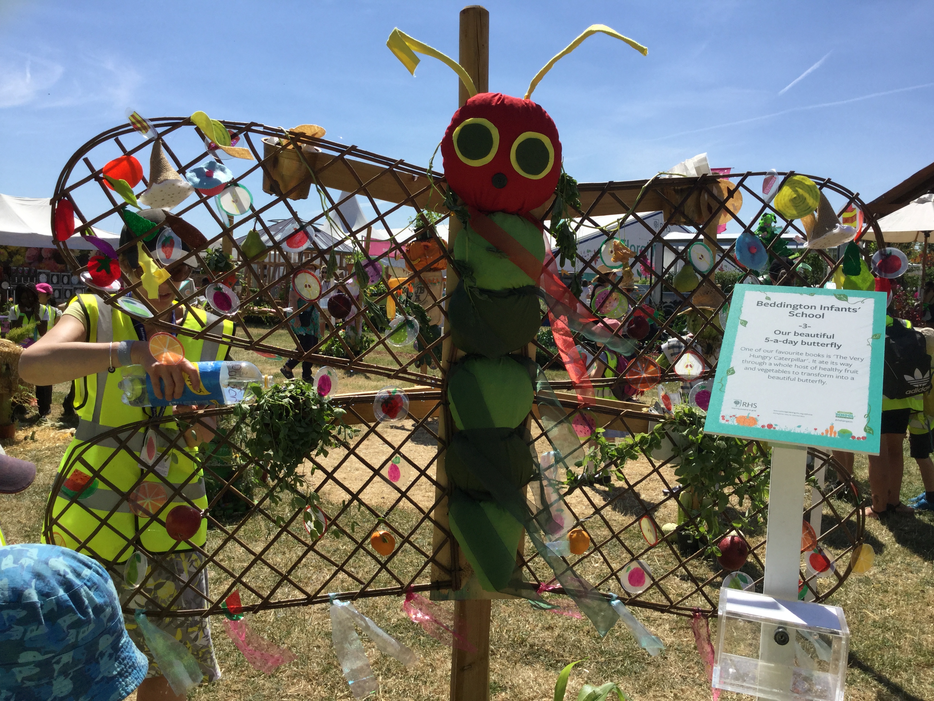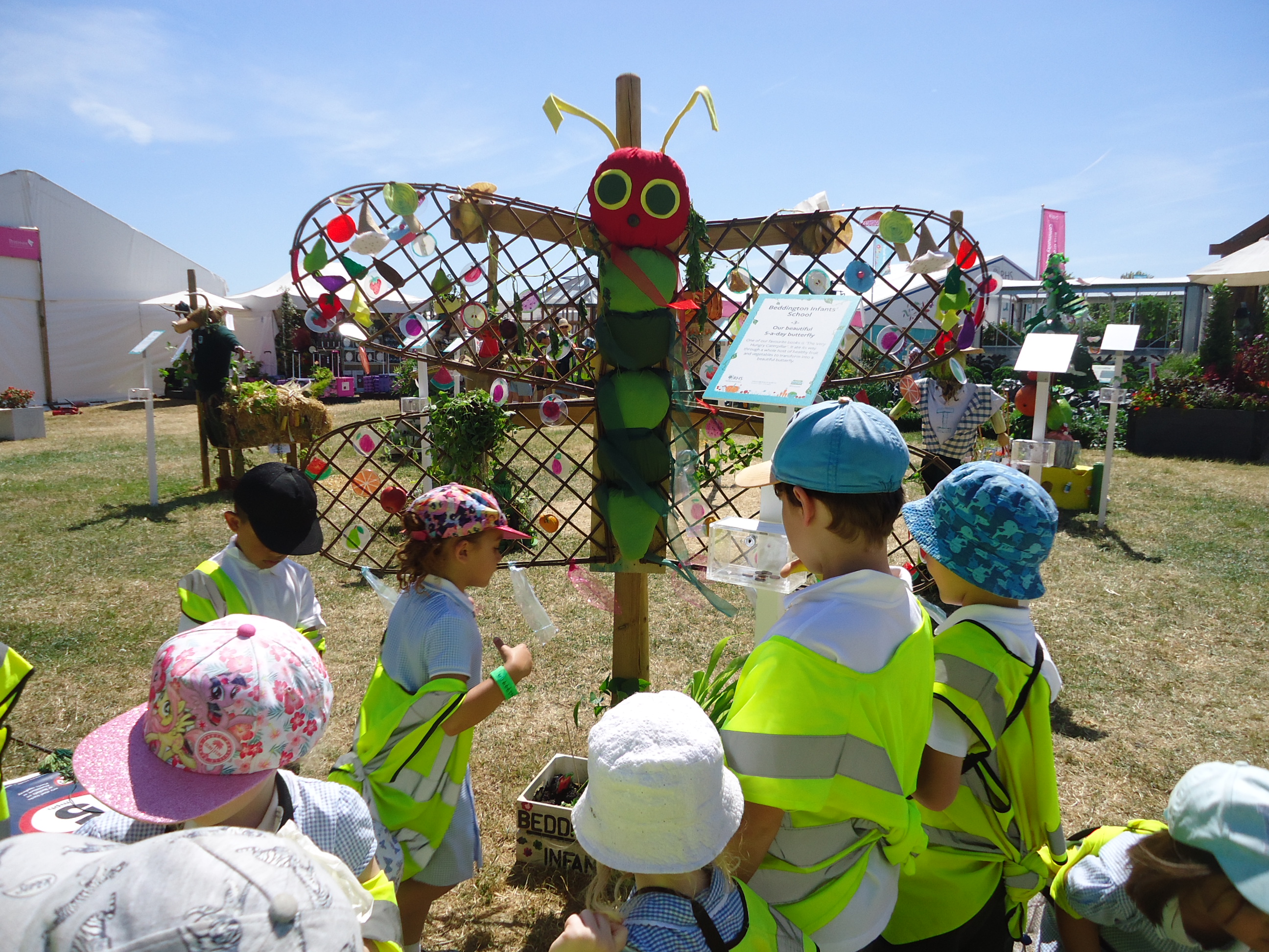 For the second year running Beddington Infants’ School have taken part in the Hampton Court Flower Show, Scarecrow Competition. The Gardening Club submitted a design based on the theme ‘You are what you eat’. We were delighted when our entry was accepted. Lots of children and adults in school contributed to creating ‘Our beautiful 5 a-day butterfly’, based on a very well known caterpillar!