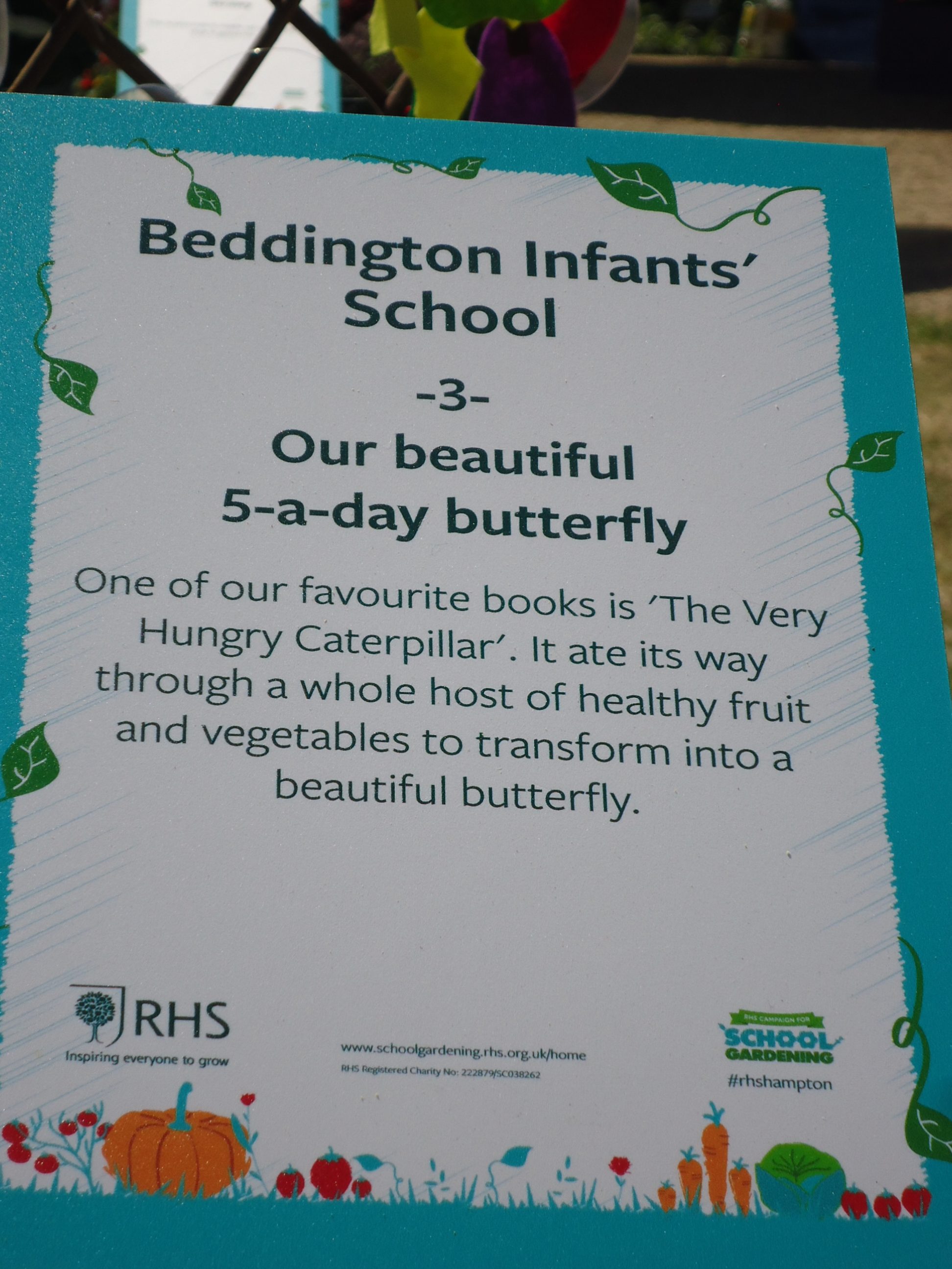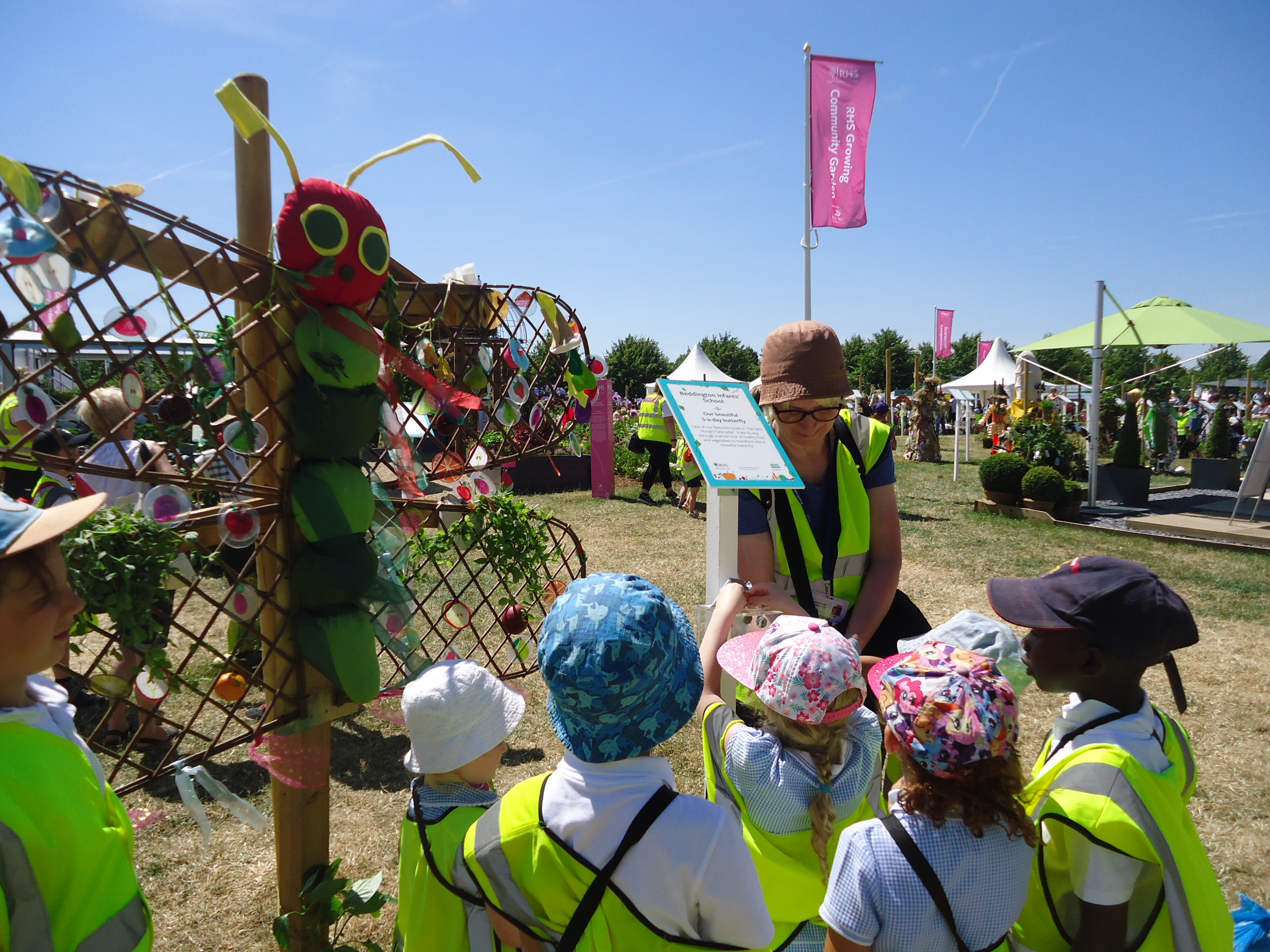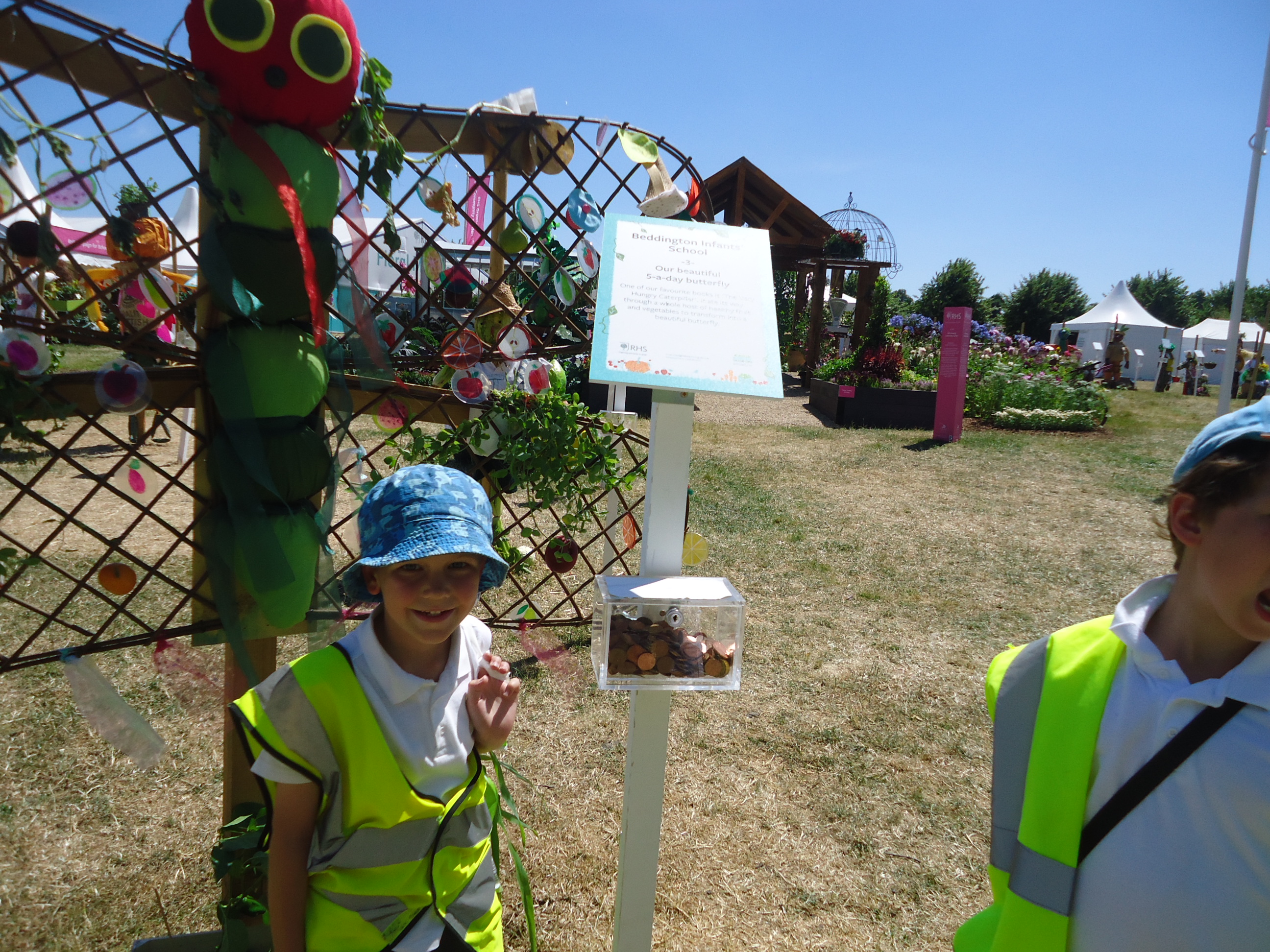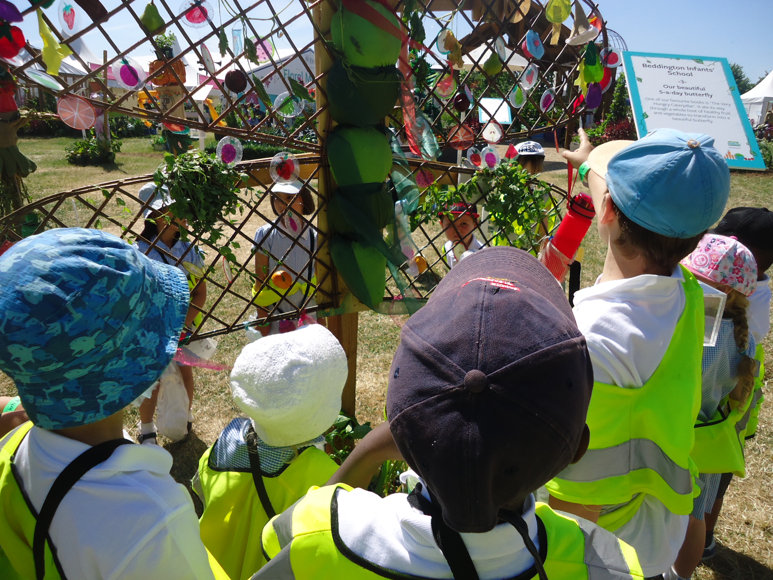 For the second year running Beddington Infants’ School have taken part in the Hampton Court Flower Show, Scarecrow Competition. The Gardening Club submitted a design based on the theme ‘You are what you eat’. We were delighted when our entry was accepted. Lots of children and adults in school contributed to creating ‘Our beautiful 5 a-day butterfly’, based on a very well known caterpillar!