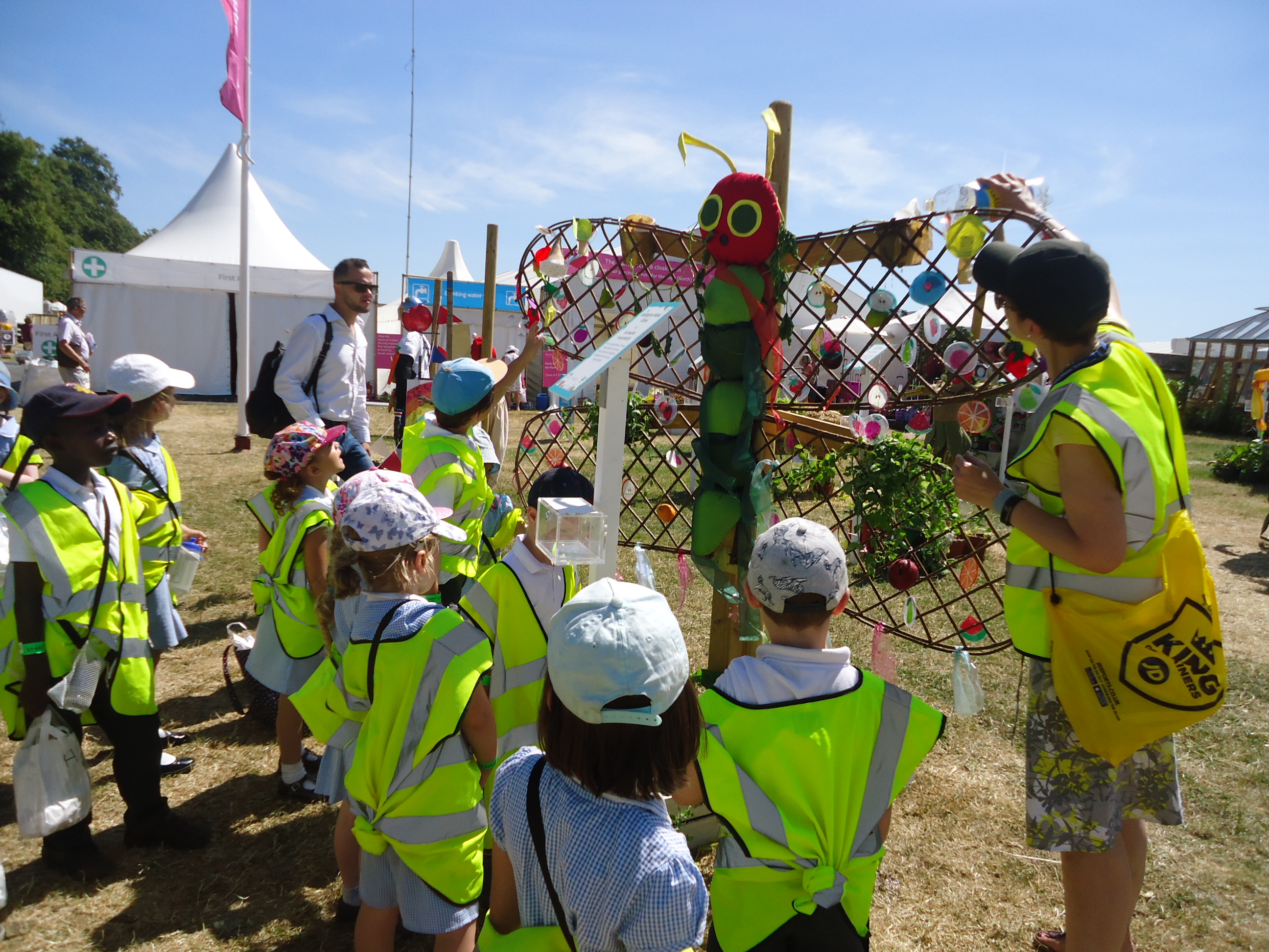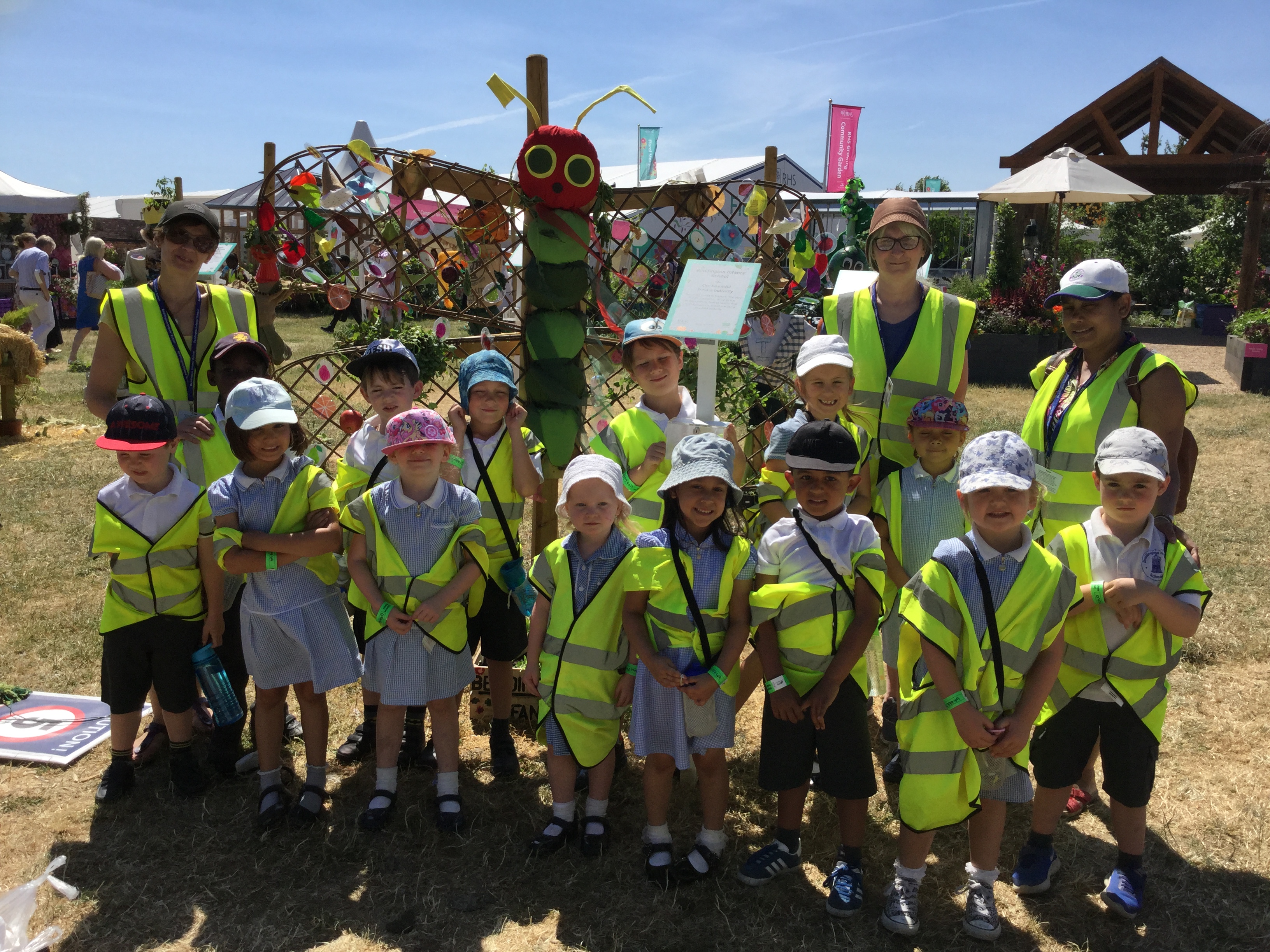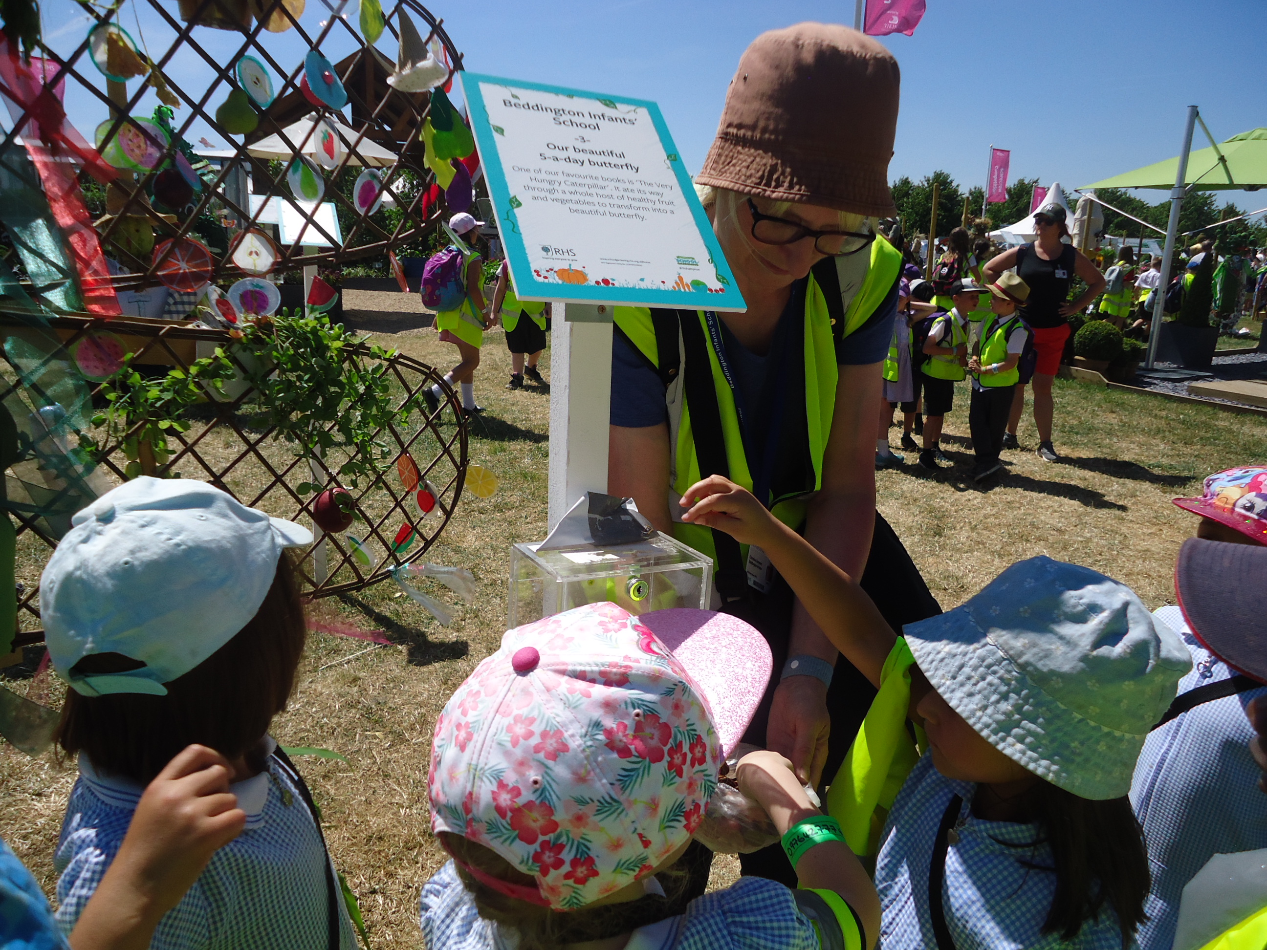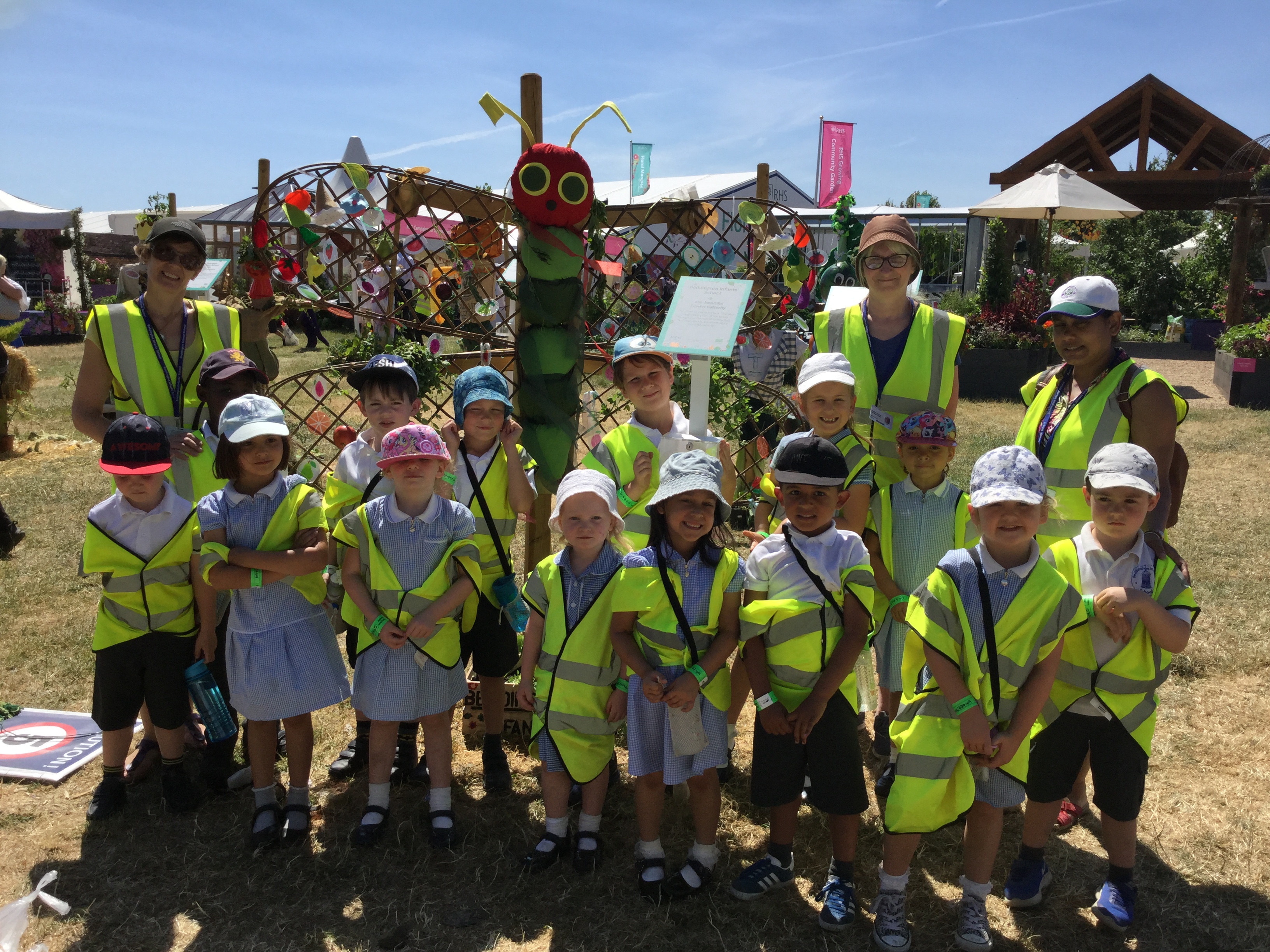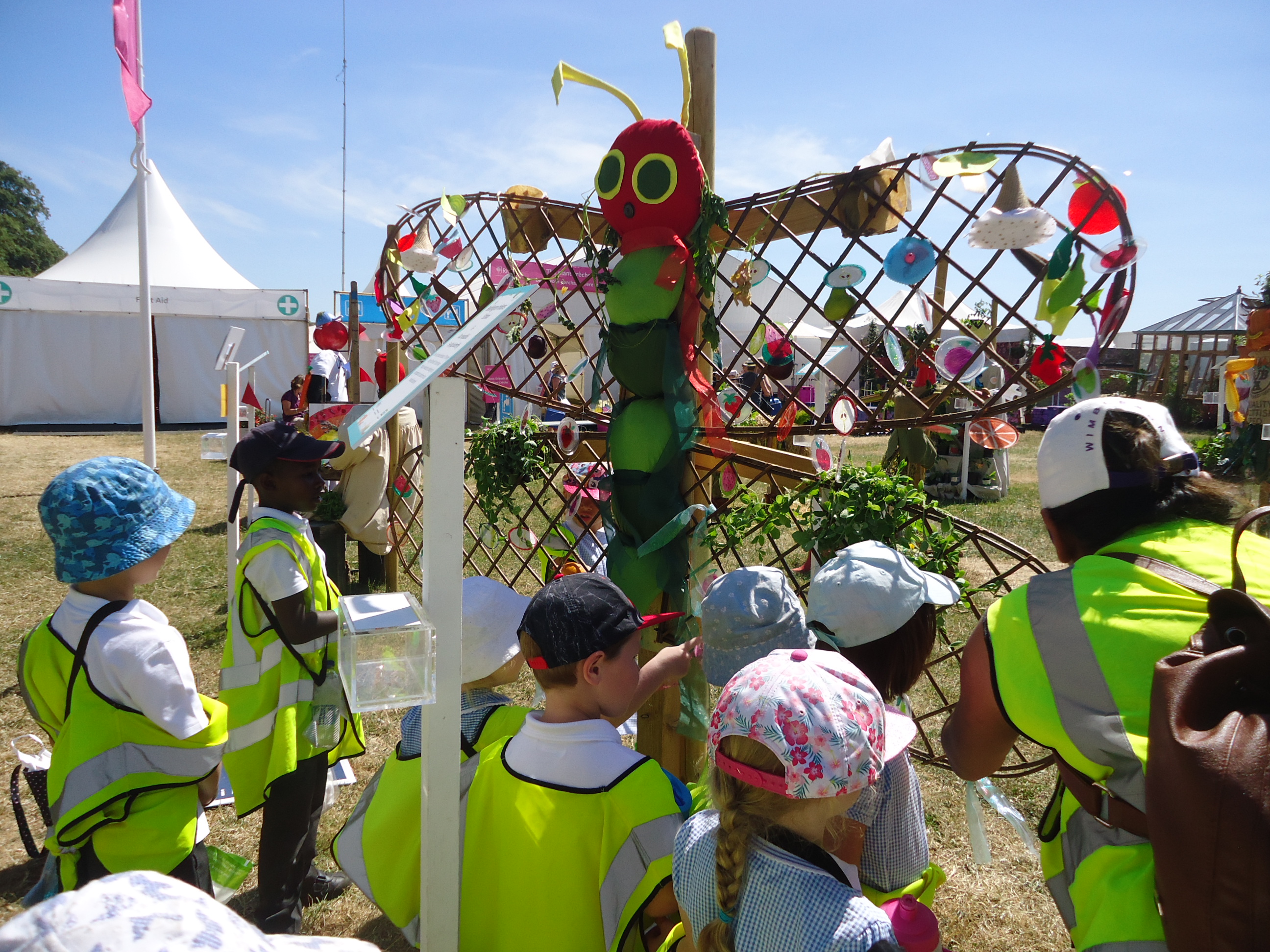 For the second year running Beddington Infants’ School have taken part in the Hampton Court Flower Show, Scarecrow Competition. The Gardening Club submitted a design based on the theme ‘You are what you eat’. We were delighted when our entry was accepted. Lots of children and adults in school contributed to creating ‘Our beautiful 5 a-day butterfly’, based on a very well known caterpillar!