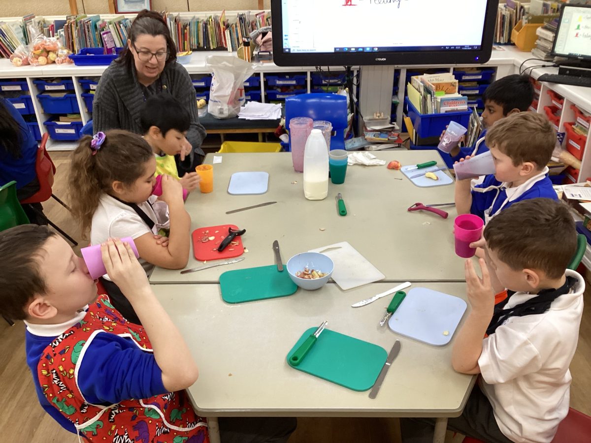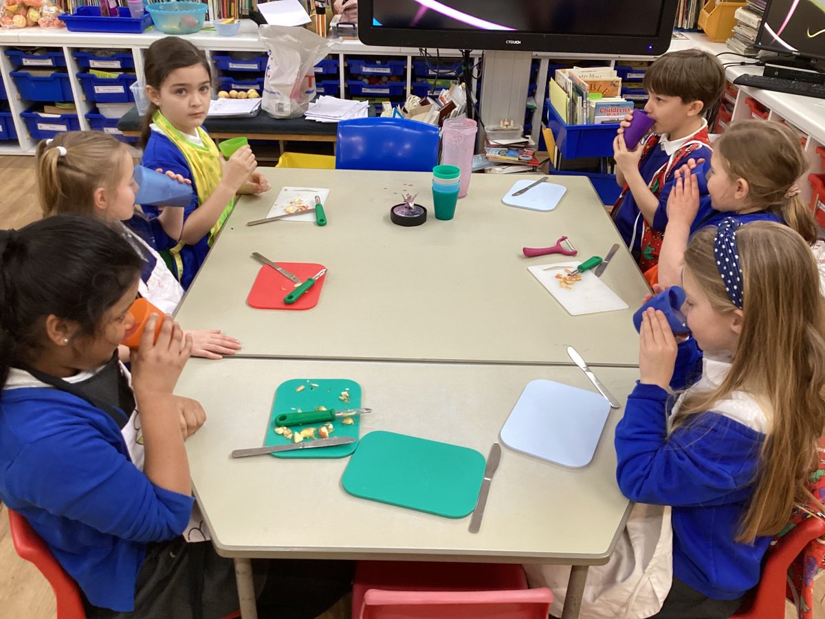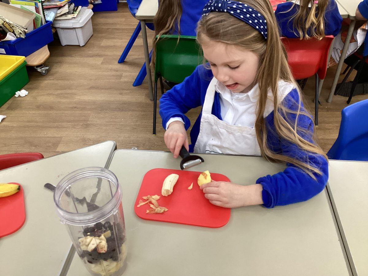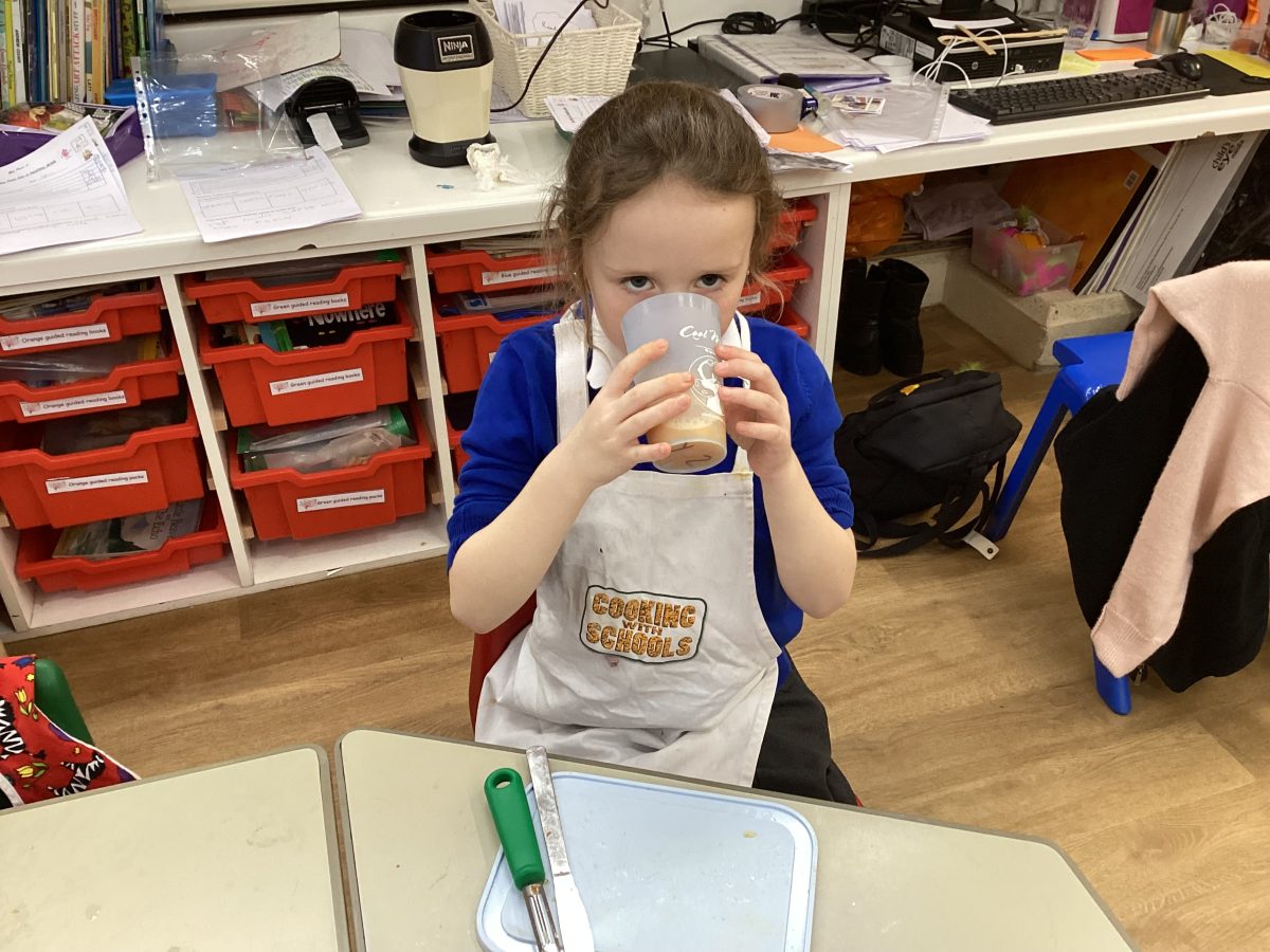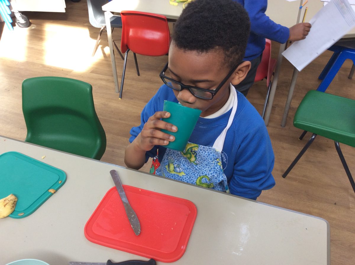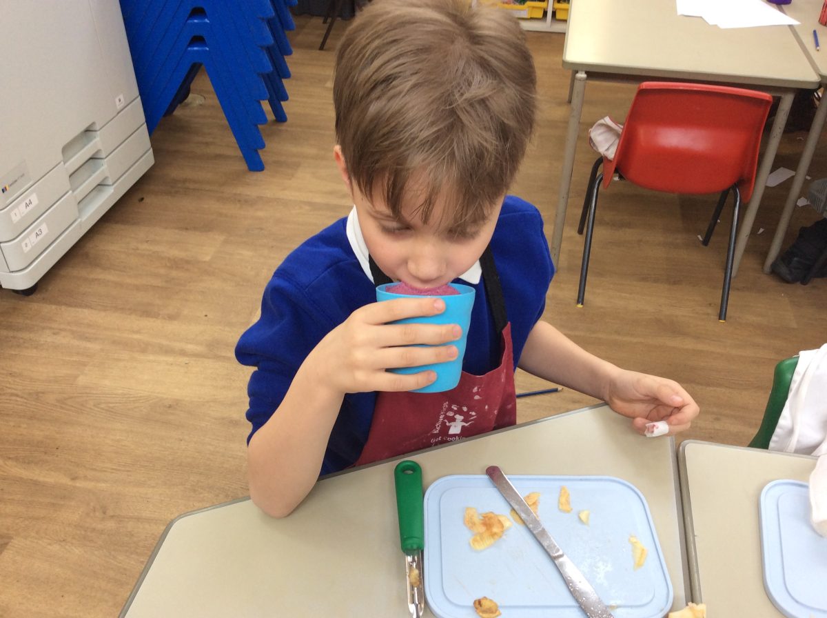 The children in Year 2 have each created their very own unique healthy drink. They used their learning in Science, Relationship and Health Education (RHE) to identify healthy foods to include in their drink. They then used their Design Technology skills to plan their drinks. They selected the ingredients and equipment they needed. In small groups with an adult the children learnt new skills such as safely using a peeler and knife to cut their fruit. They then used a blender to combine their ingredients, creating a delicious drink. They used DeBono’s Thinking Hats to evaluate their creations. It was a great way to end their topic Muck, Mess and Mixtures!