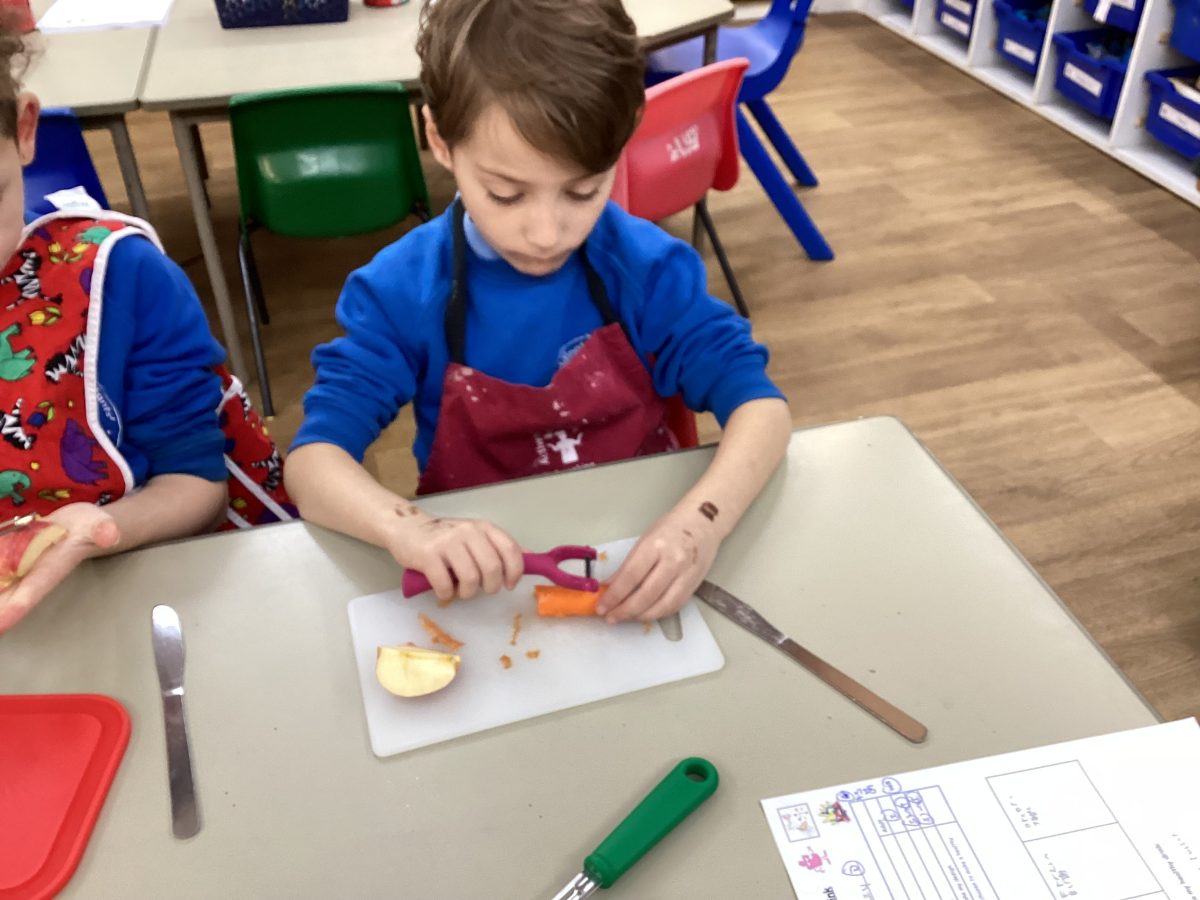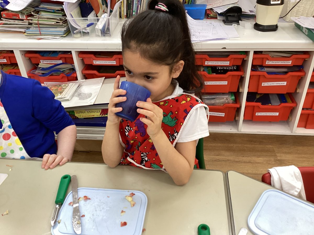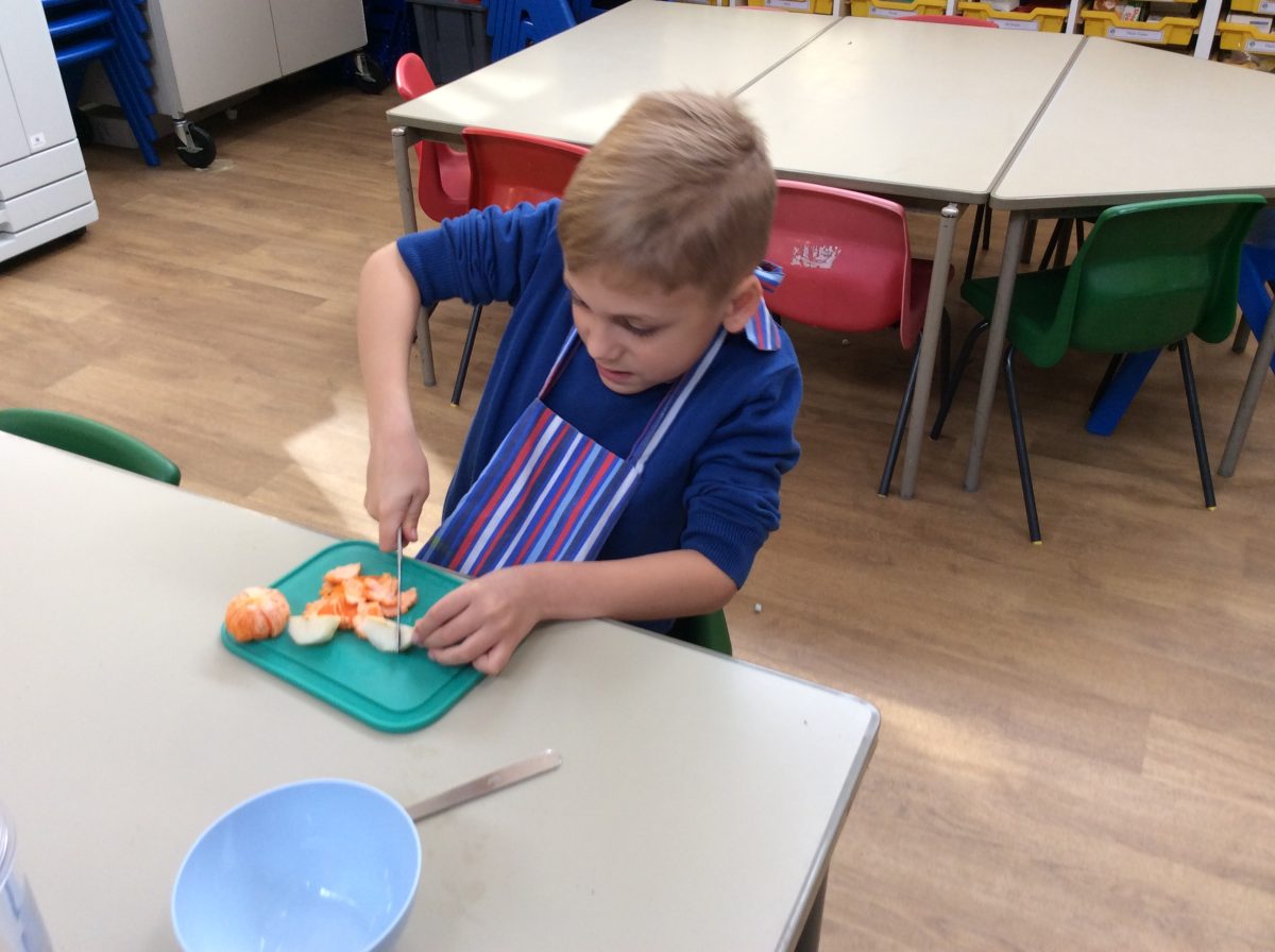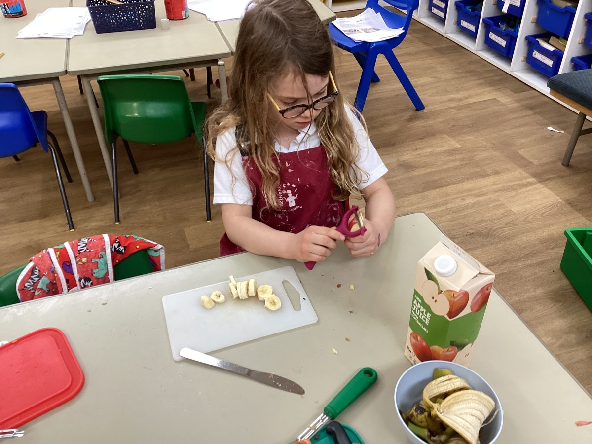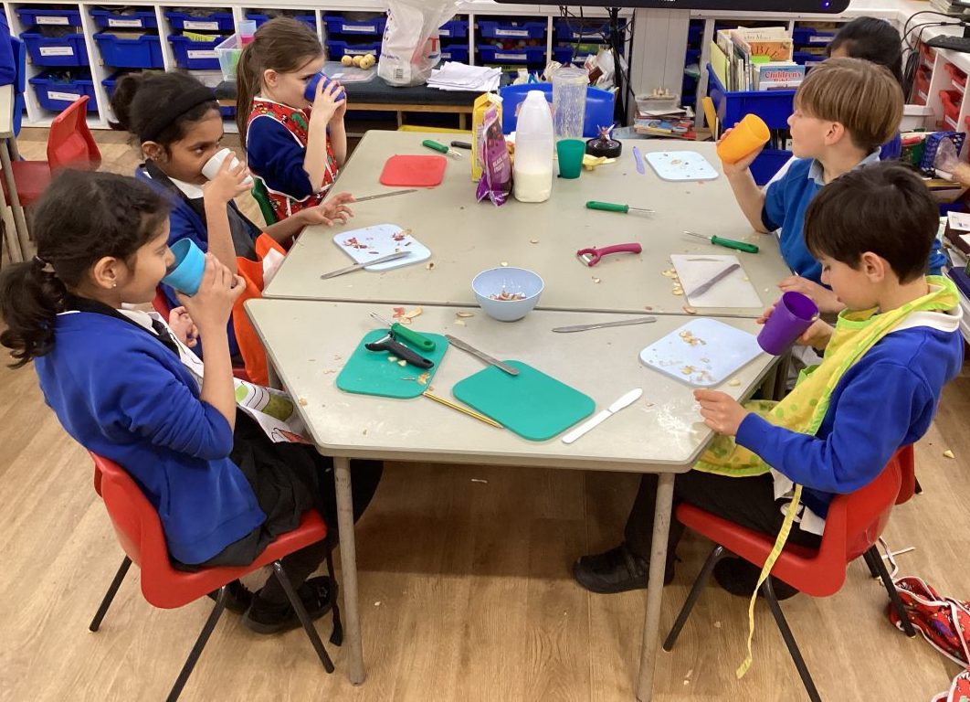 The children in Year 2 have each created their very own unique healthy drink. They used their learning in Science, Relationship and Health Education (RHE) to identify healthy foods to include in their drink. They then used their Design Technology skills to plan their drinks. They selected the ingredients and equipment they needed. In small groups with an adult the children learnt new skills such as safely using a peeler and knife to cut their fruit. They then used a blender to combine their ingredients, creating a delicious drink. They used DeBono’s Thinking Hats to evaluate their creations. It was a great way to end their topic Muck, Mess and Mixtures!