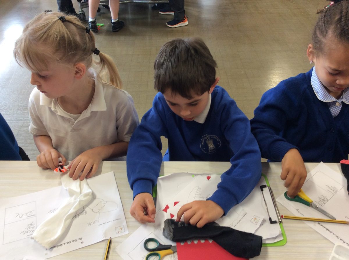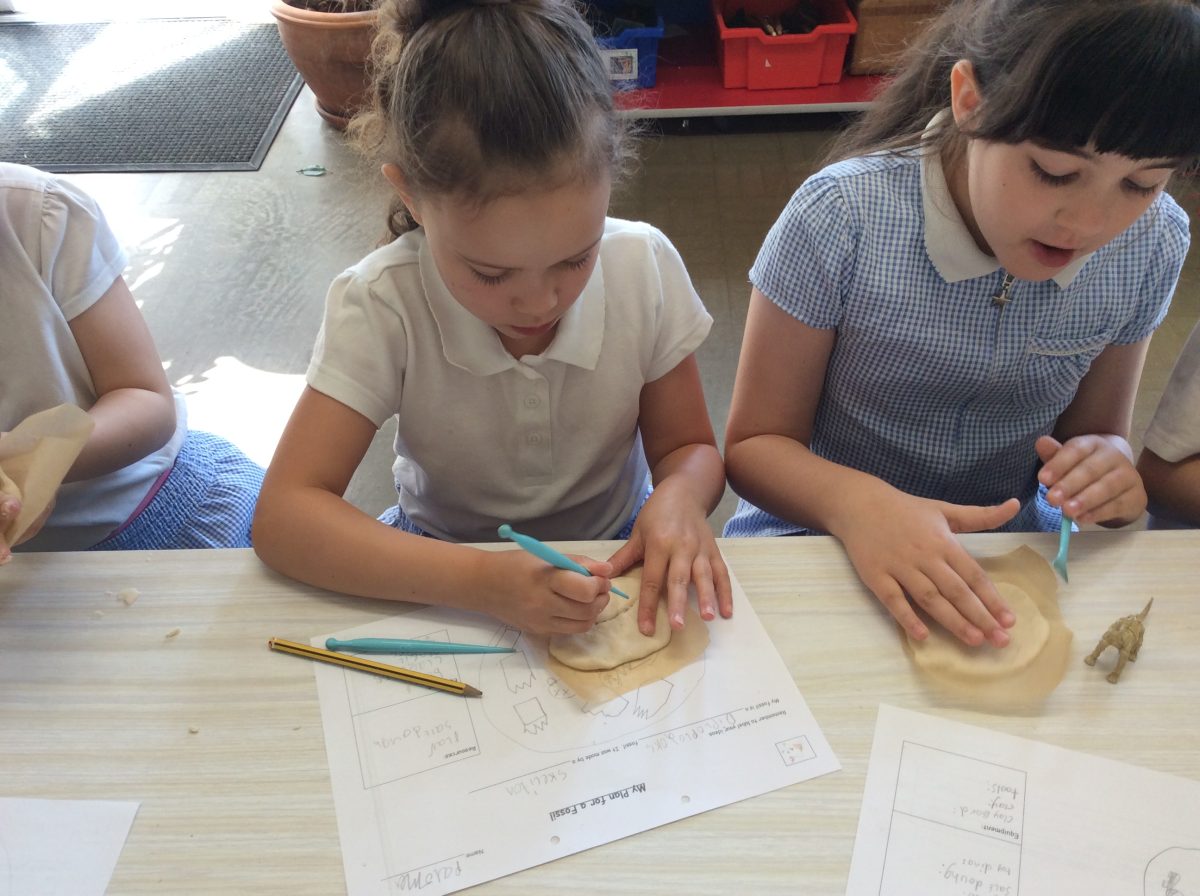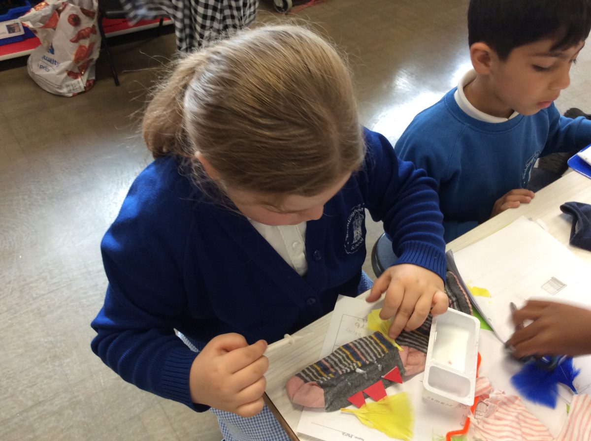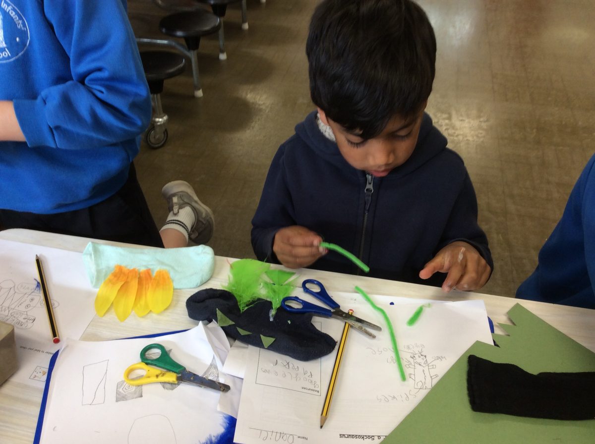 The children have used the research they have done about dinosaurs to design and create a sockosaurus, thinking carefully about the resources they wanted to use. The children have even used their knowledge of fossils to design and make their own ‘fossils’! Some children made trace fossils and some children made bone fossils; everyone thought really carefully about the equipment they needed to make their artefacts.