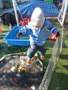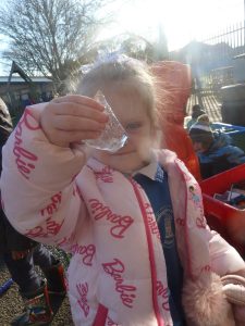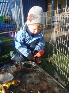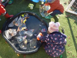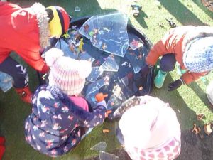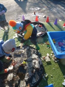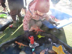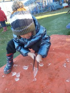 We made the most of the freezing weather. We discovered that some of our toys had been frozen in the tuff spots!! We had to work out how to free them.