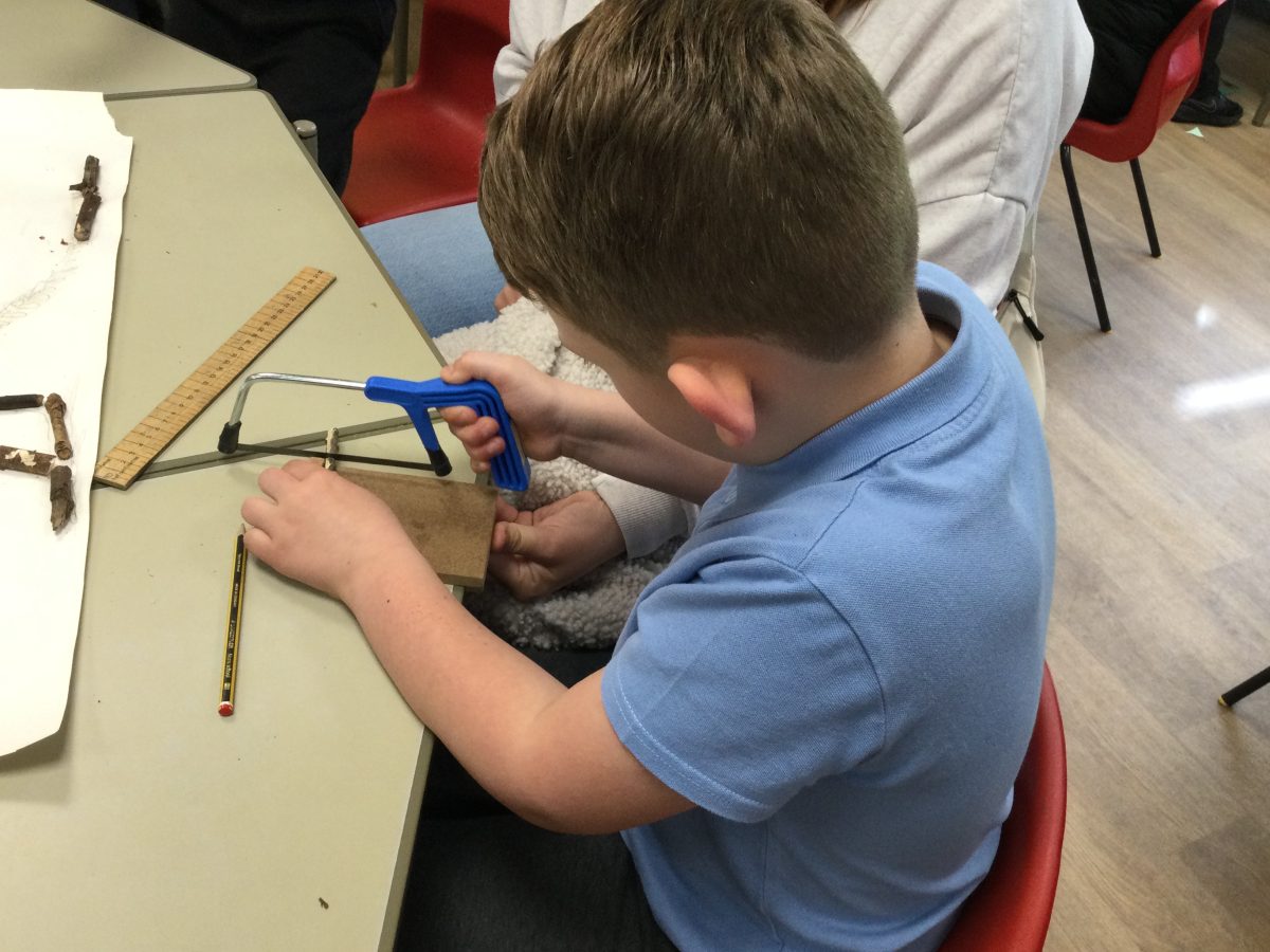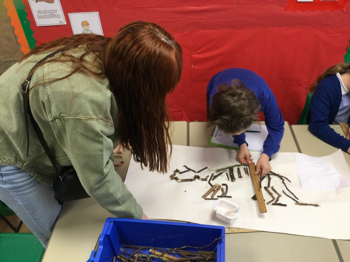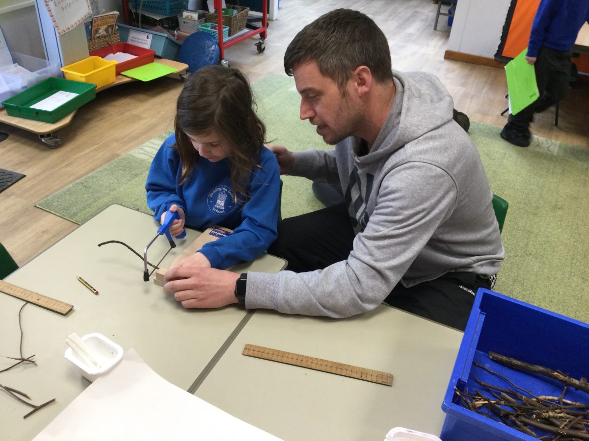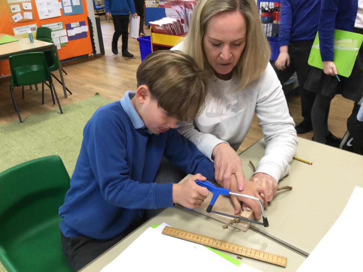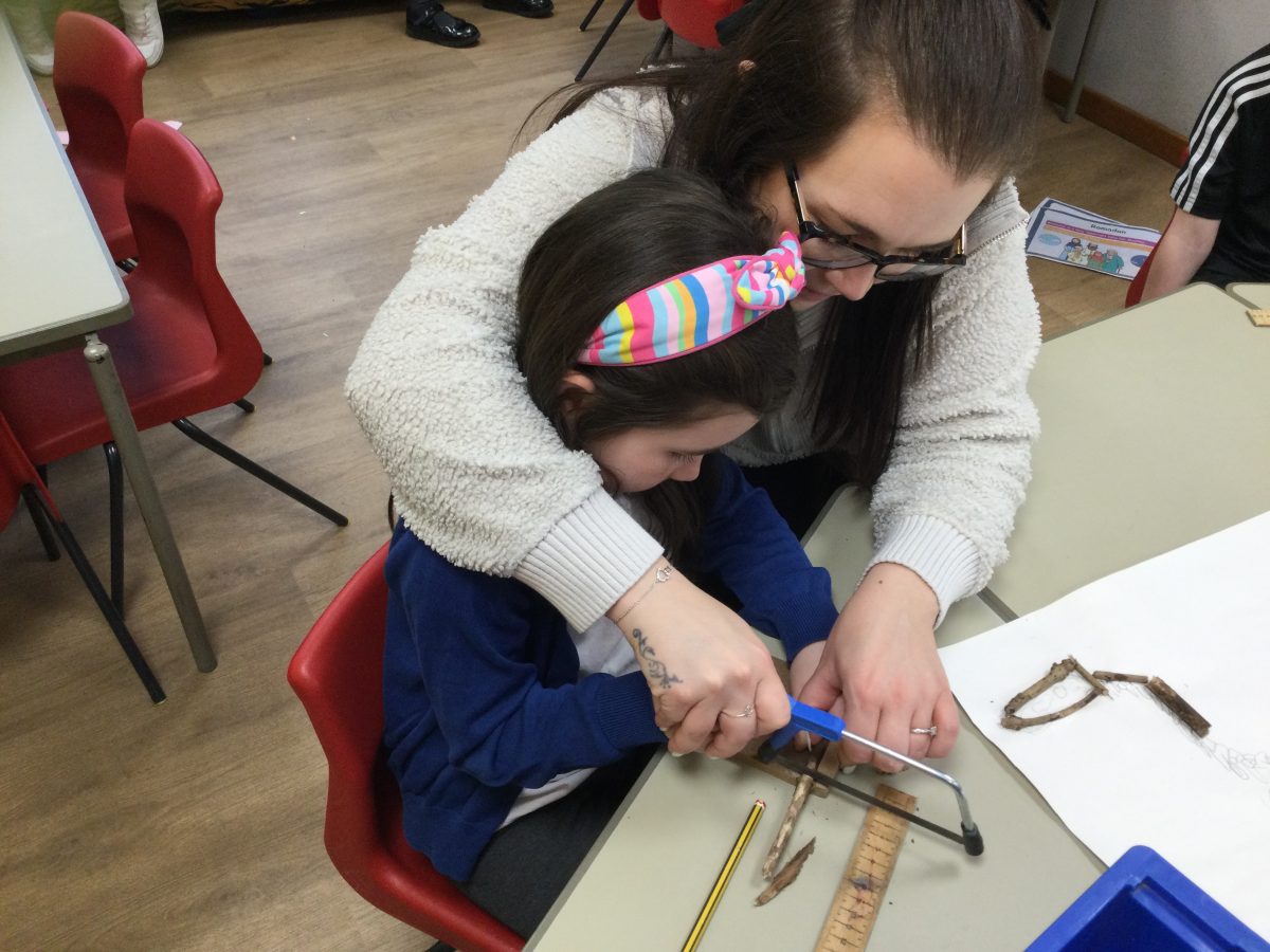 Family members came into school to find out about the maths learning that happens in Year 2. Then the children and grown-ups measured a bone in cm from the drawings that had been created. They marked that measurement on a stick. With support from adults, the children used the new skill of sawing to make their stick the correct length to match the bone.
