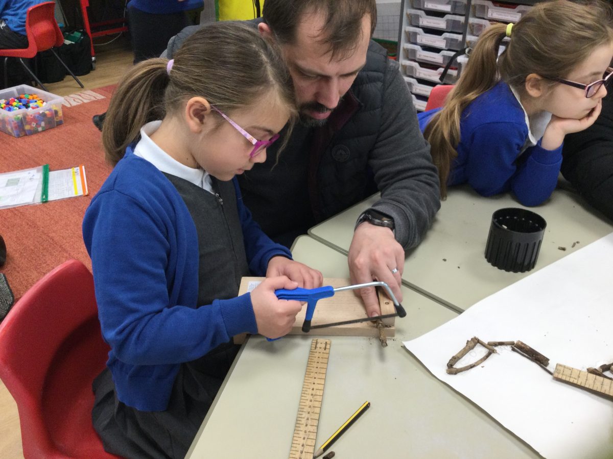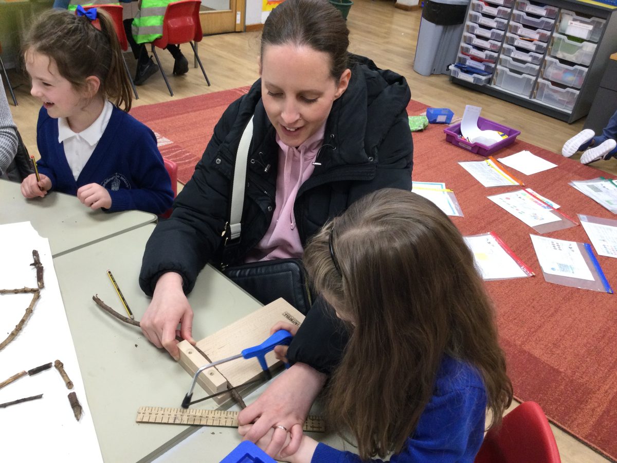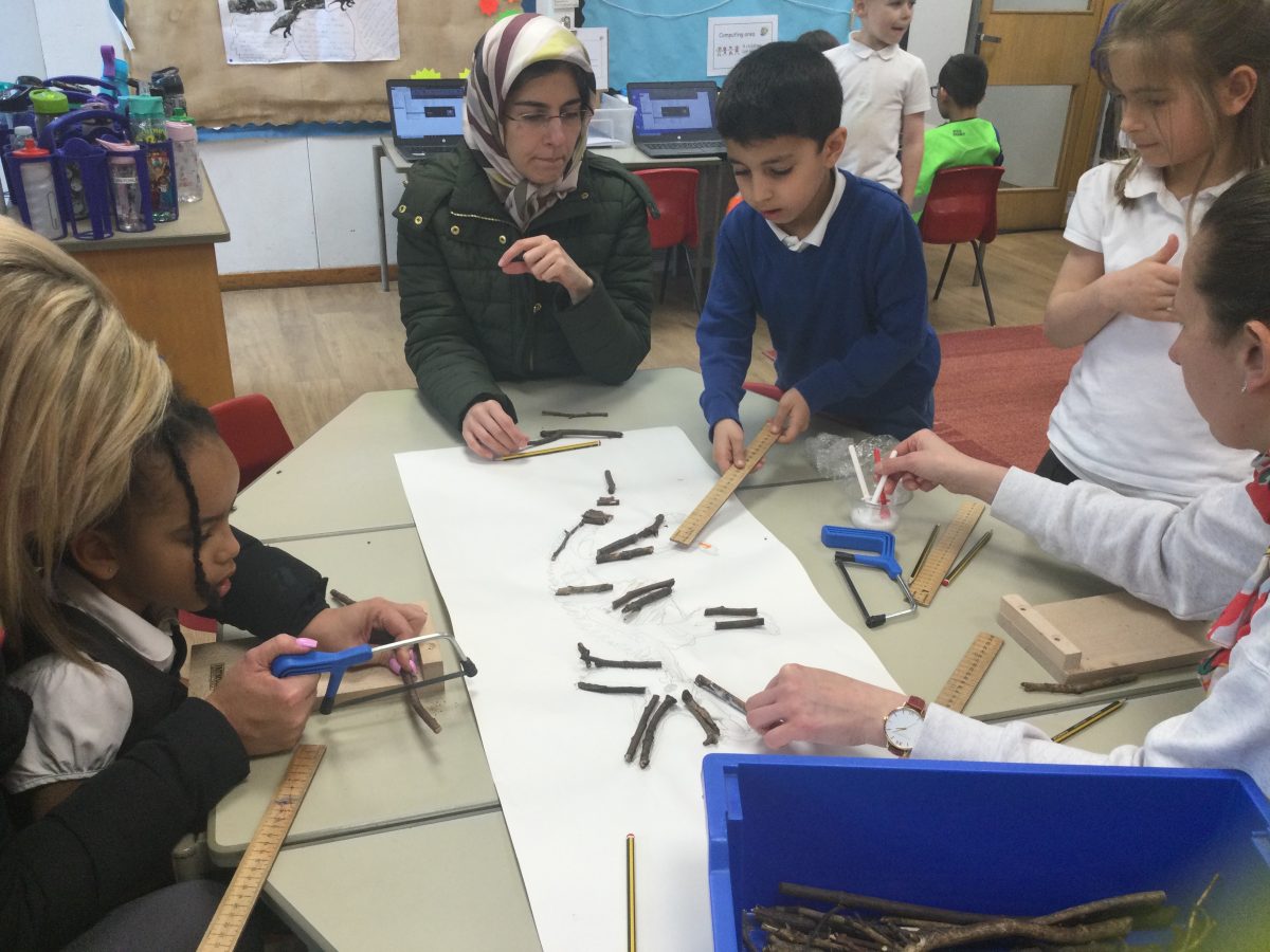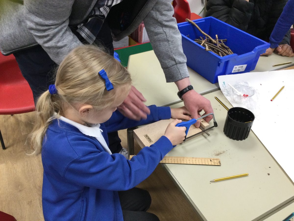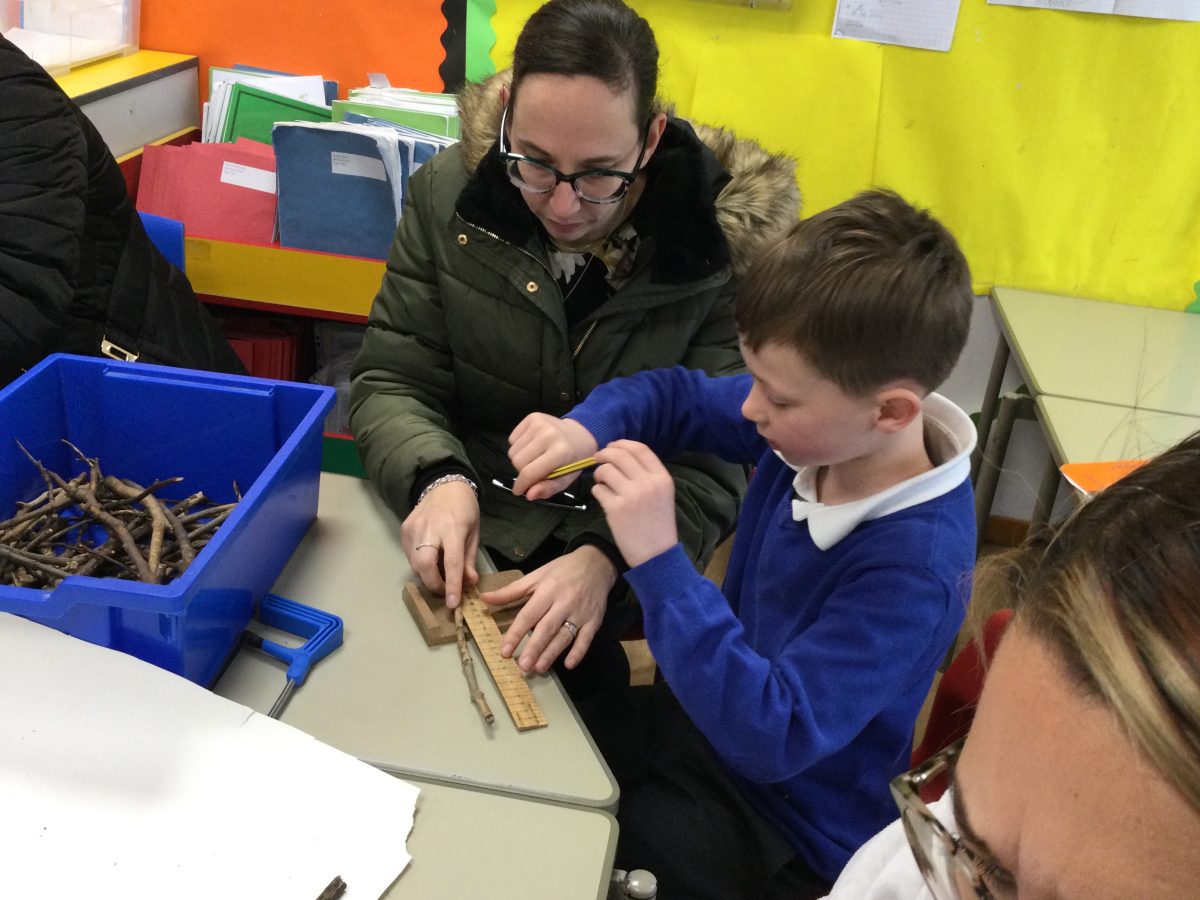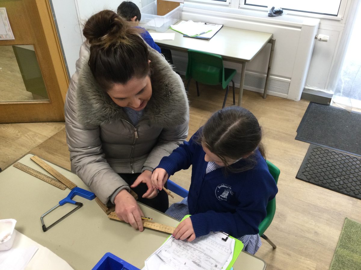 Family members came into school to find out about the maths learning that happens in Year 2. Then the children and grown-ups measured a bone in cm from the drawings that had been created. They marked that measurement on a stick. With support from adults, the children used the new skill of sawing to make their stick the correct length to match the bone.