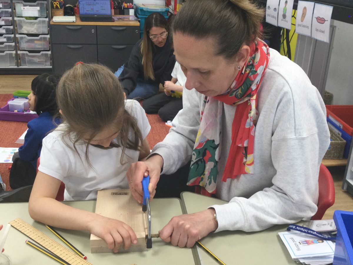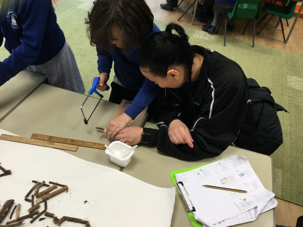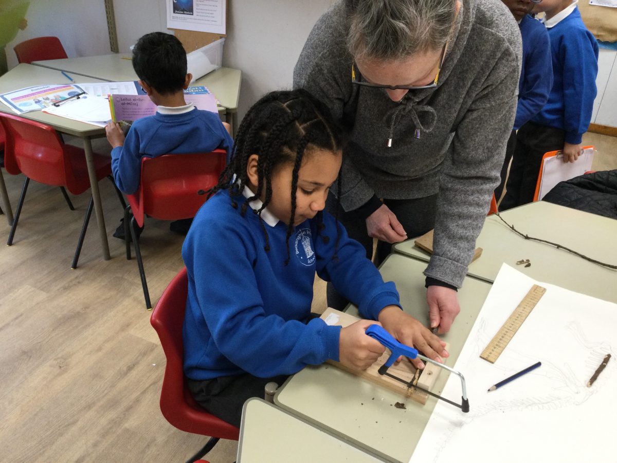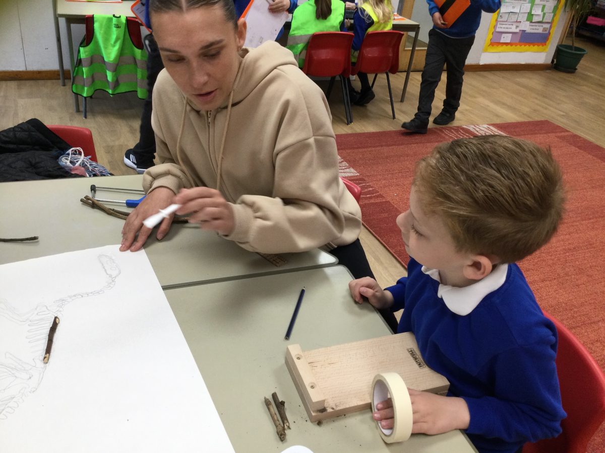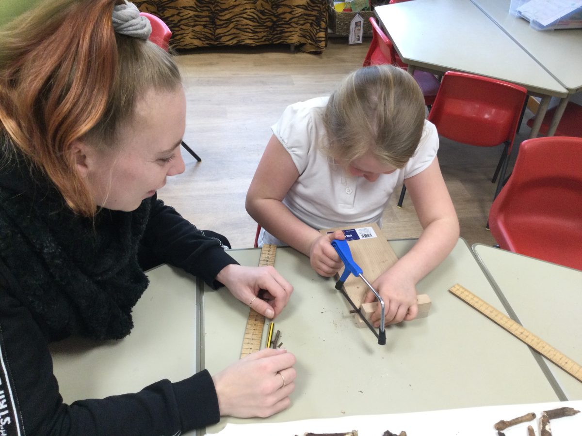 Family members came into school to find out about the maths learning that happens in Year 2. Then the children and grown-ups measured a bone in cm from the drawings that had been created. They marked that measurement on a stick. With support from adults, the children used the new skill of sawing to make their stick the correct length to match the bone.