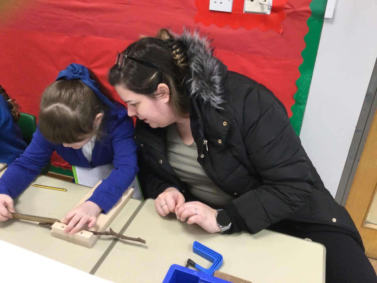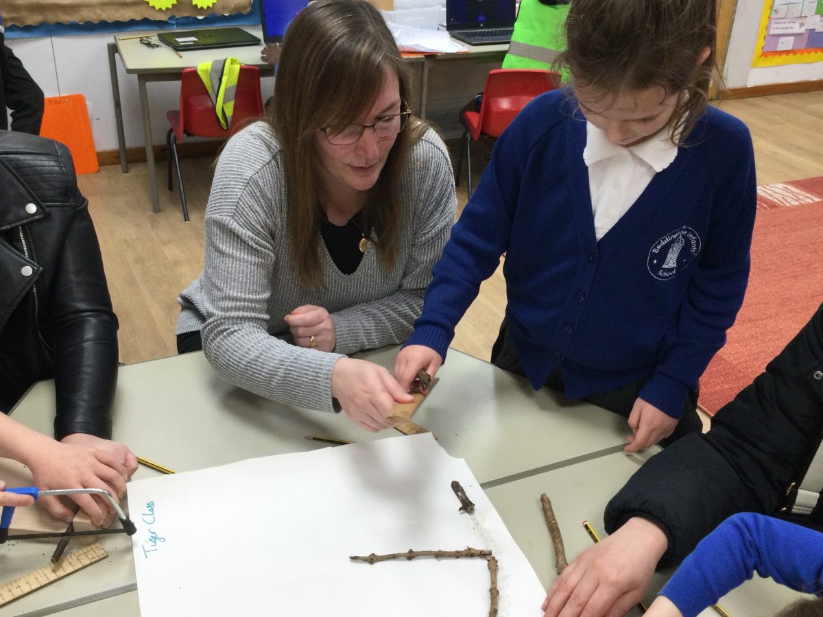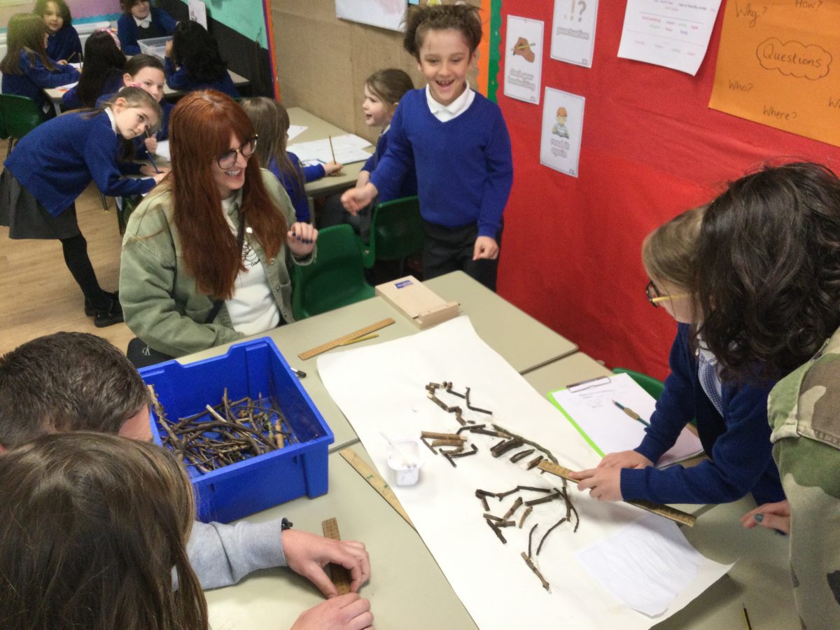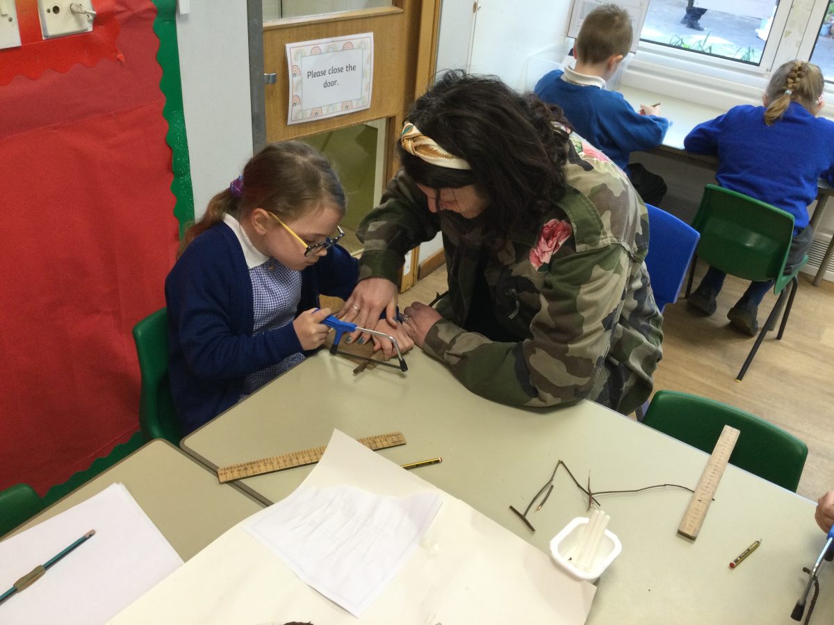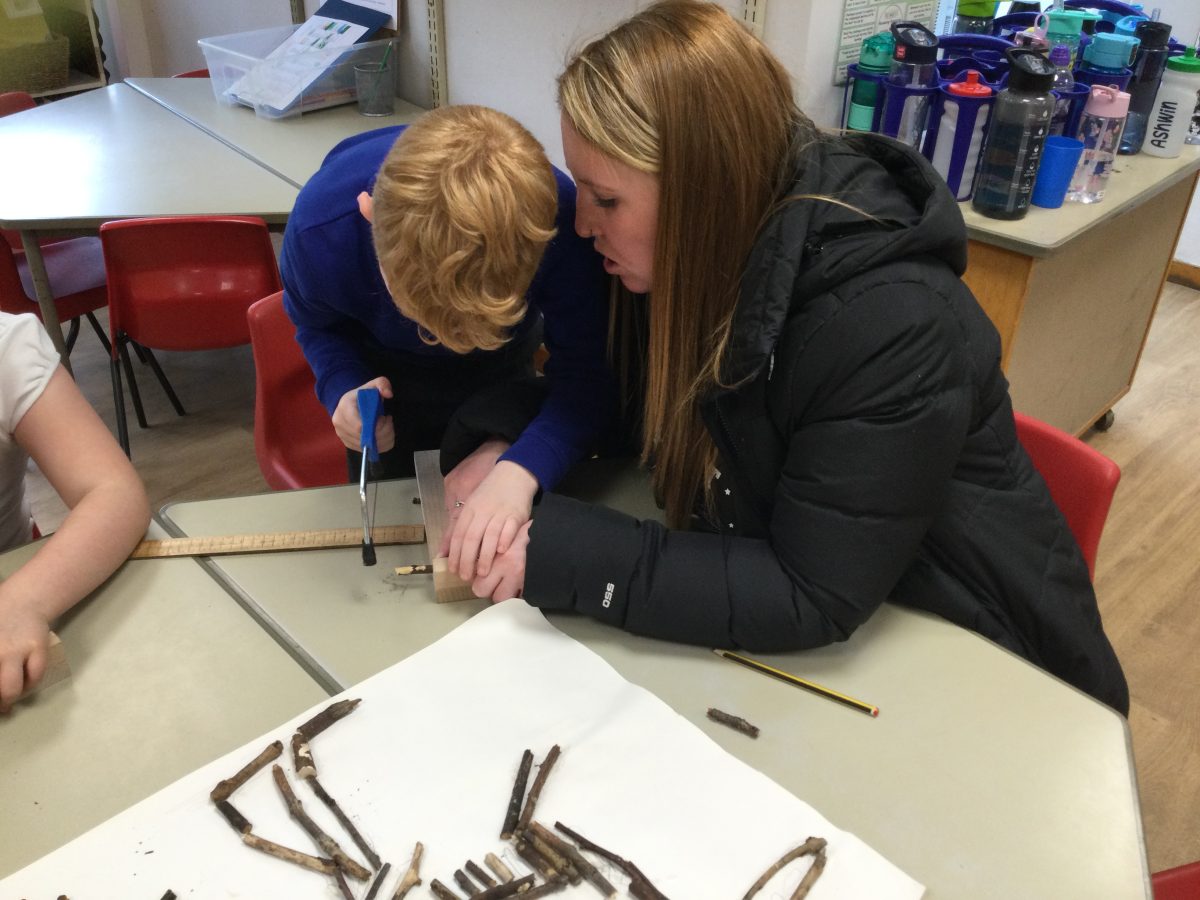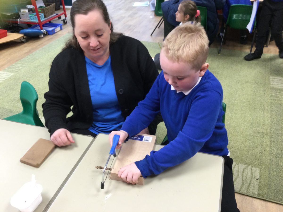 Family members came into school to find out about the maths learning that happens in Year 2. Then the children and grown-ups measured a bone in cm from the drawings that had been created. They marked that measurement on a stick. With support from adults, the children used the new skill of sawing to make their stick the correct length to match the bone.