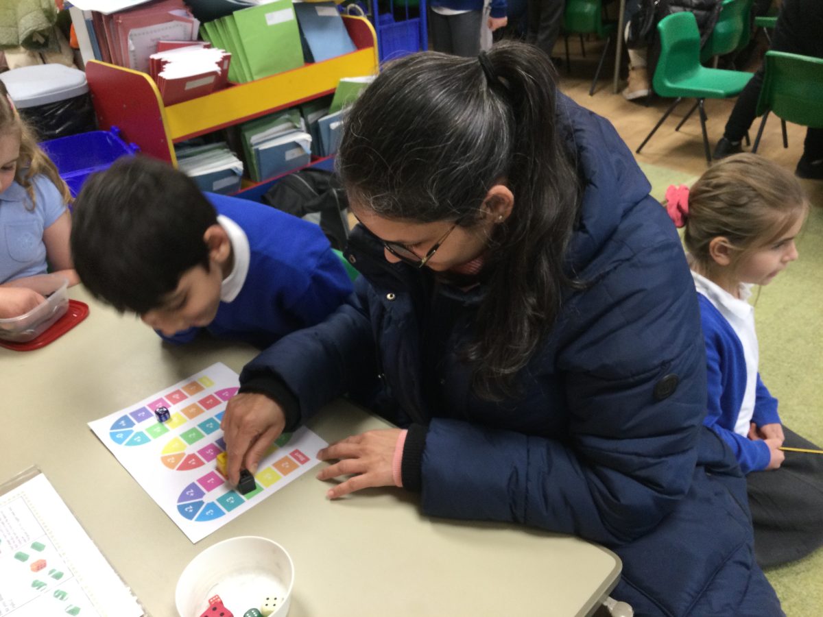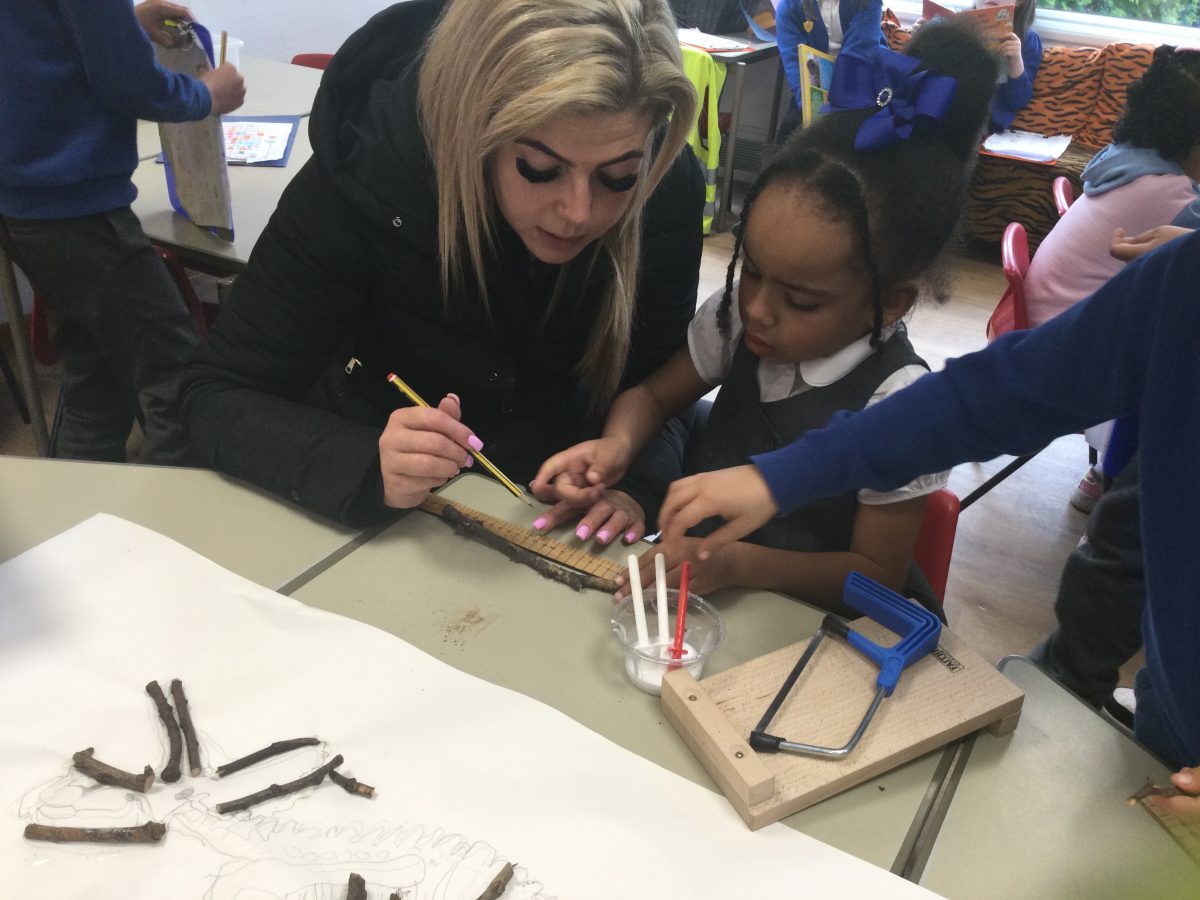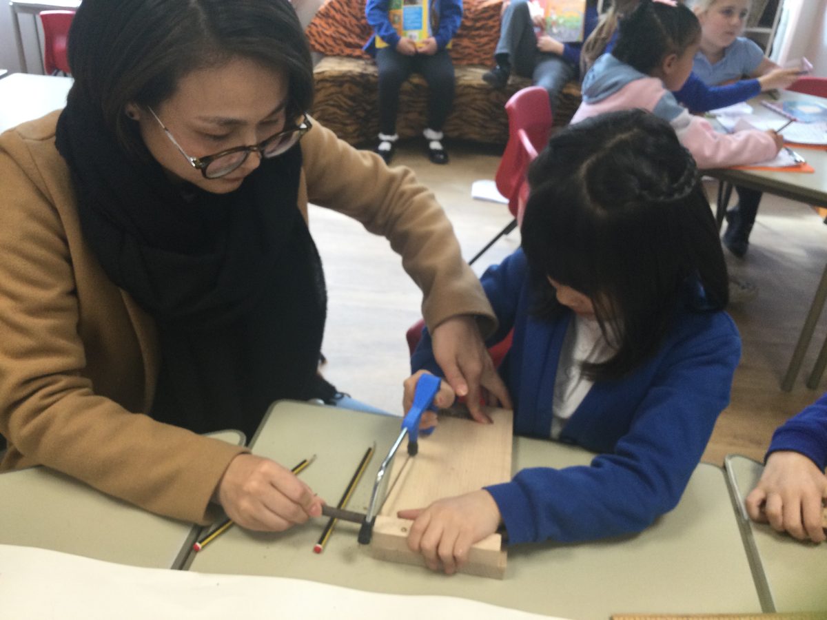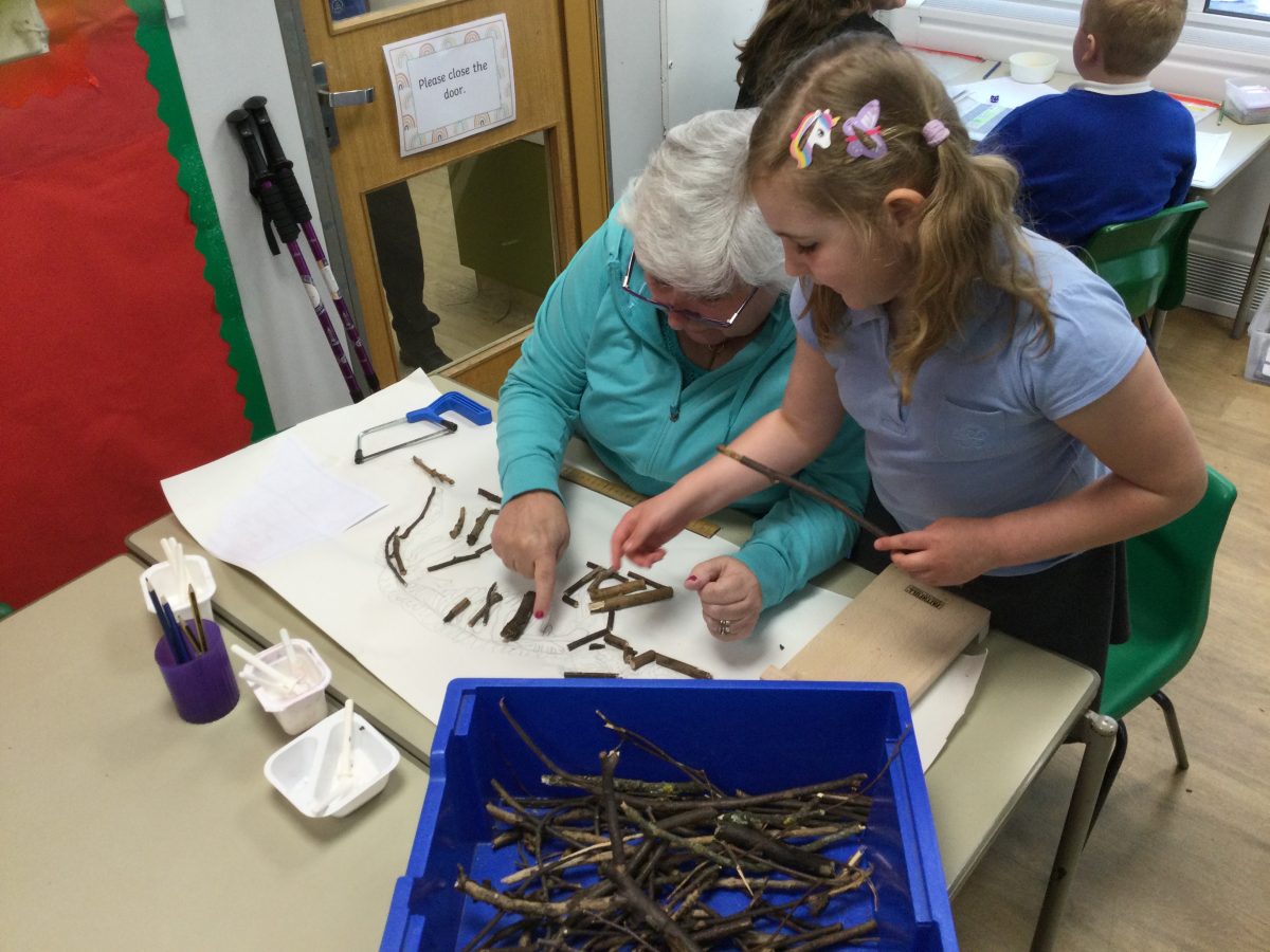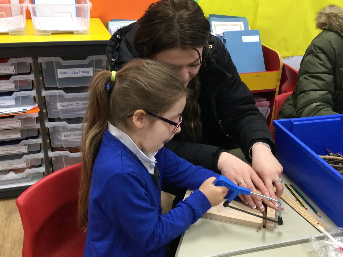 Family members came into school to find out about the maths learning that happens in Year 2. Then the children and grown-ups measured a bone in cm from the drawings that had been created. They marked that measurement on a stick. With support from adults, the children used the new skill of sawing to make their stick the correct length to match the bone.