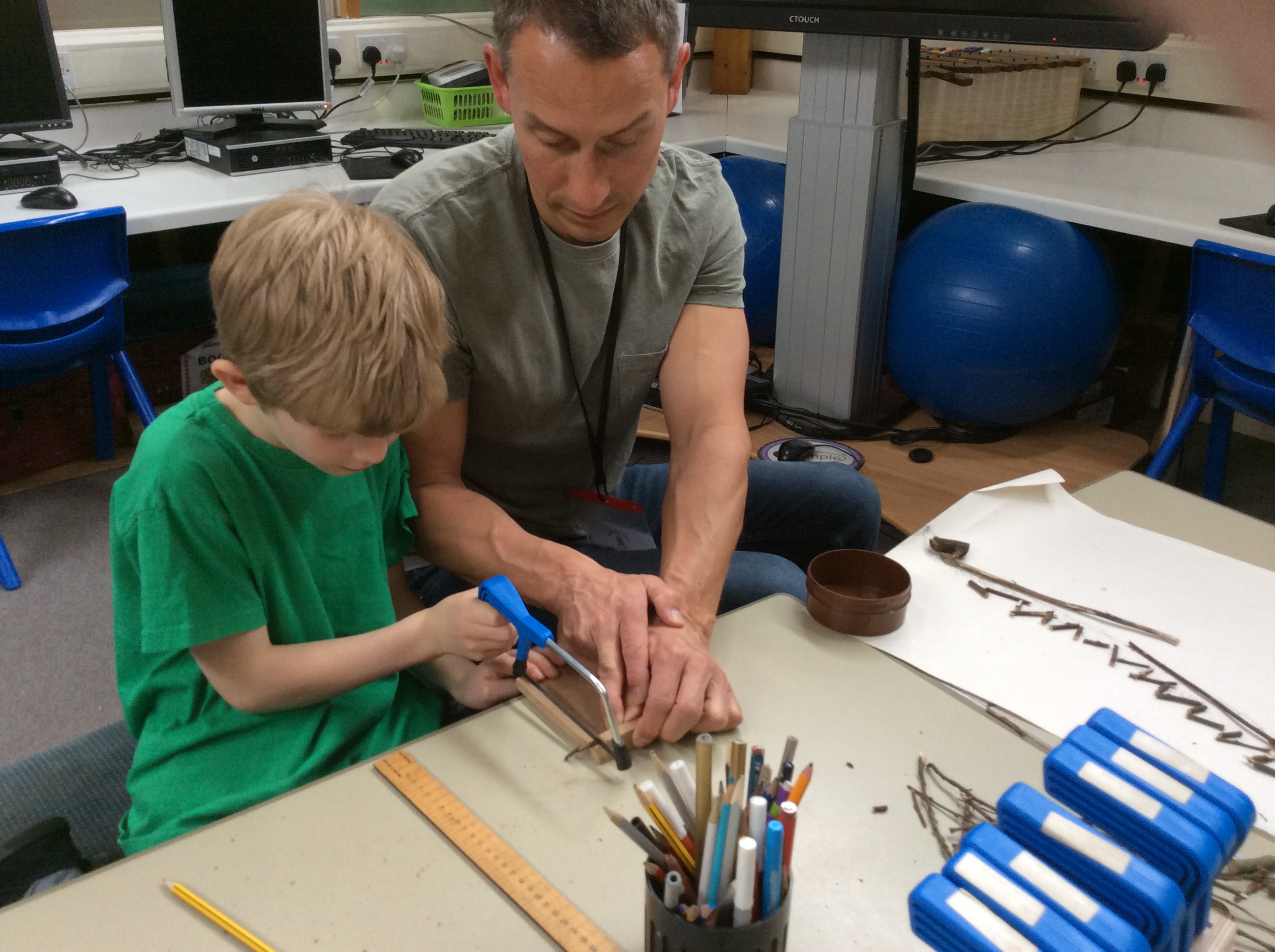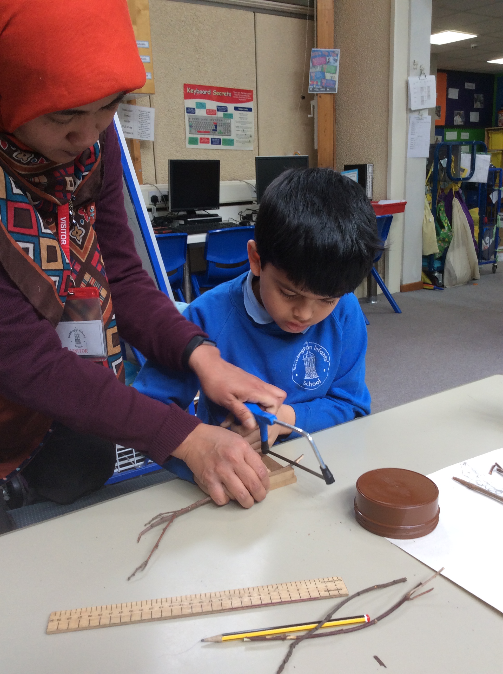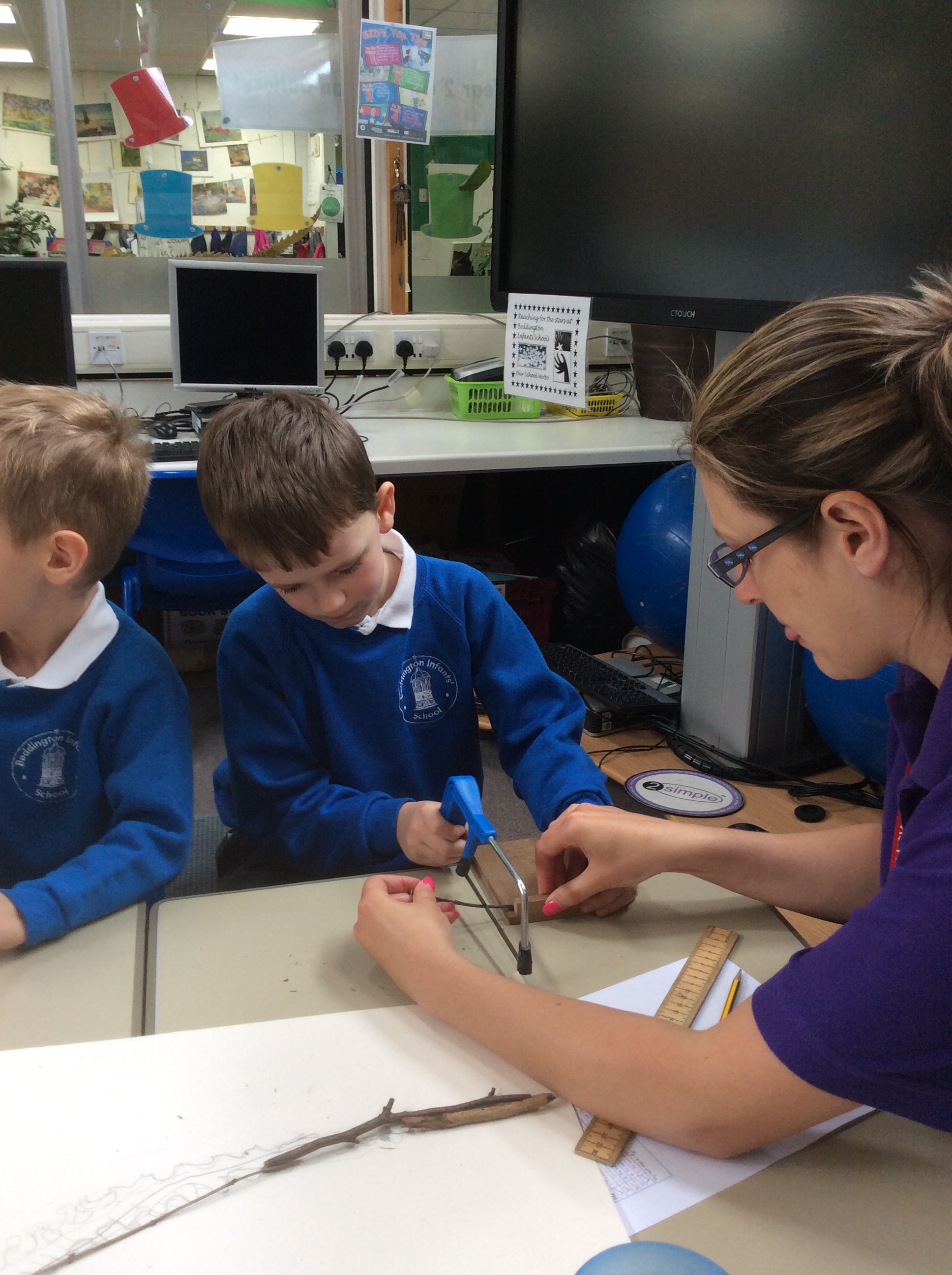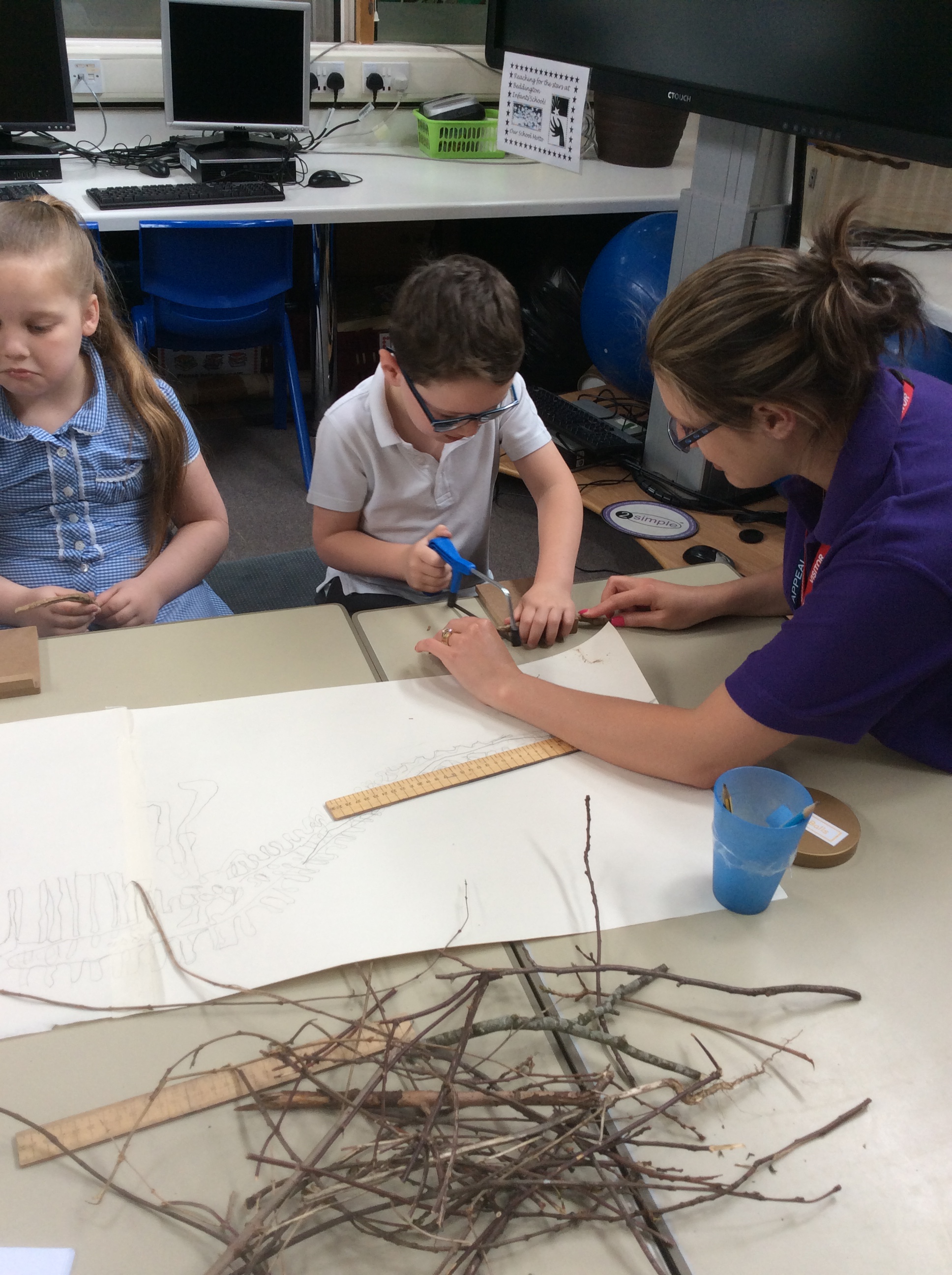 Year 2 created a dinosaur skeleton using sticks they collected from the outside area. They measured a bone in cm from a sketch they had drawn and cut sticks with a hacksaw to the correct length. The children explored a new skill with help from parent volunteers.