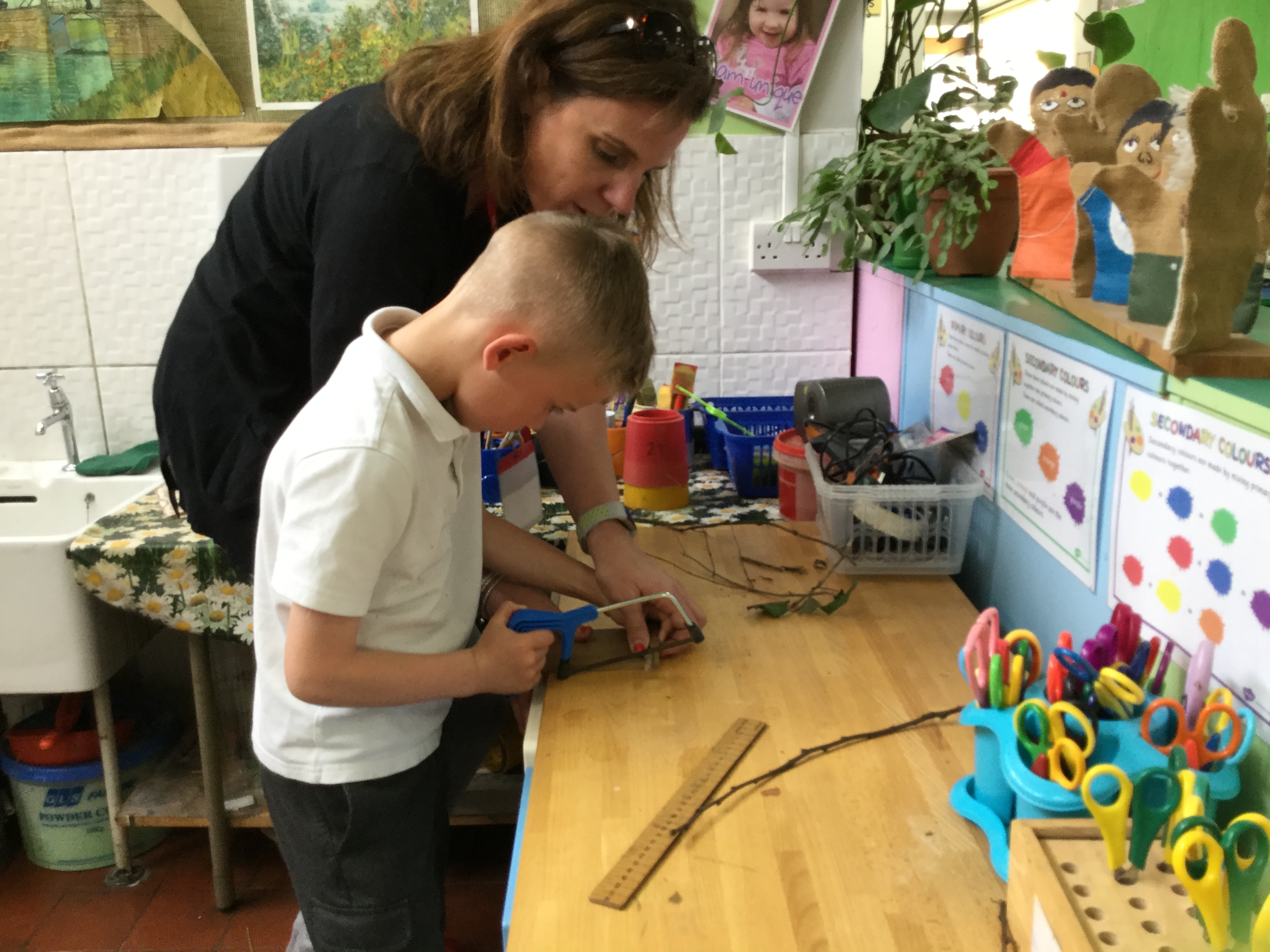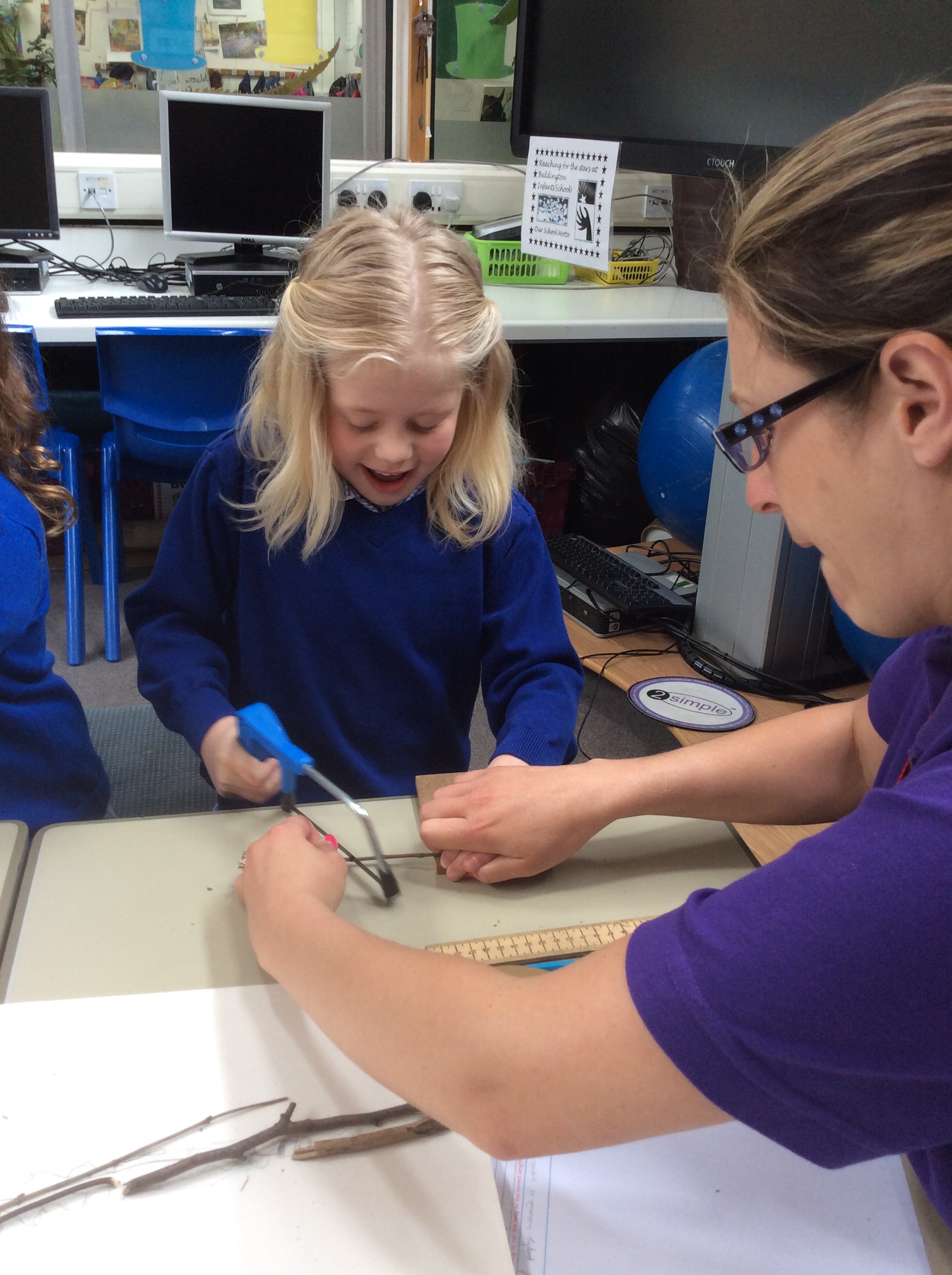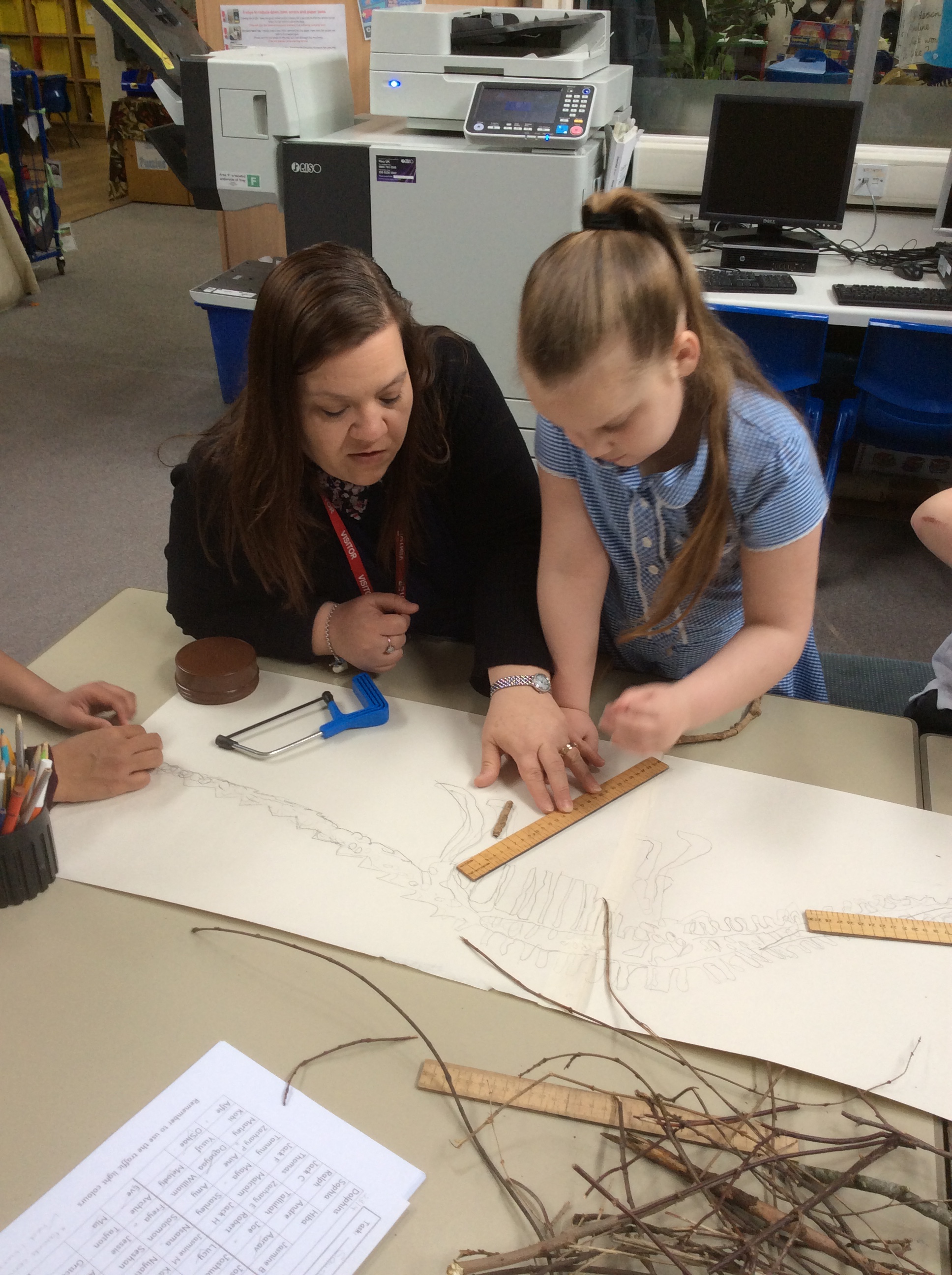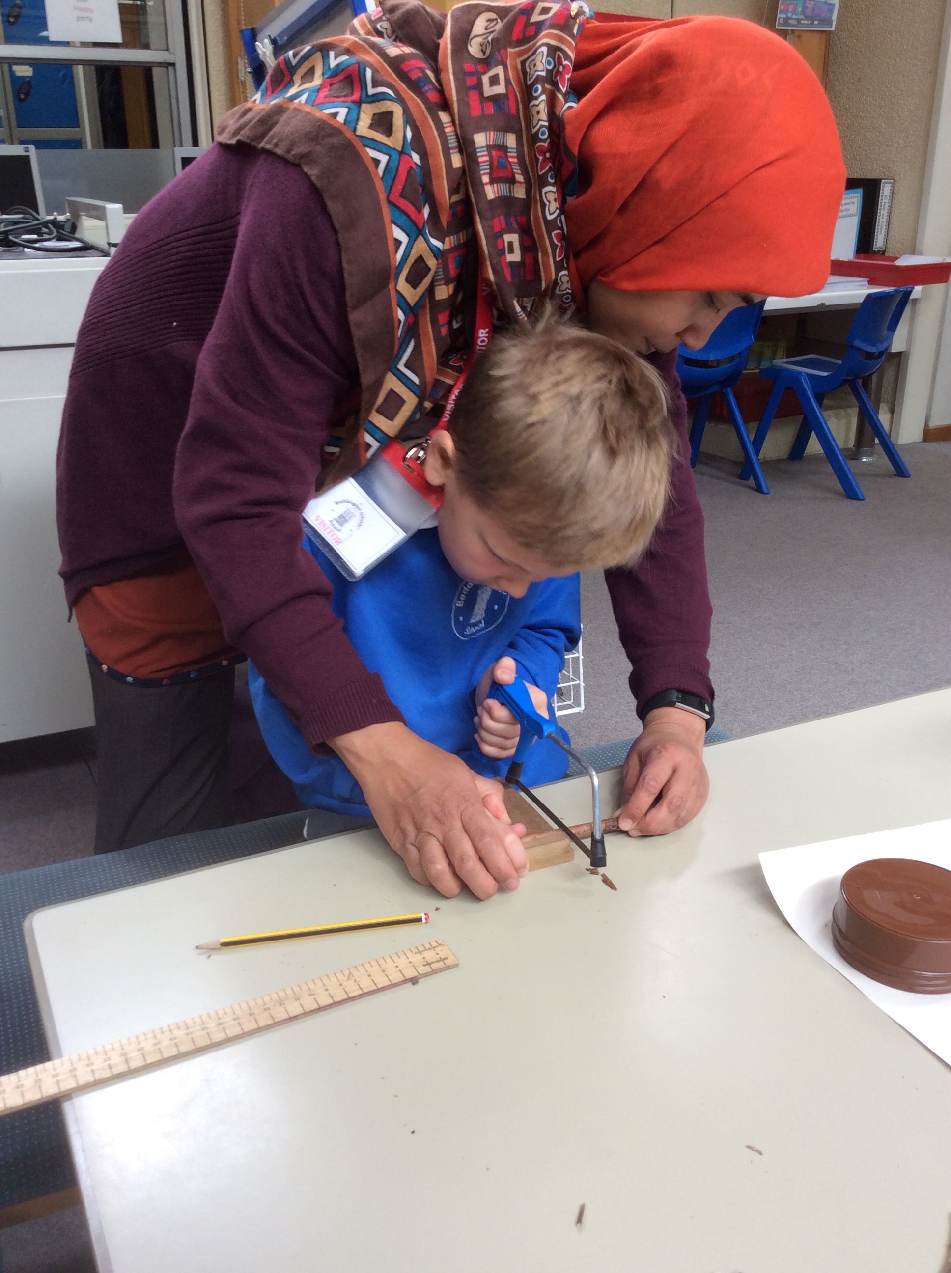 Year 2 created a dinosaur skeleton using sticks they collected from the outside area. They measured a bone in cm from a sketch they had drawn and cut sticks with a hacksaw to the correct length. The children explored a new skill with help from parent volunteers.