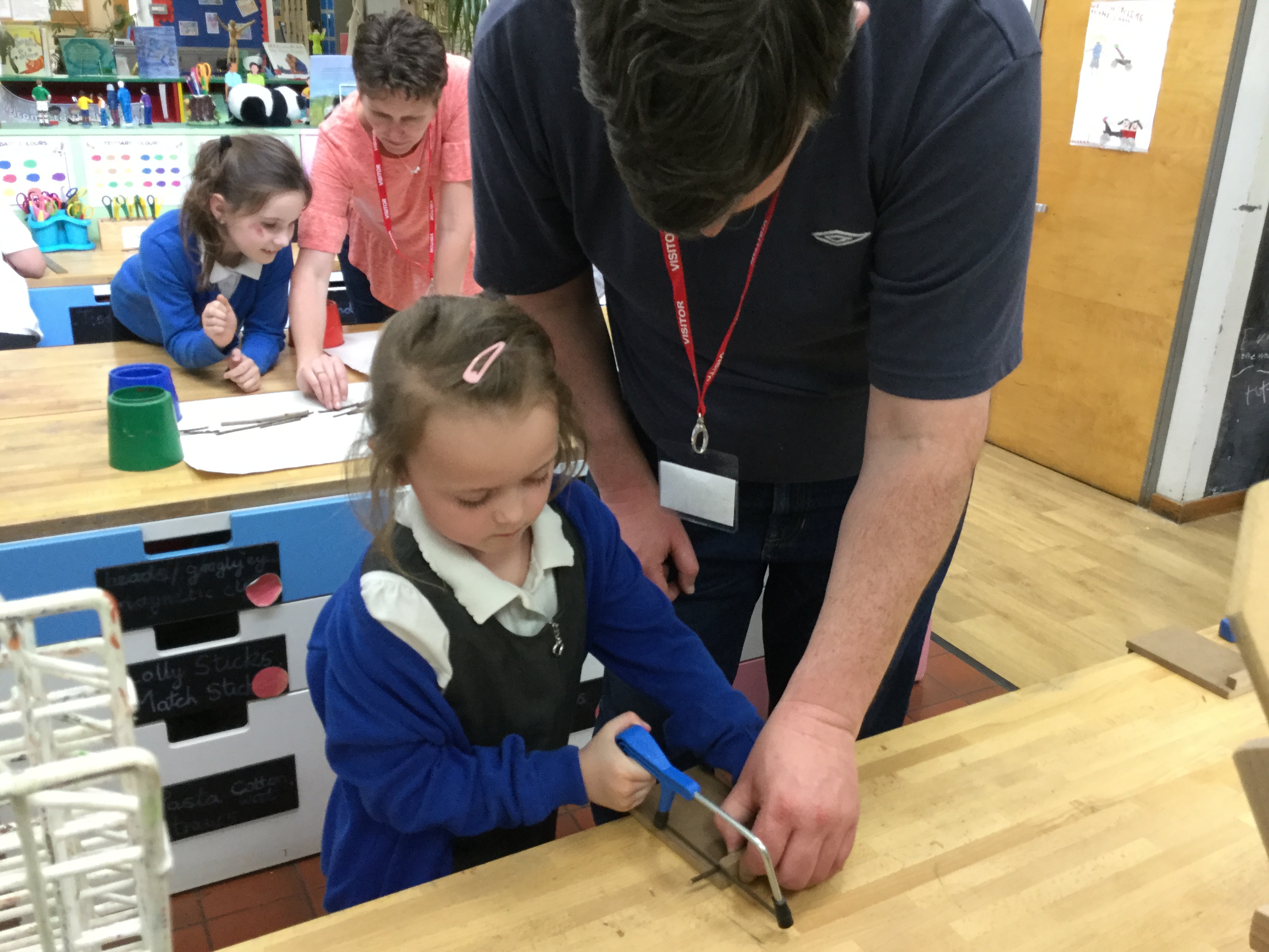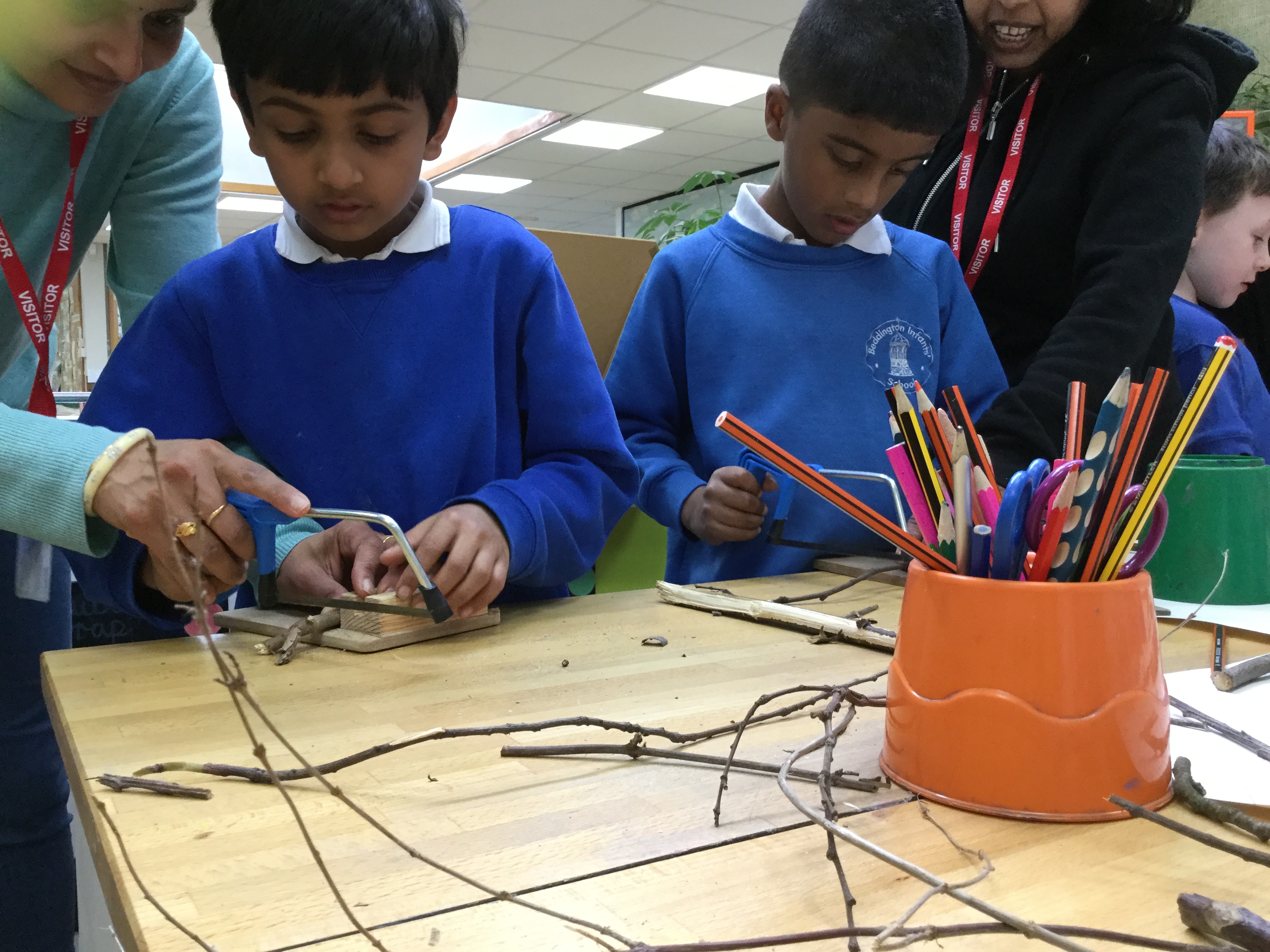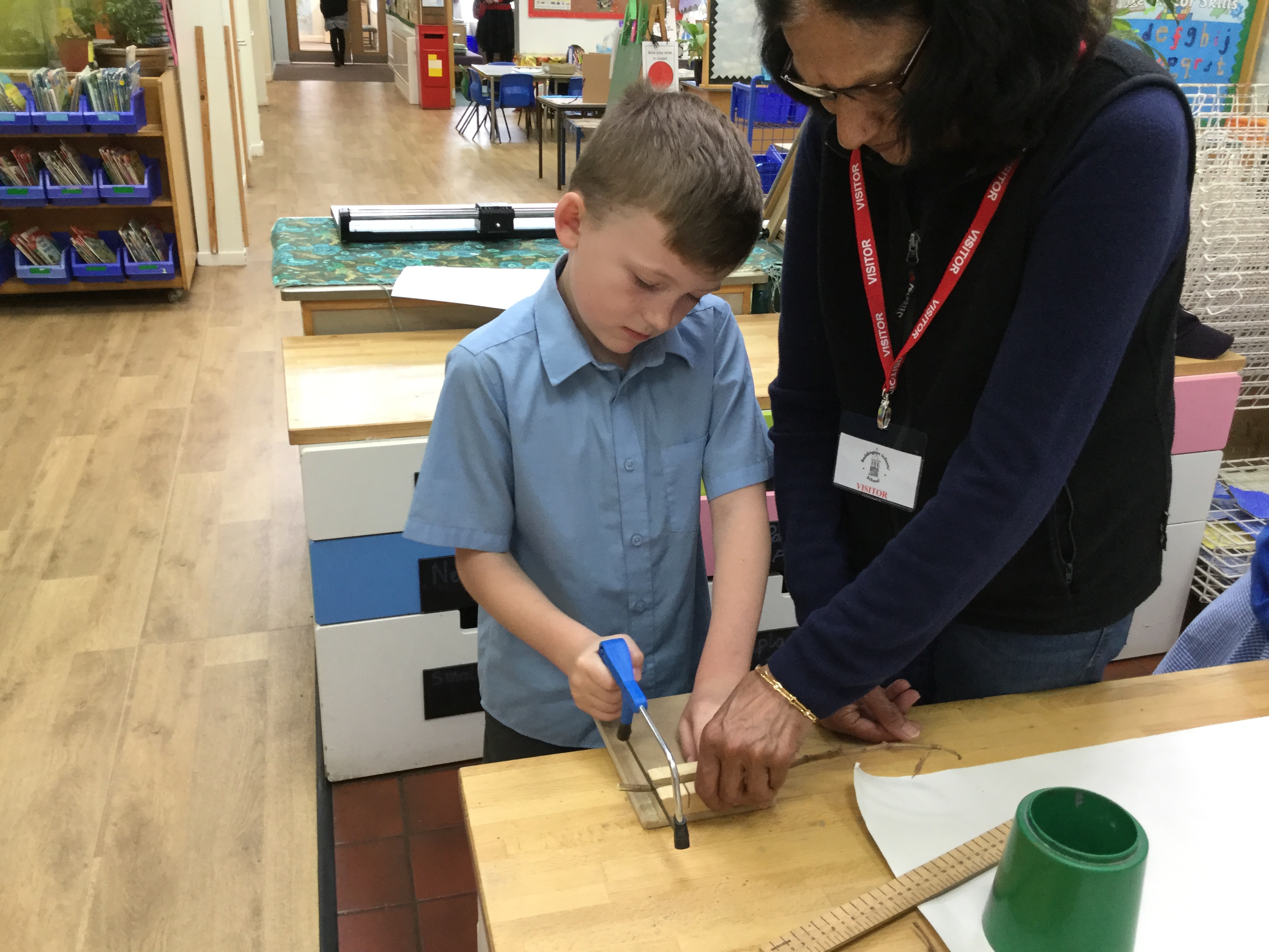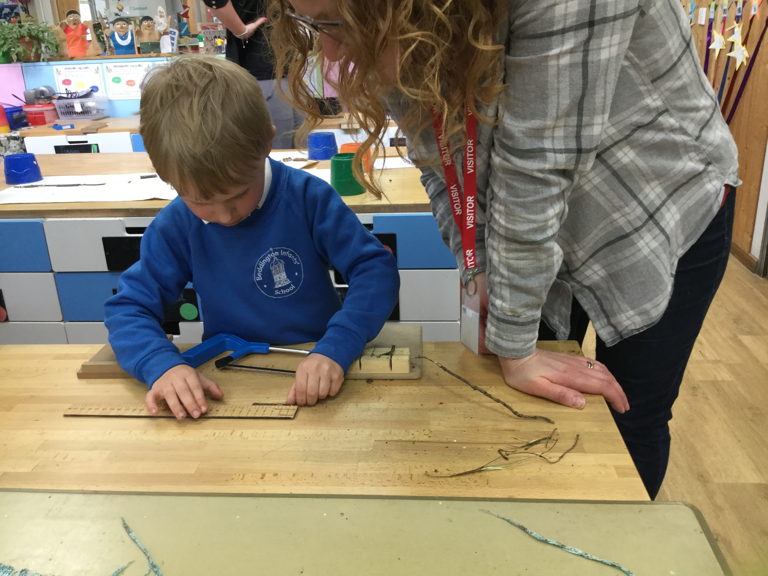 Year 2 created a dinosaur skeleton using sticks they collected from the outside area. They measured a bone in cm from a sketch they had drawn and cut sticks with a hacksaw to the correct length. The children explored a new skill with help from parent volunteers.