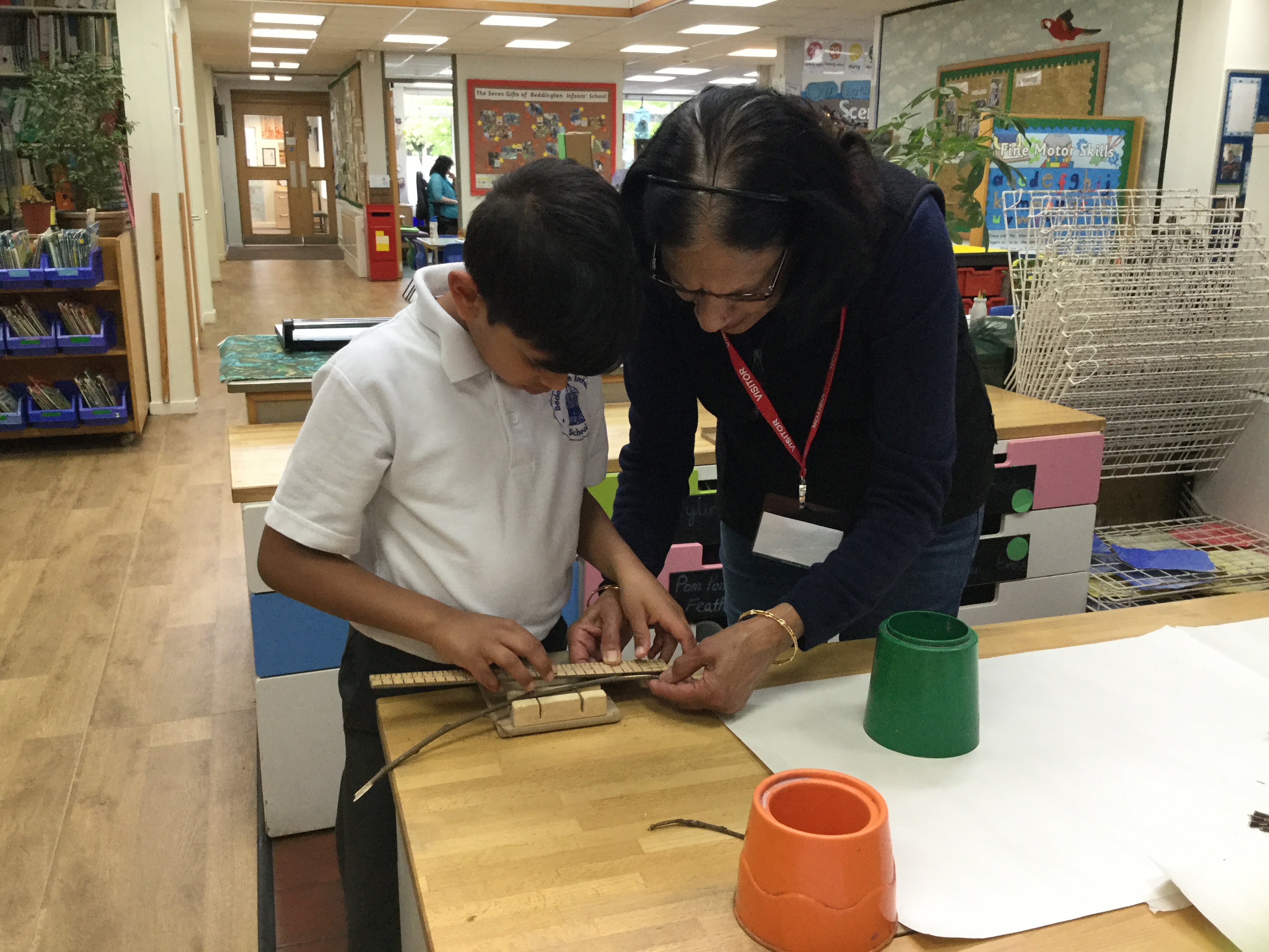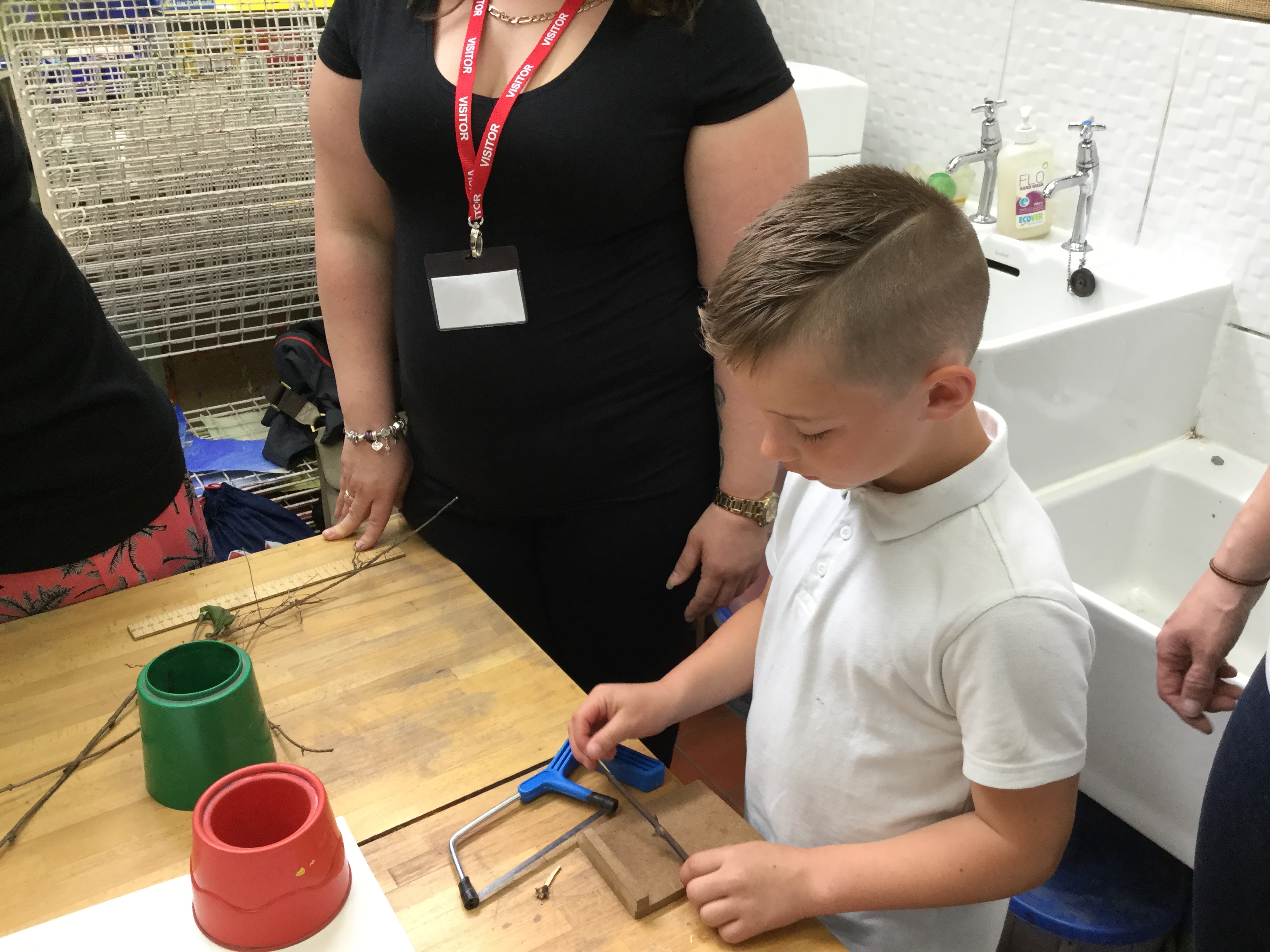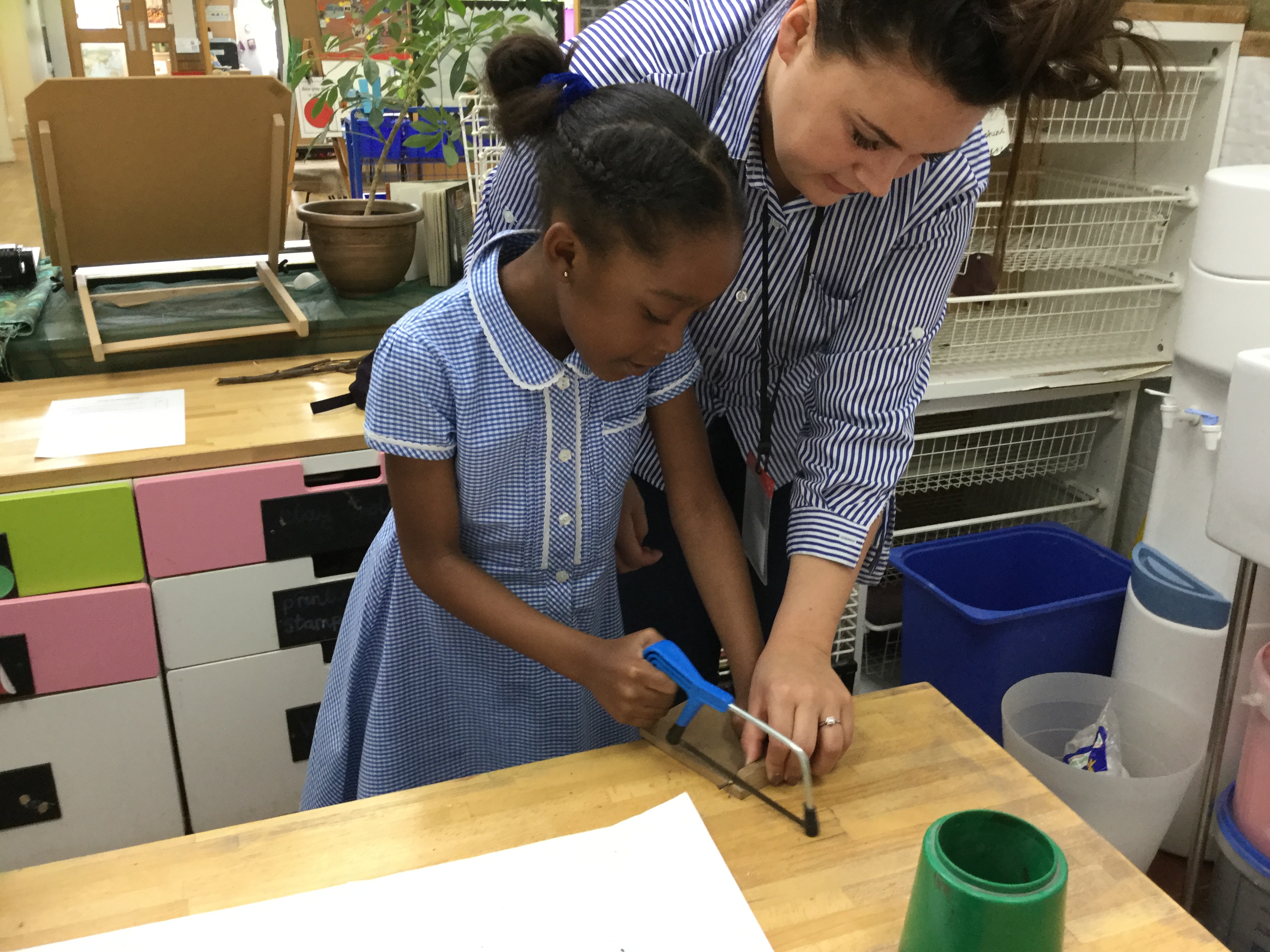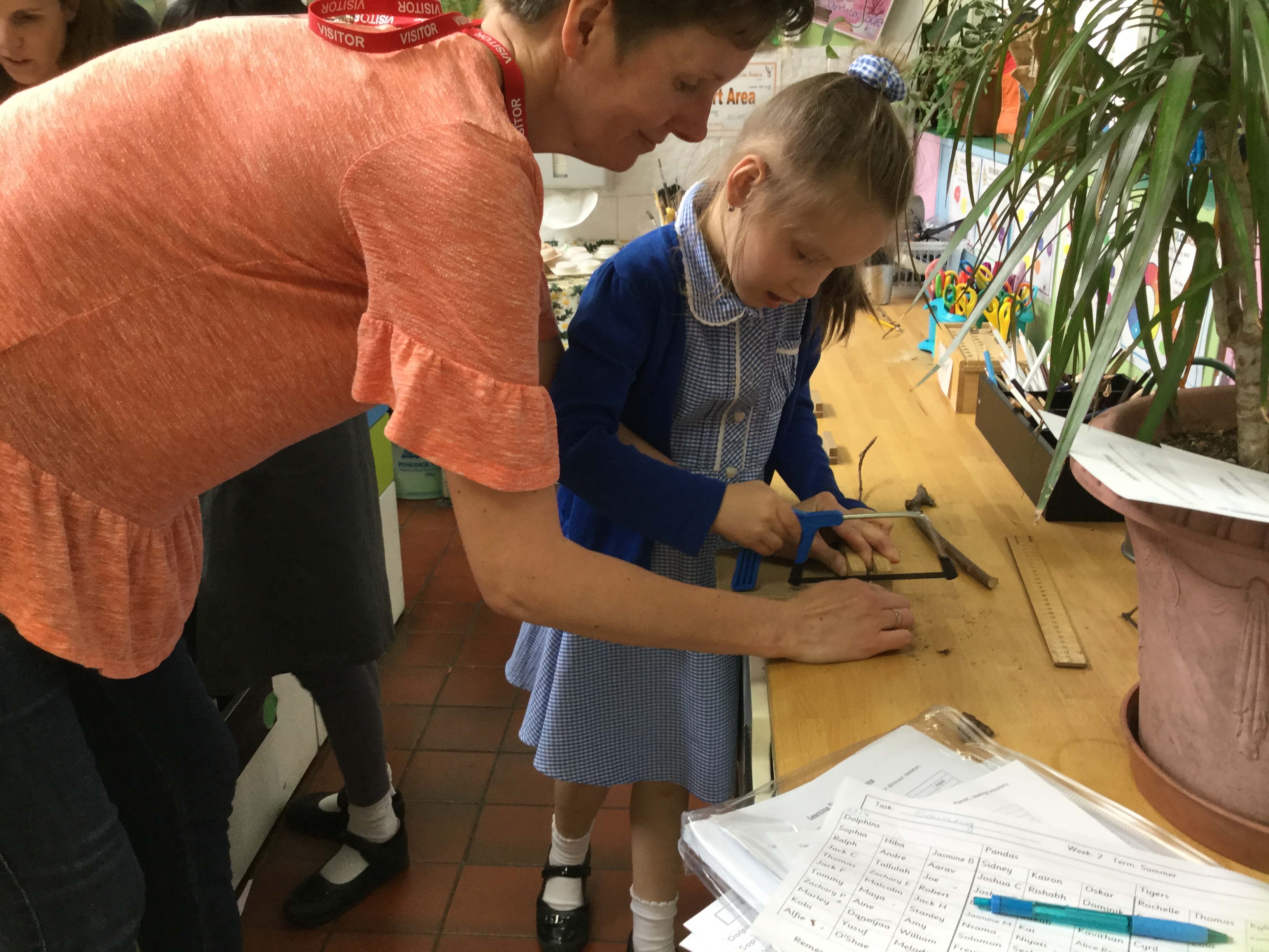 Year 2 created a dinosaur skeleton using sticks they collected from the outside area. They measured a bone in cm from a sketch they had drawn and cut sticks with a hacksaw to the correct length. The children explored a new skill with help from parent volunteers.