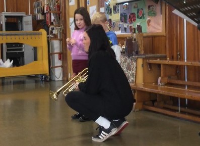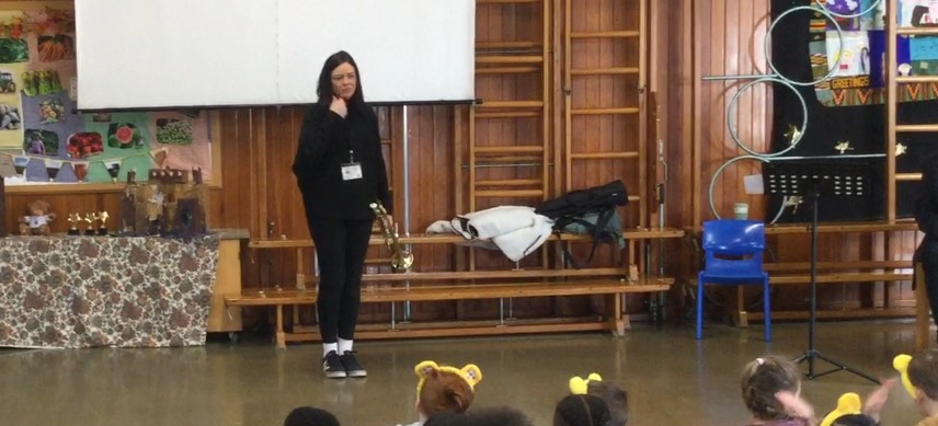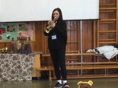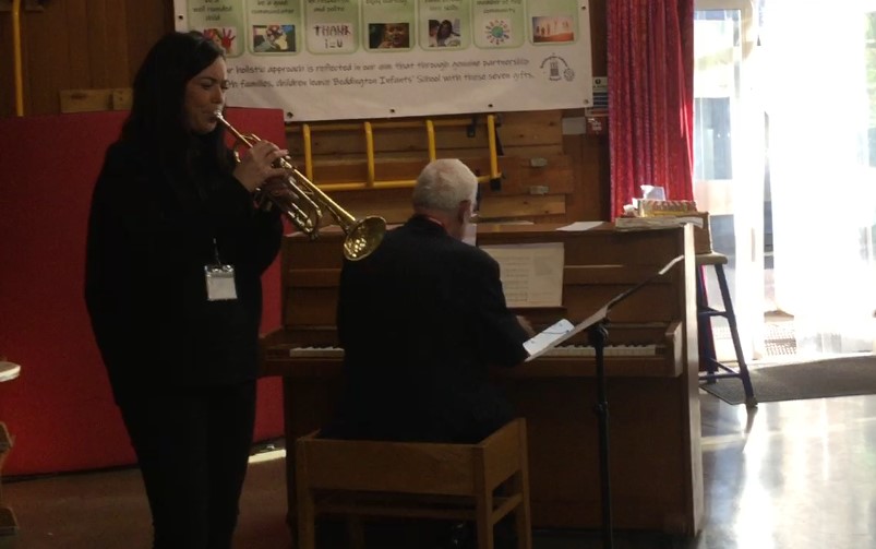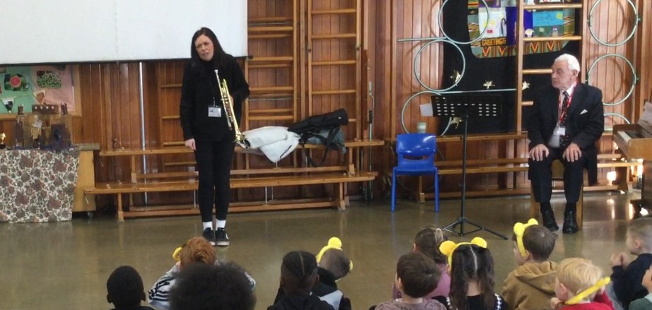 The children at Beddington Infants’ School were delighted to hear Victoria Isfryn, from Carshalton Brass Studio, play her trumpet, accompanied by Barry. Victoria talked about how brass instruments make sound. We were delighted to welcome her to assembly. Some children experienced playing the trumpet, learning how to blow into a trumpet so it made a noise.