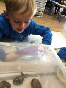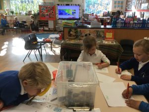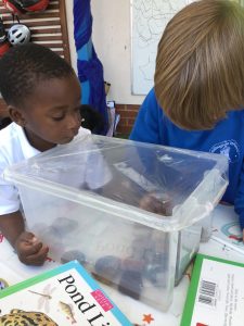 The children found a frog near the sandpit in out outdoor area. An adult helped us to bring it into class for a little while so that we could observe it. We learned lots about the frog’s life cycle and habitat. We think it loves in our school pond. We drew frog pictures and wrote facts to make our own book about frogs. We took the frog back to where we found it to release it.