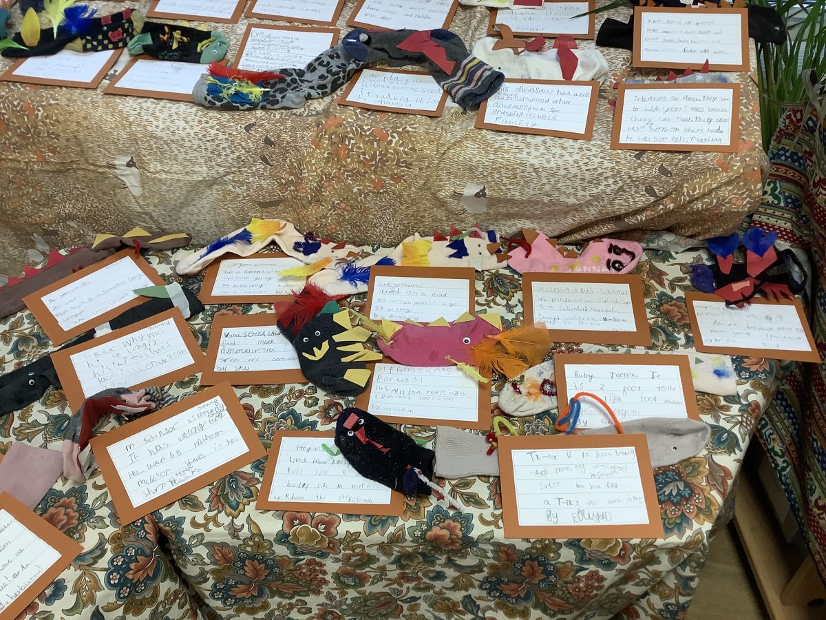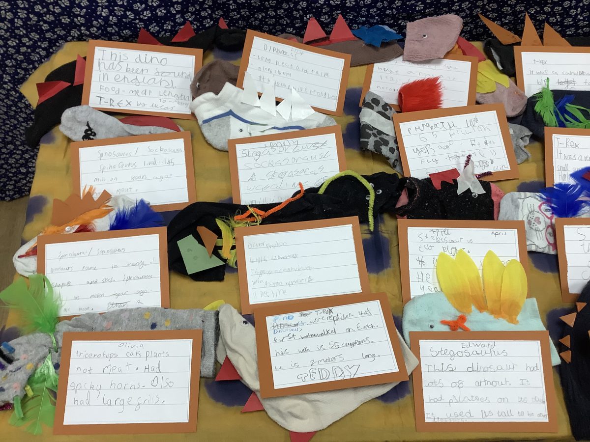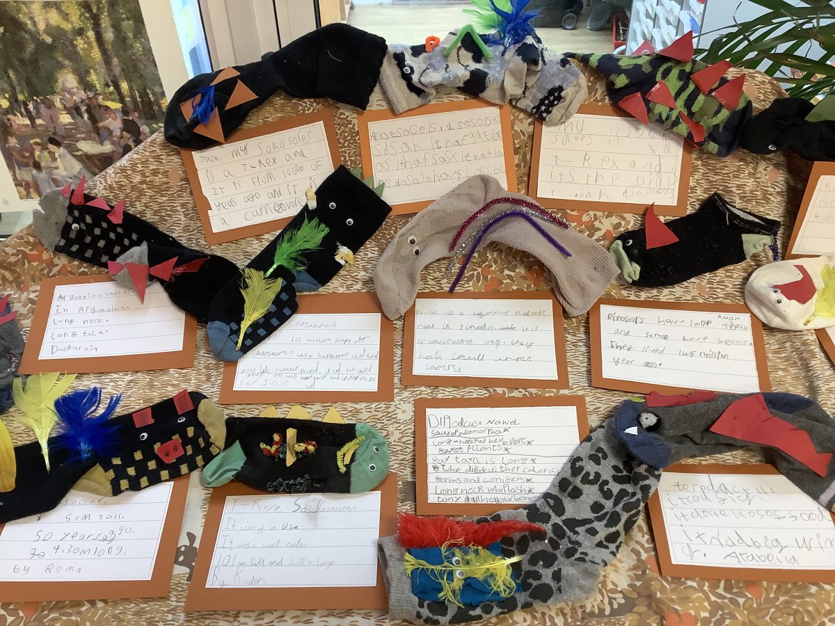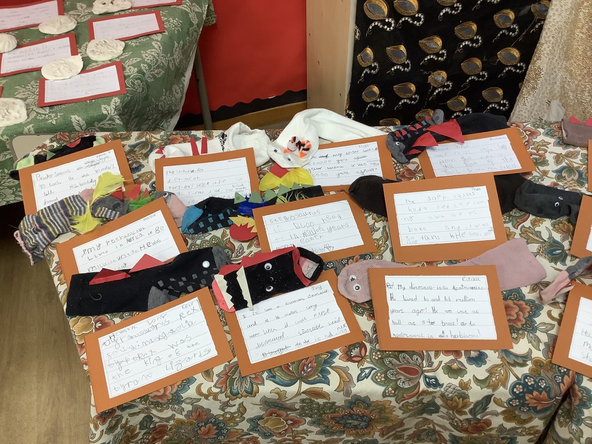 The children in Year 2 were delighted to set up their artifacts for their dinosaur museum. Each child created a salt dough fossil and sock puppet sockosaurus. The children made information labels about their exhibits so visitors would learn lots of new facts about dinosaurs. They invited their family and friends and were delighted when the museum finally opened.