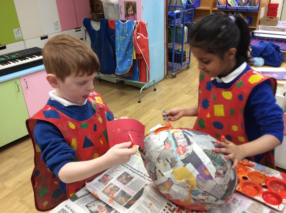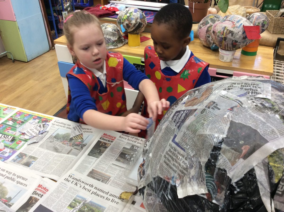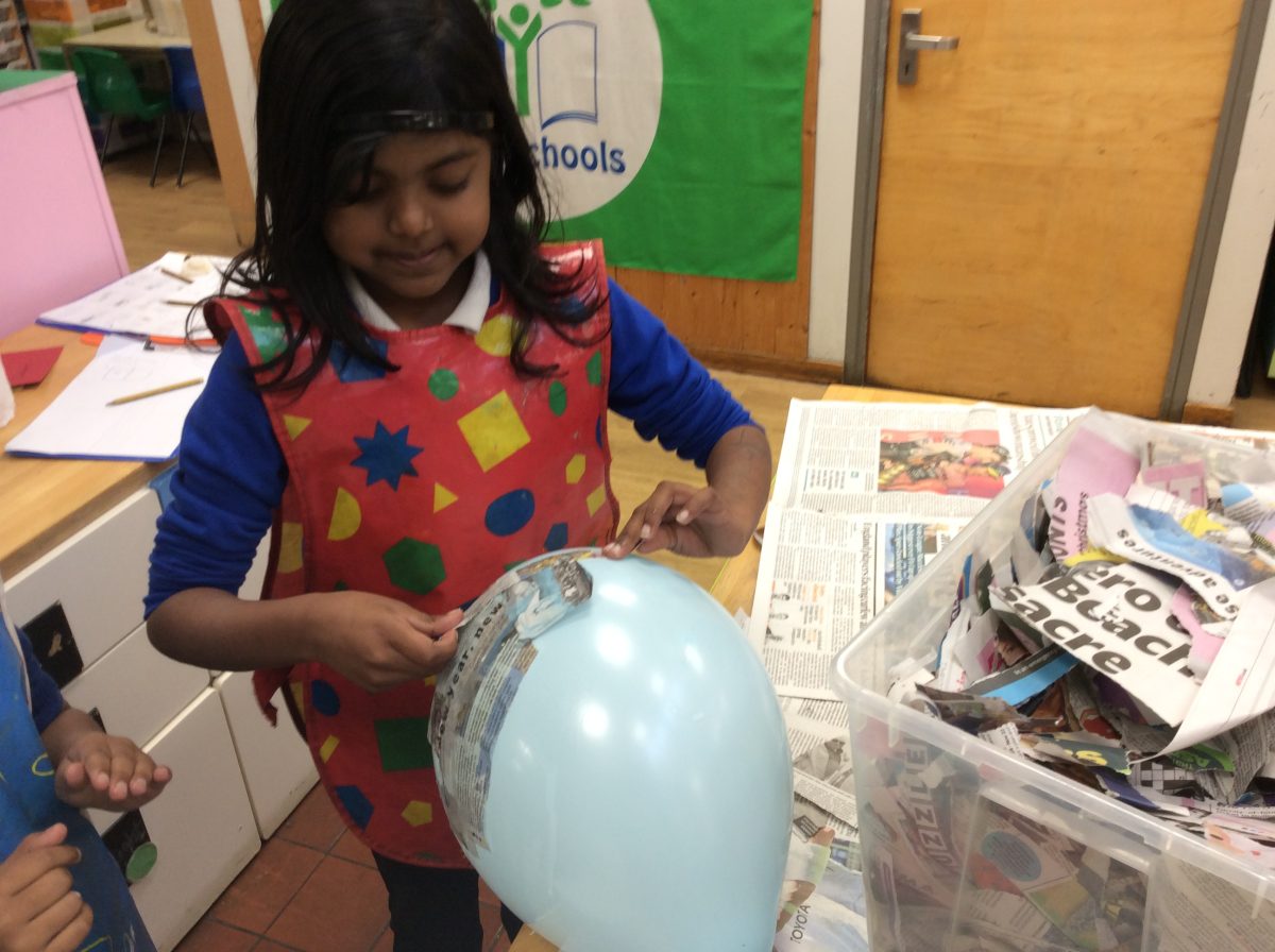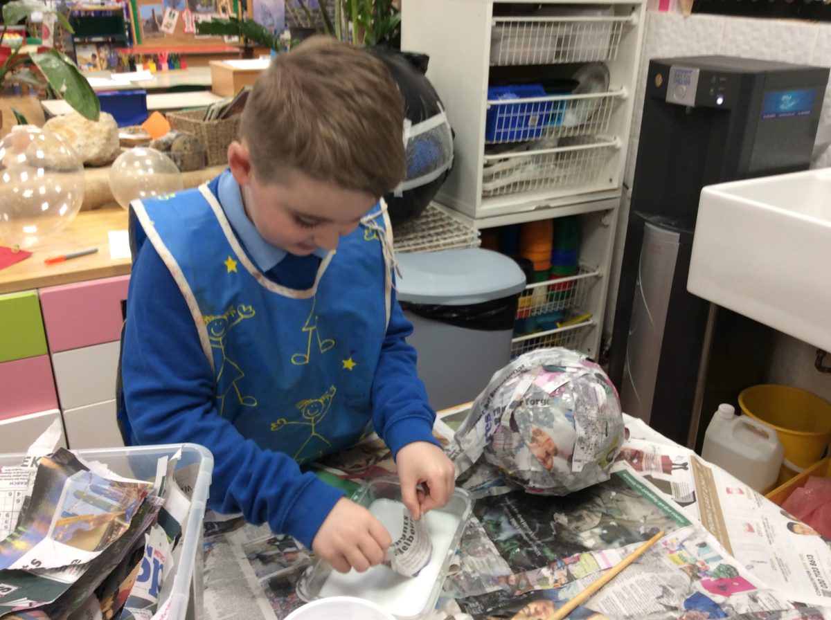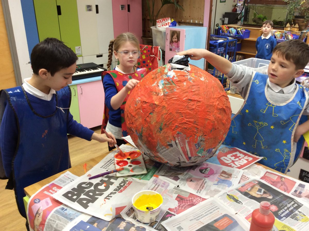 Having explored how the planets orbit the sun, the children in Year 2 co-operated as a year group, using the technique of papier mache to create their own Solar System.
