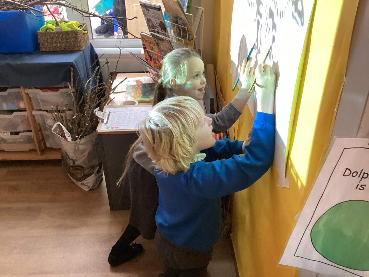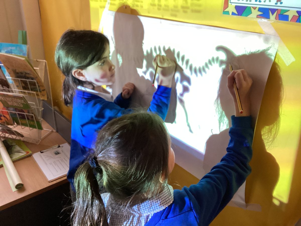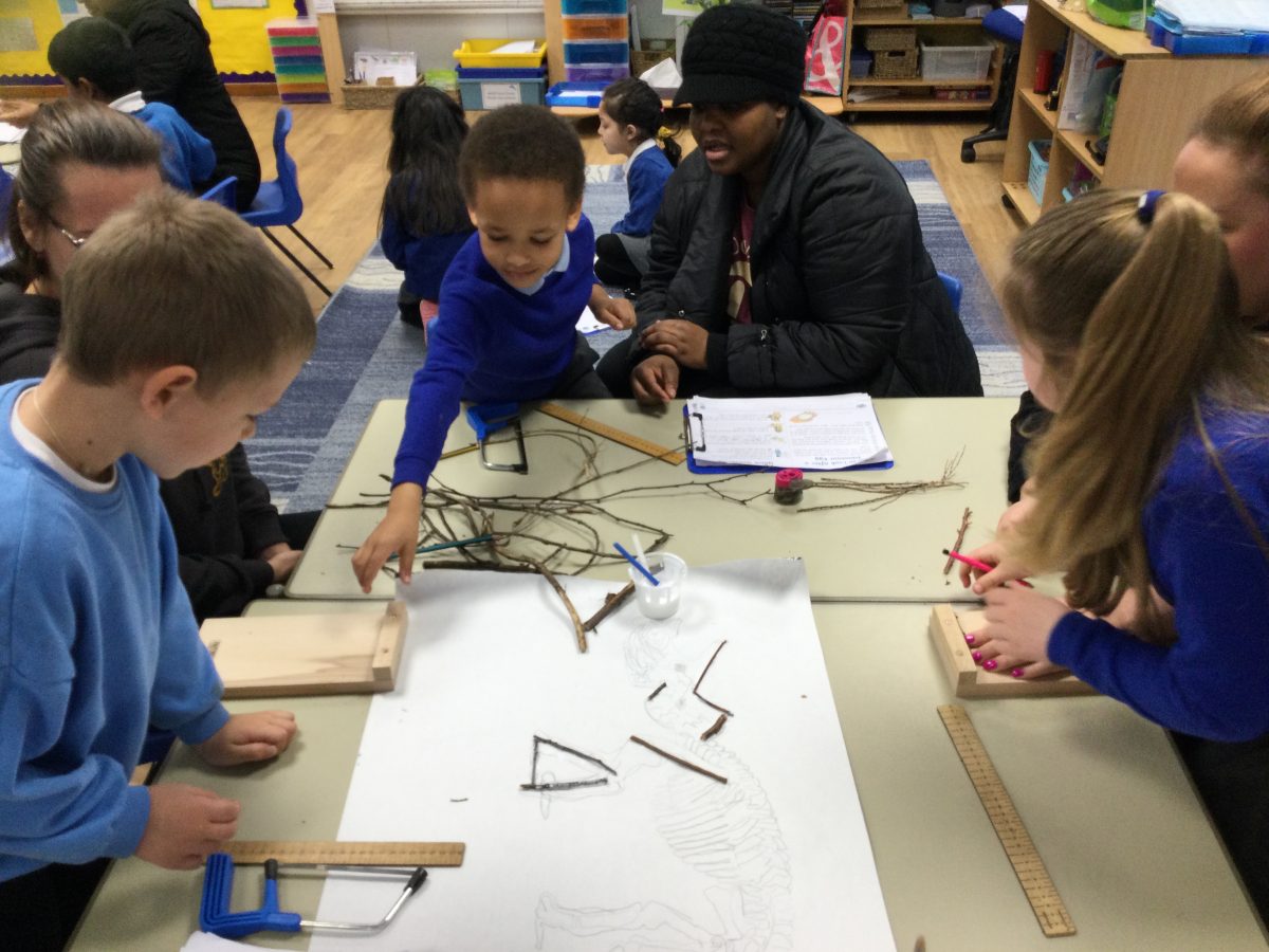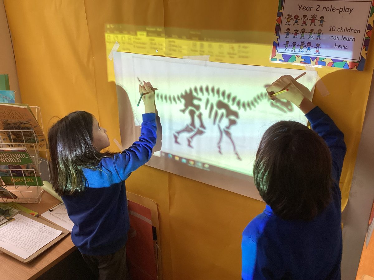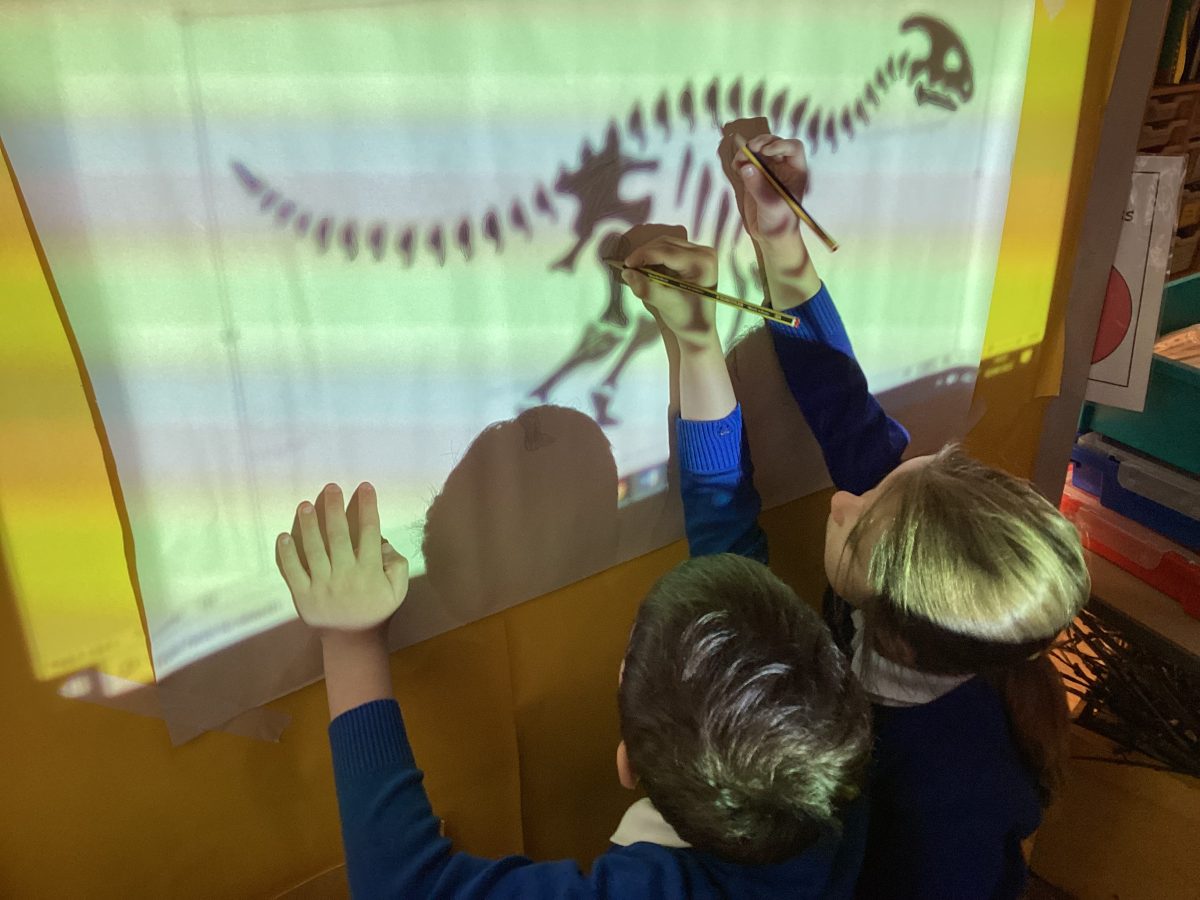 The children in Year 2 have created dinosaur skeletons using sticks they collected from the outside area. First they used a projector to display an image of a dinosaur skeleton on the wall, then they carefully traced over it.
