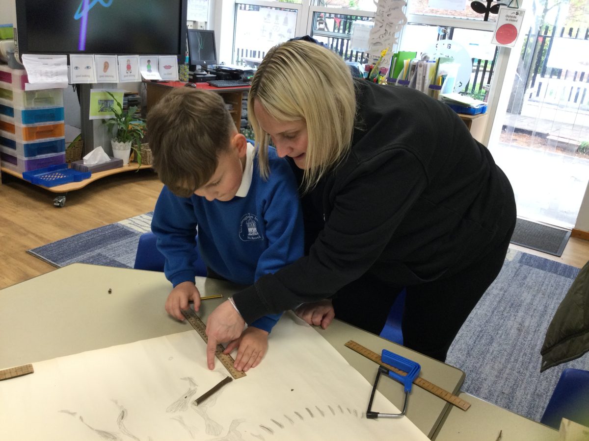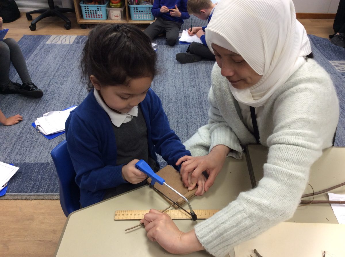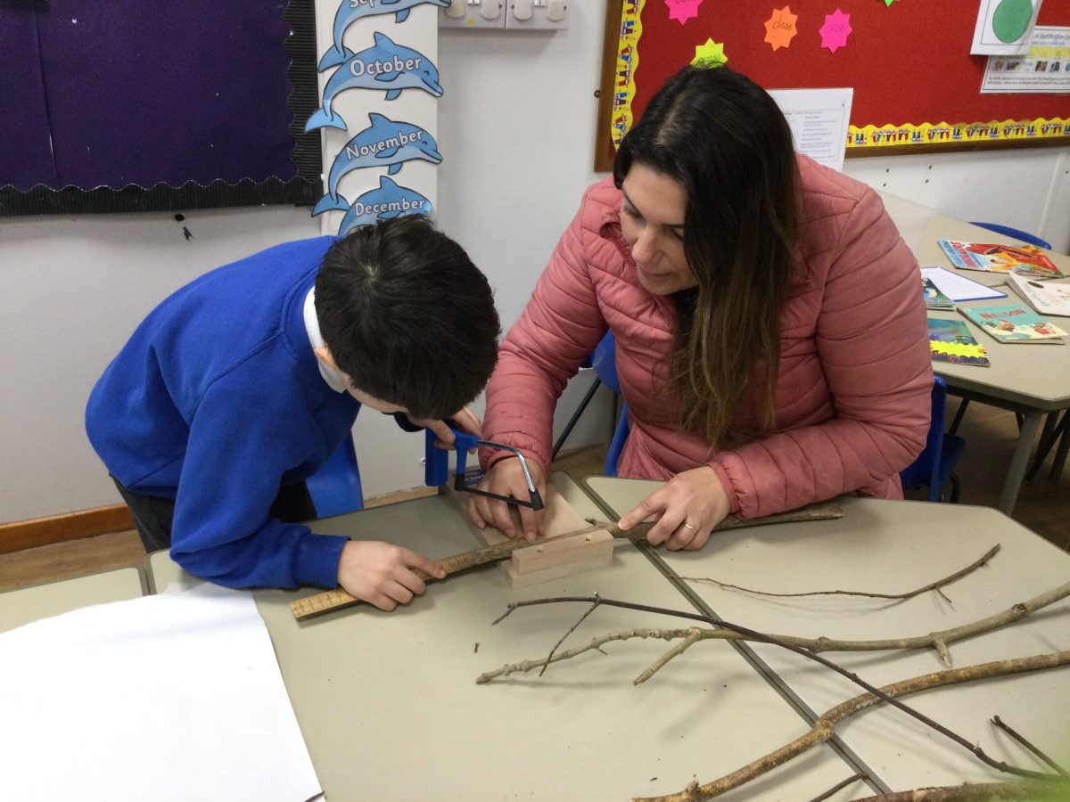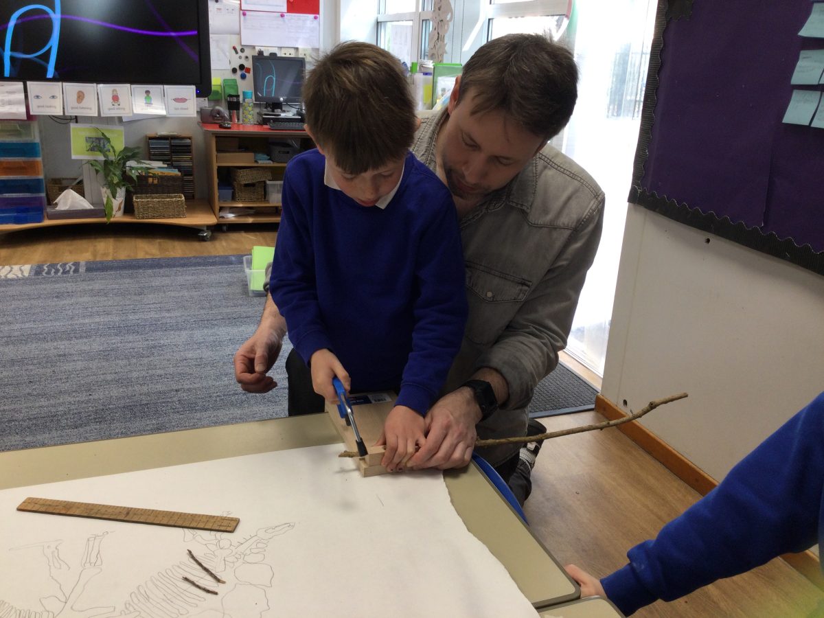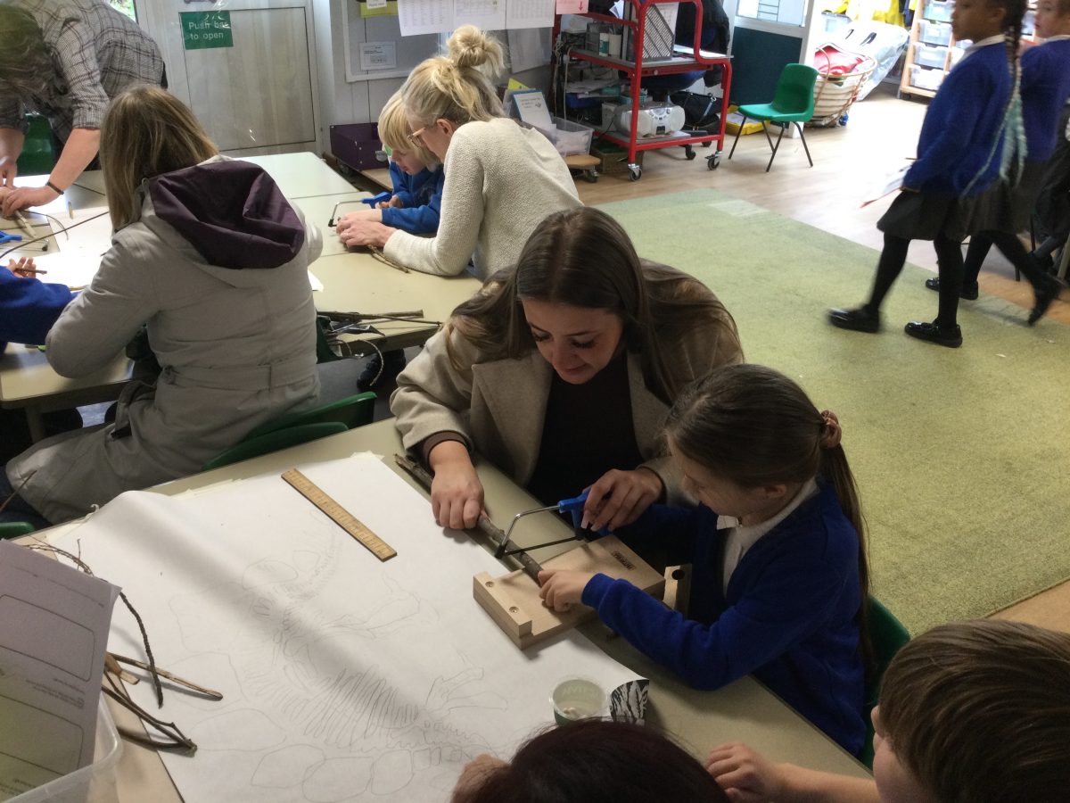 Family members came into school to find out about the maths learning that happens in Year 2. Then the children and grown-ups measured a bone in cm from the drawings that had been created. They marked that measurement on a stick. With support from adults, the children used the new skill of sawing to make their stick the correct length to match the bone.