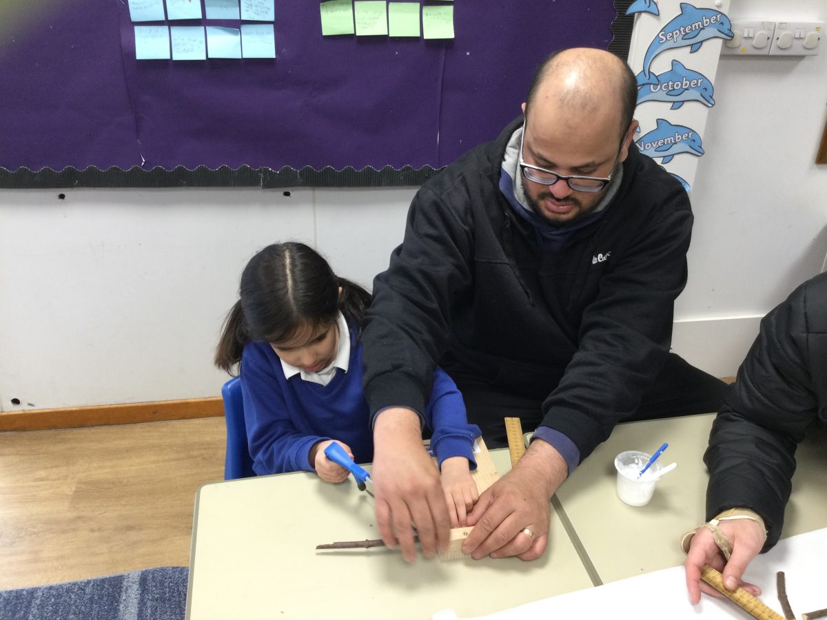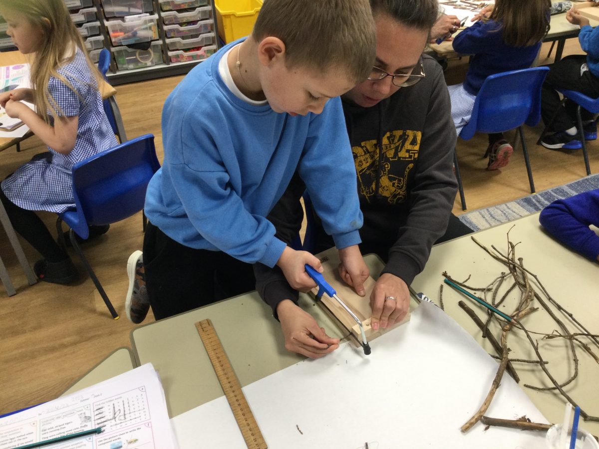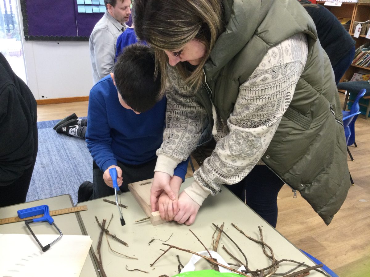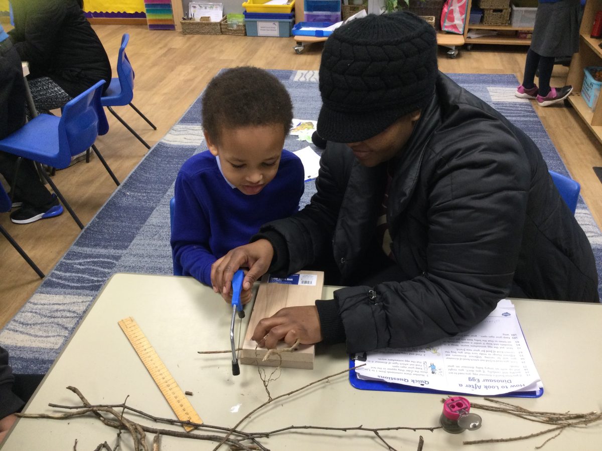 Family members came into school to find out about the maths learning that happens in Year 2. Then the children and grown-ups measured a bone in cm from the drawings that had been created. They marked that measurement on a stick. With support from adults, the children used the new skill of sawing to make their stick the correct length to match the bone.
