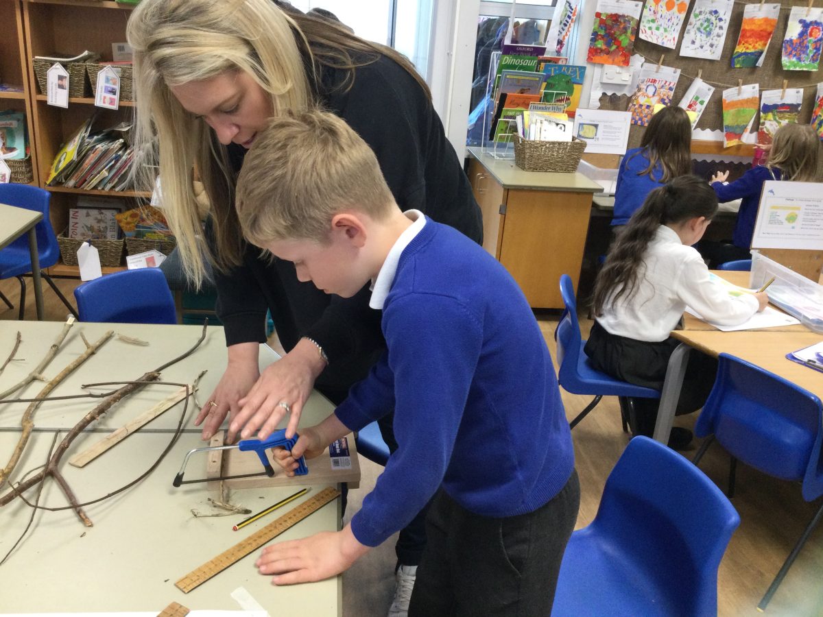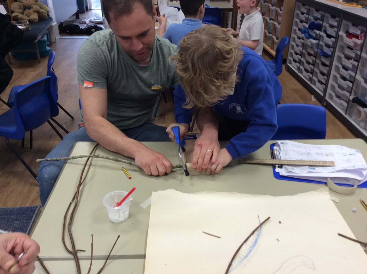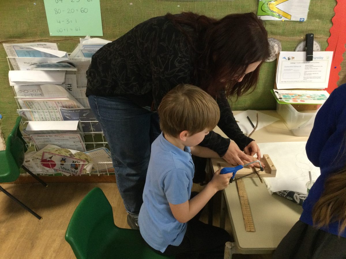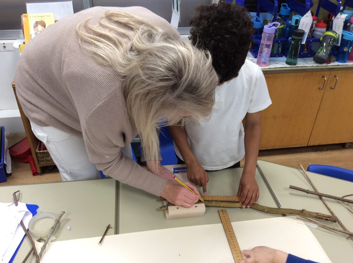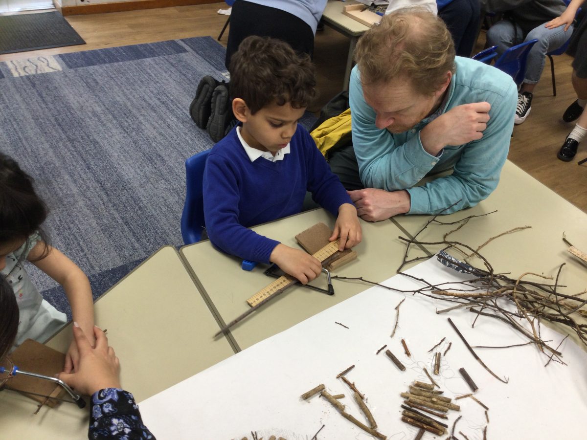 Family members came into school to find out about the maths learning that happens in Year 2. Then the children and grown-ups measured a bone in cm from the drawings that had been created. They marked that measurement on a stick. With support from adults, the children used the new skill of sawing to make their stick the correct length to match the bone.
