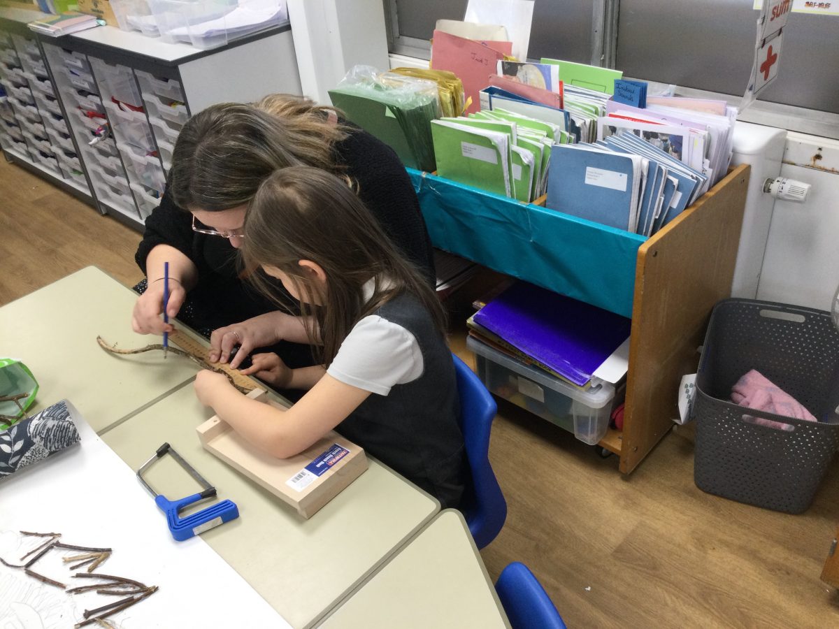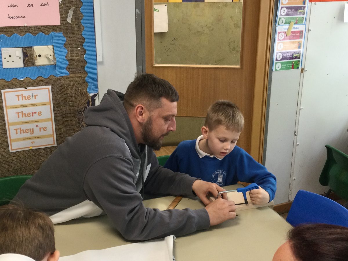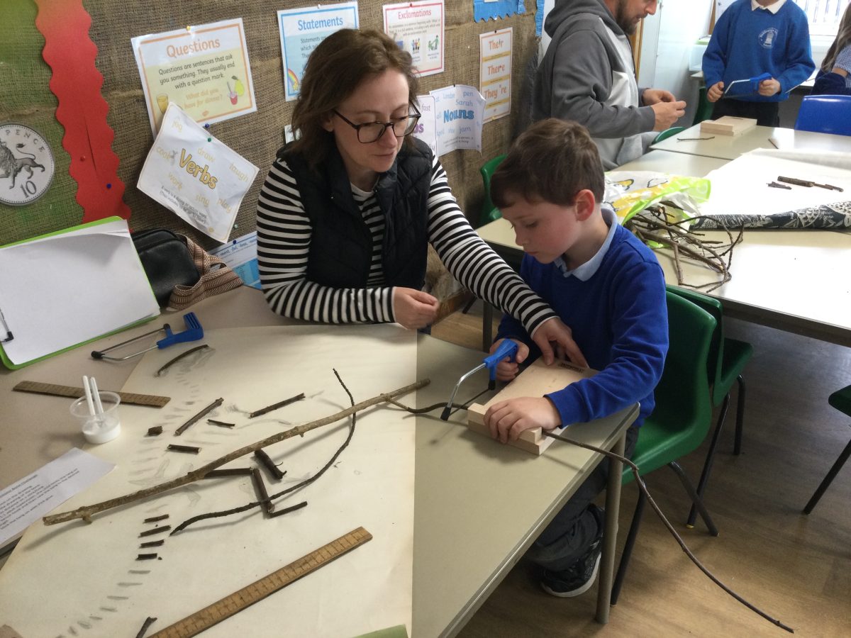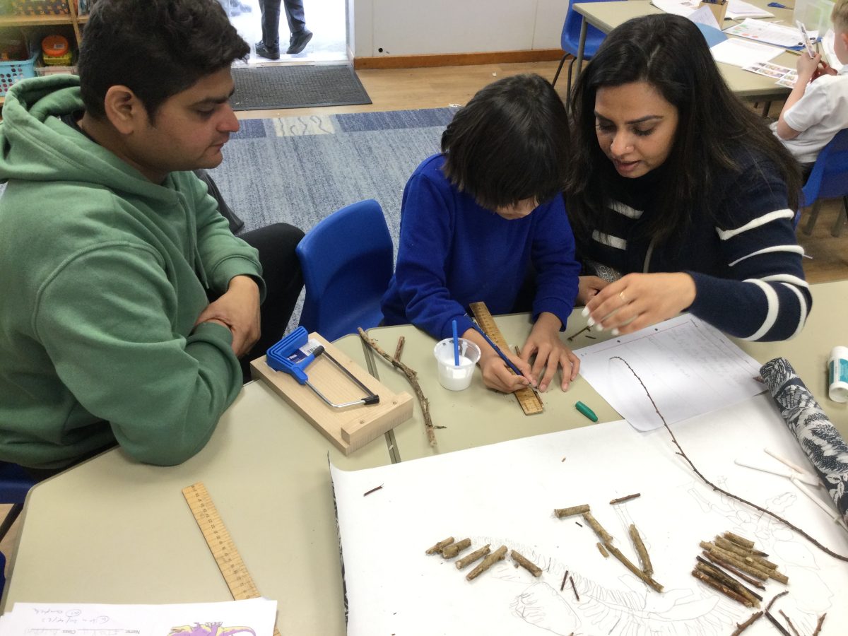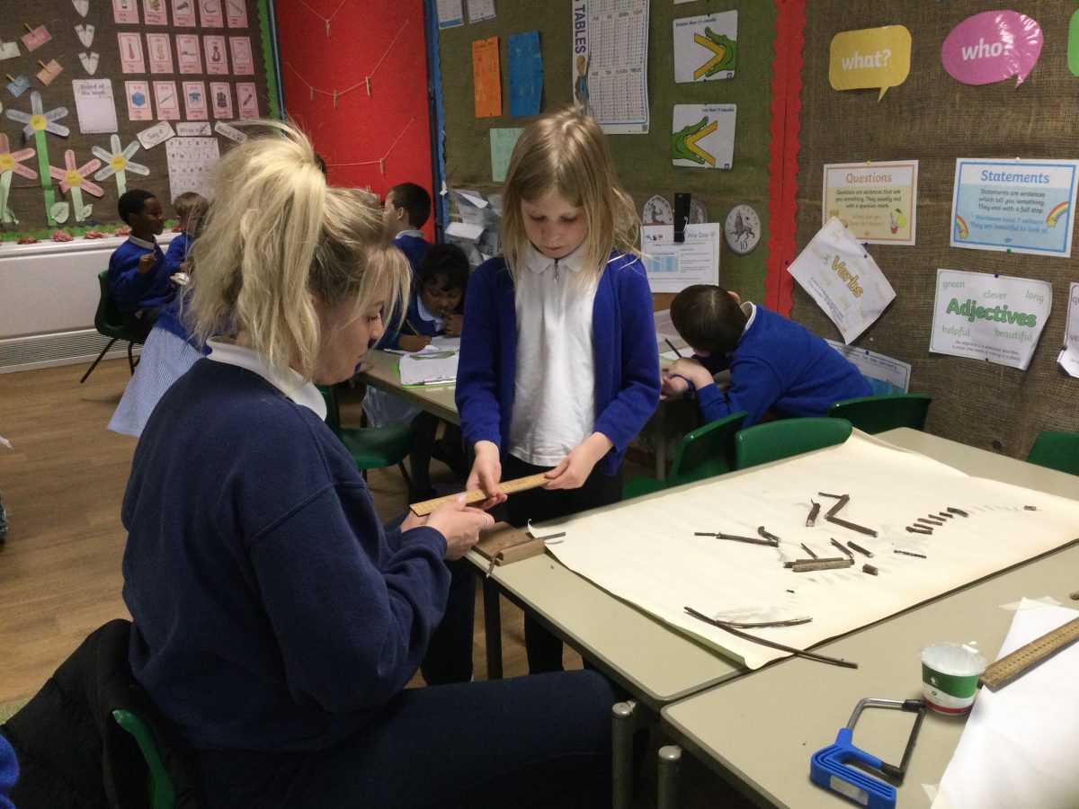 Family members came into school to find out about the maths learning that happens in Year 2. Then the children and grown-ups measured a bone in cm from the drawings that had been created. They marked that measurement on a stick. With support from adults, the children used the new skill of sawing to make their stick the correct length to match the bone.