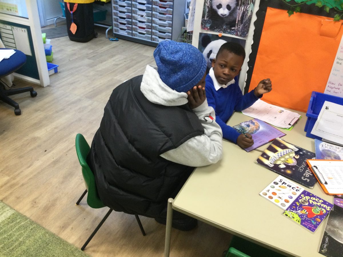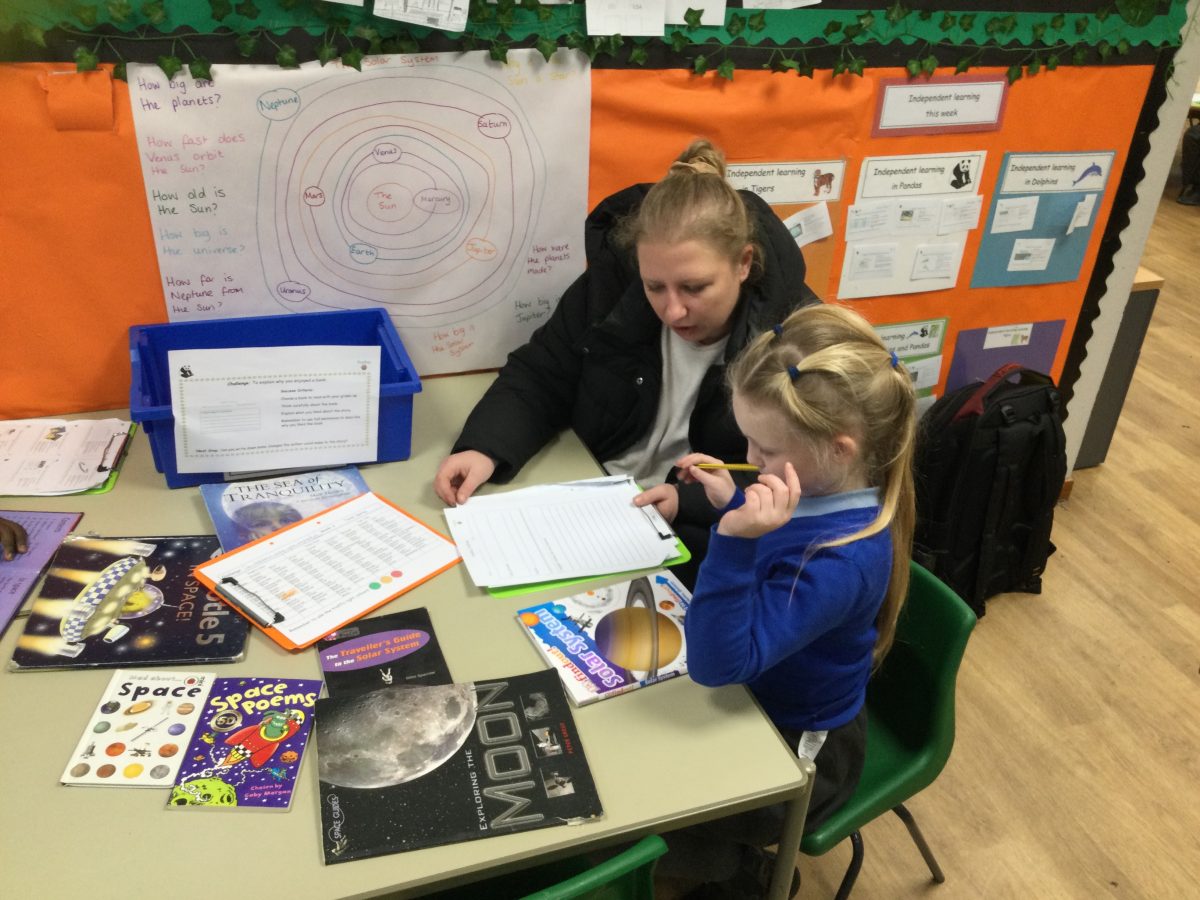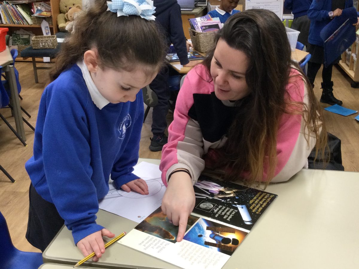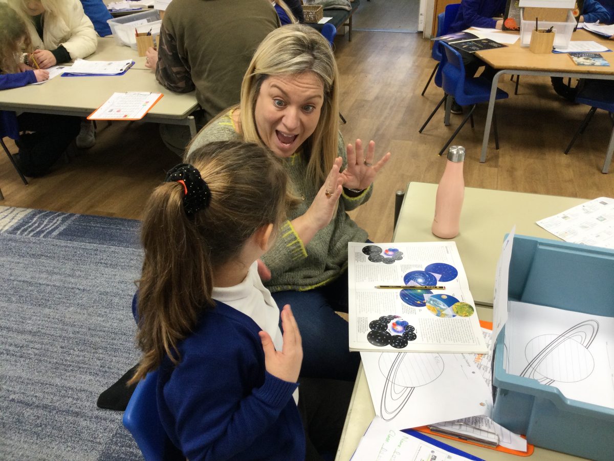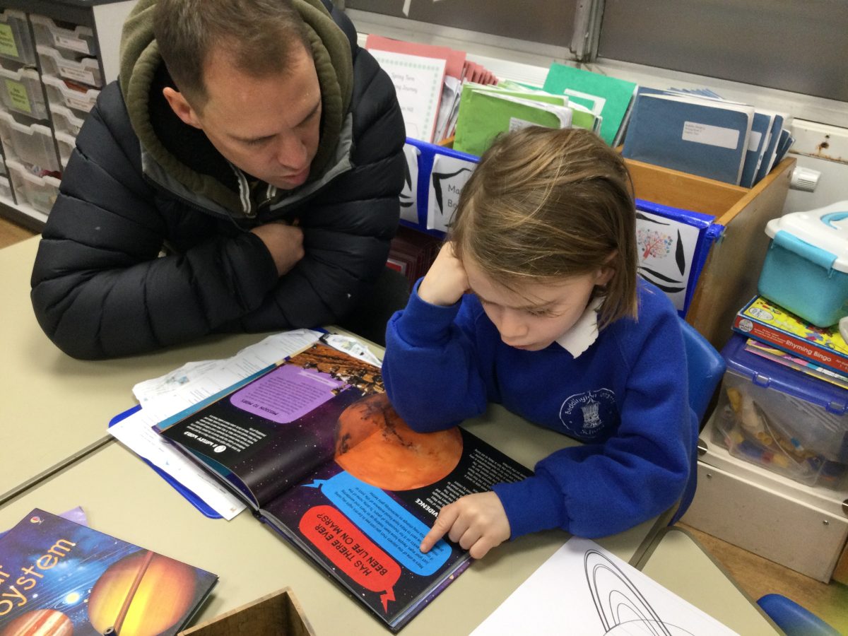 The children in Year 2 were excited to invite their grown-ups into school for the Space Reading Learning Together Session. The grown-ups learned about how reading skills are taught and developed in school. Then the grown-ups and children completed reading challenges together, all based on Space, across the Year 2 Learning Environment.