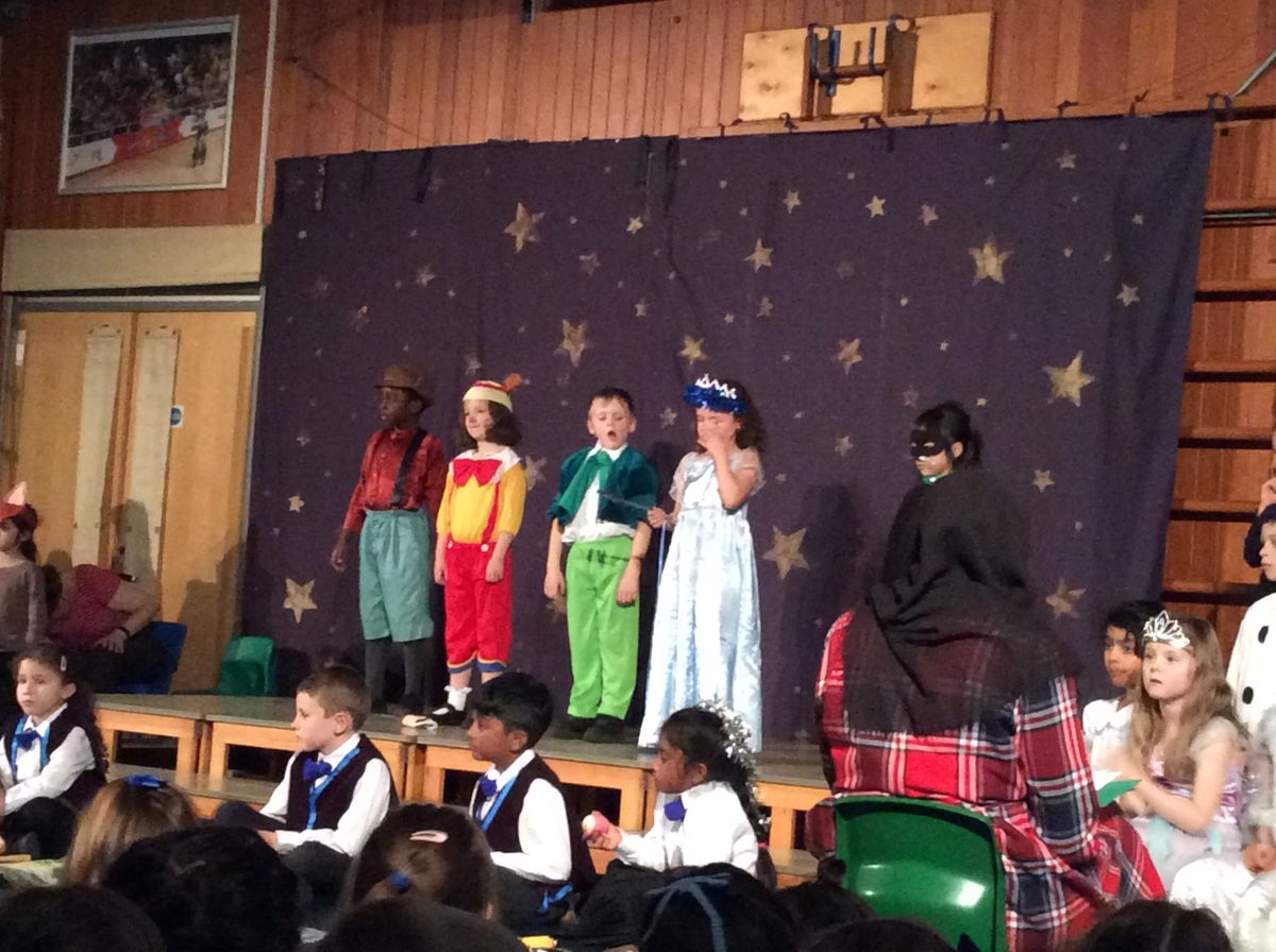 The Year 2 children were delighted to present the story of Pinocchio. The children chose which character they would like to play in the story; there were puppets, snow people, cats, fairies, wizards, foxes, children, narrators and members of the band. These was of course also Pinocchio, Geppetto, Figaro, a Teacher and the Blue Fairy.
