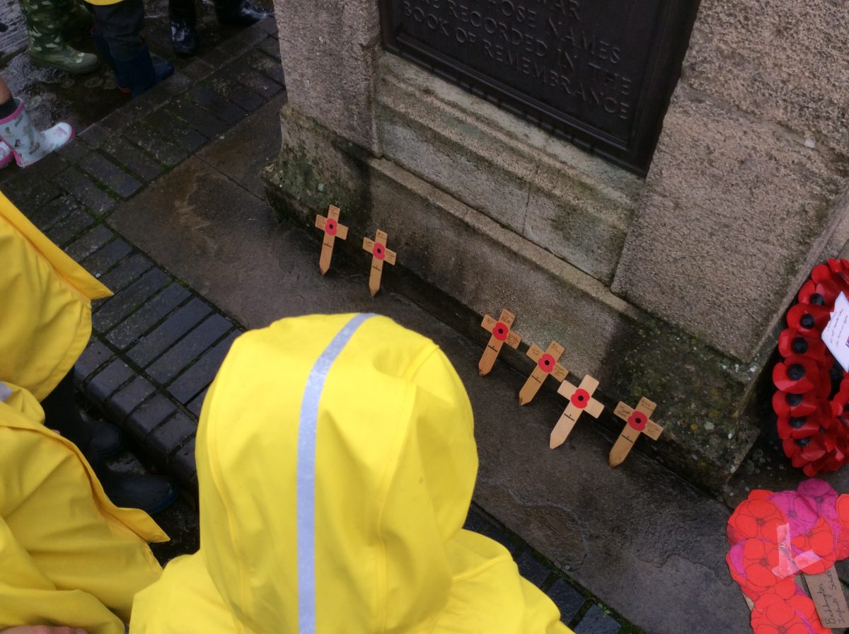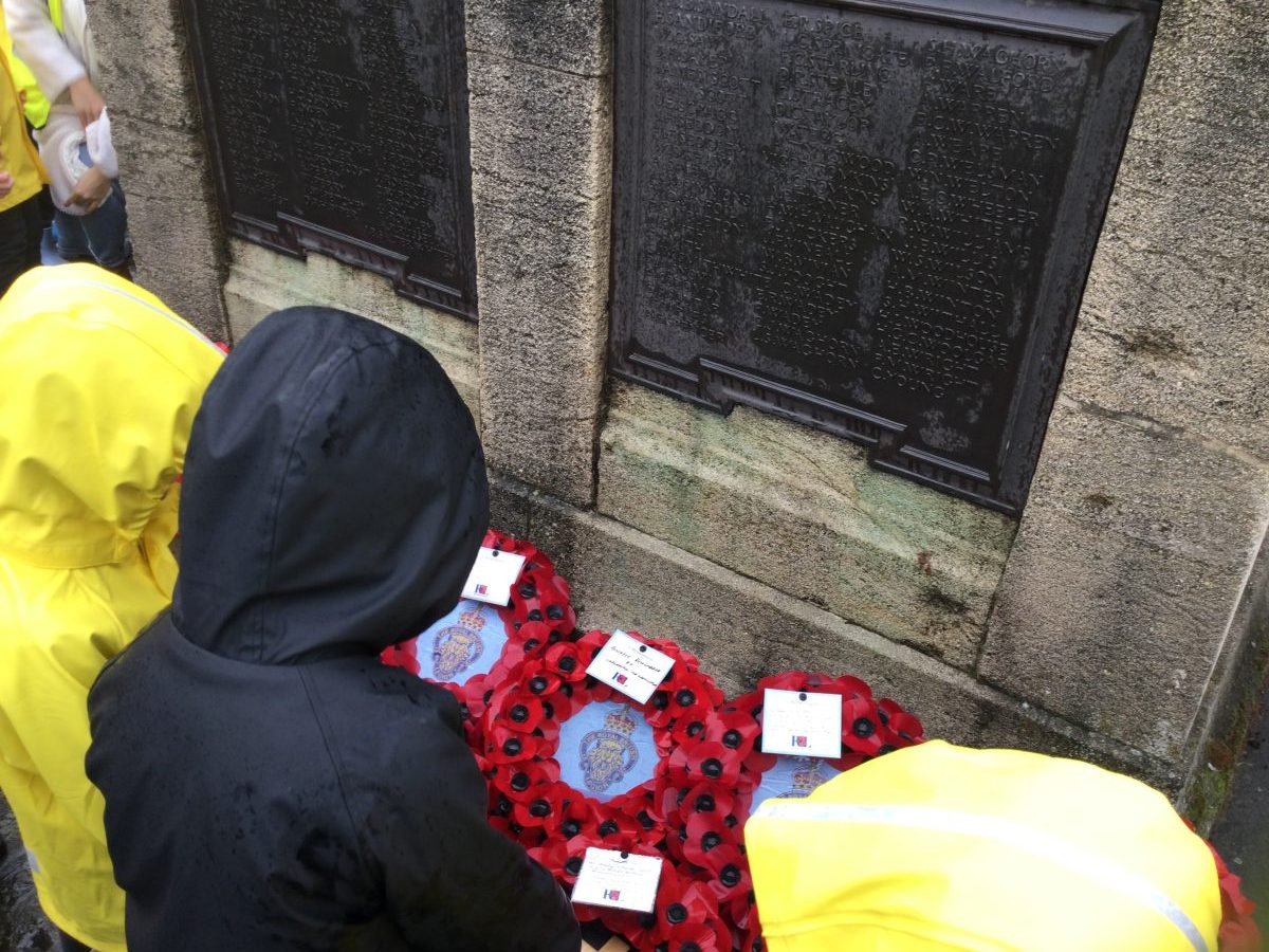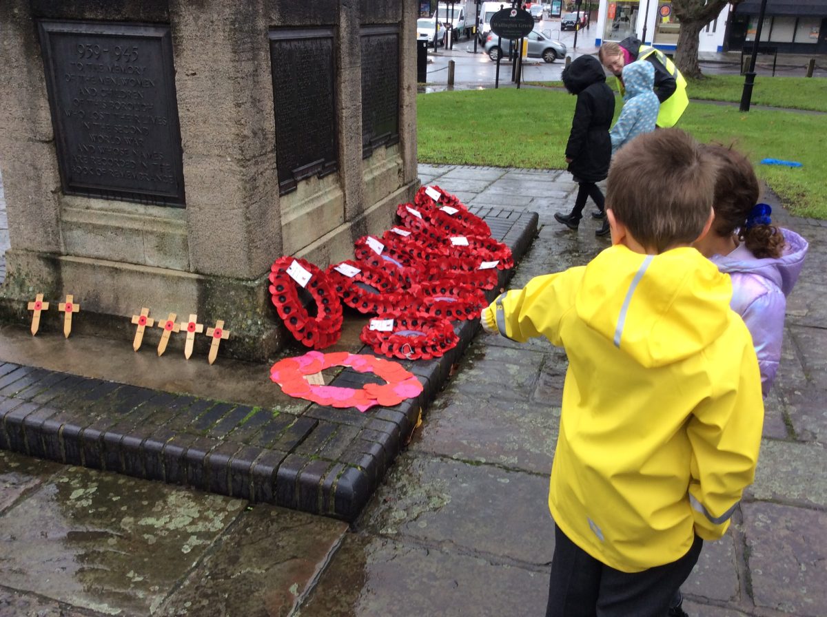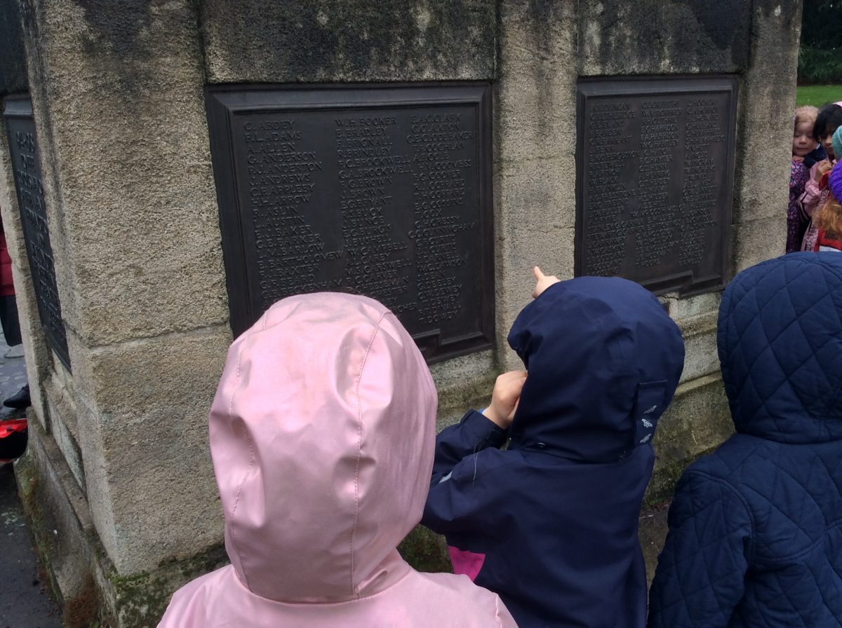 The children looked carefully at the symbols on the war memorial, the names of those who died in World War One and World War Two and who from the local community had laid wreathes. The children then laid wreaths that the children in Year 2 had made as part of their independent learning last week.